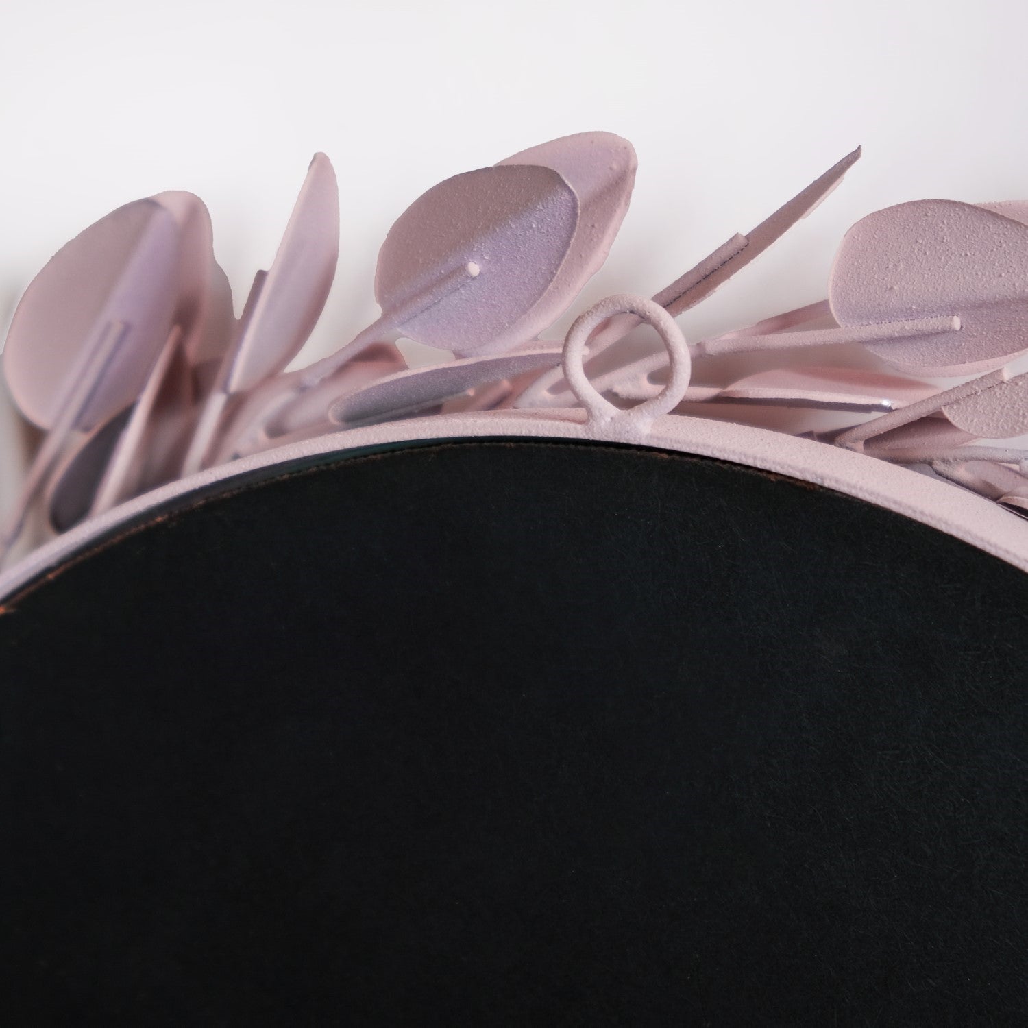 The leaves around the mirror are crafted from iron. This material ensures durability and allows for intricate detailing, while also providing a stable frame for the mirror.