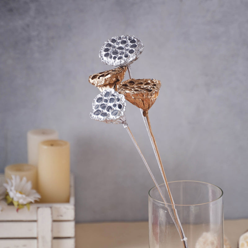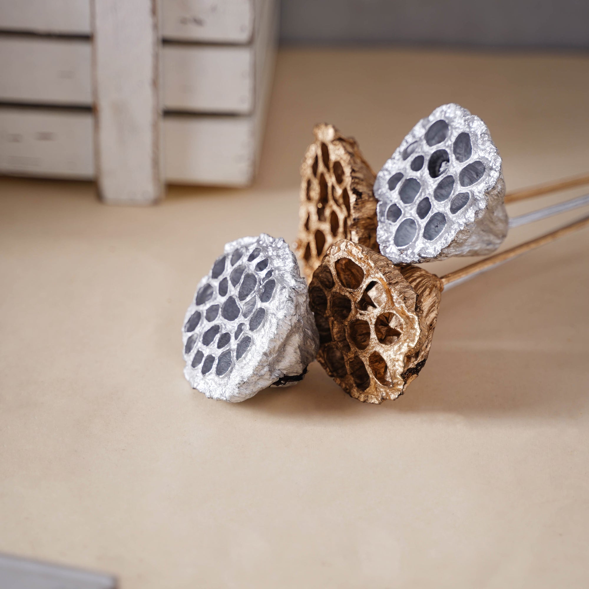 The dry textured lotus pod on a stem is a great decorative filler ornament meant for house décor, wedding celebrations, and flower and bouquet arrangements. Perfect for table centerpieces, floral arrangements, wreaths, garlands and DIY projects, the organic pods handpicked by local craftspersons will last for many seasons and will never go out of style. As the dried lotus pods are all completely organic and do not undergo any machine processing, the forms and colors may vary slightly but it is in this that their distinct charm is contained. The stemmed lotus pod has been carefully spray-painted with golden and silver hues to suit all decors.