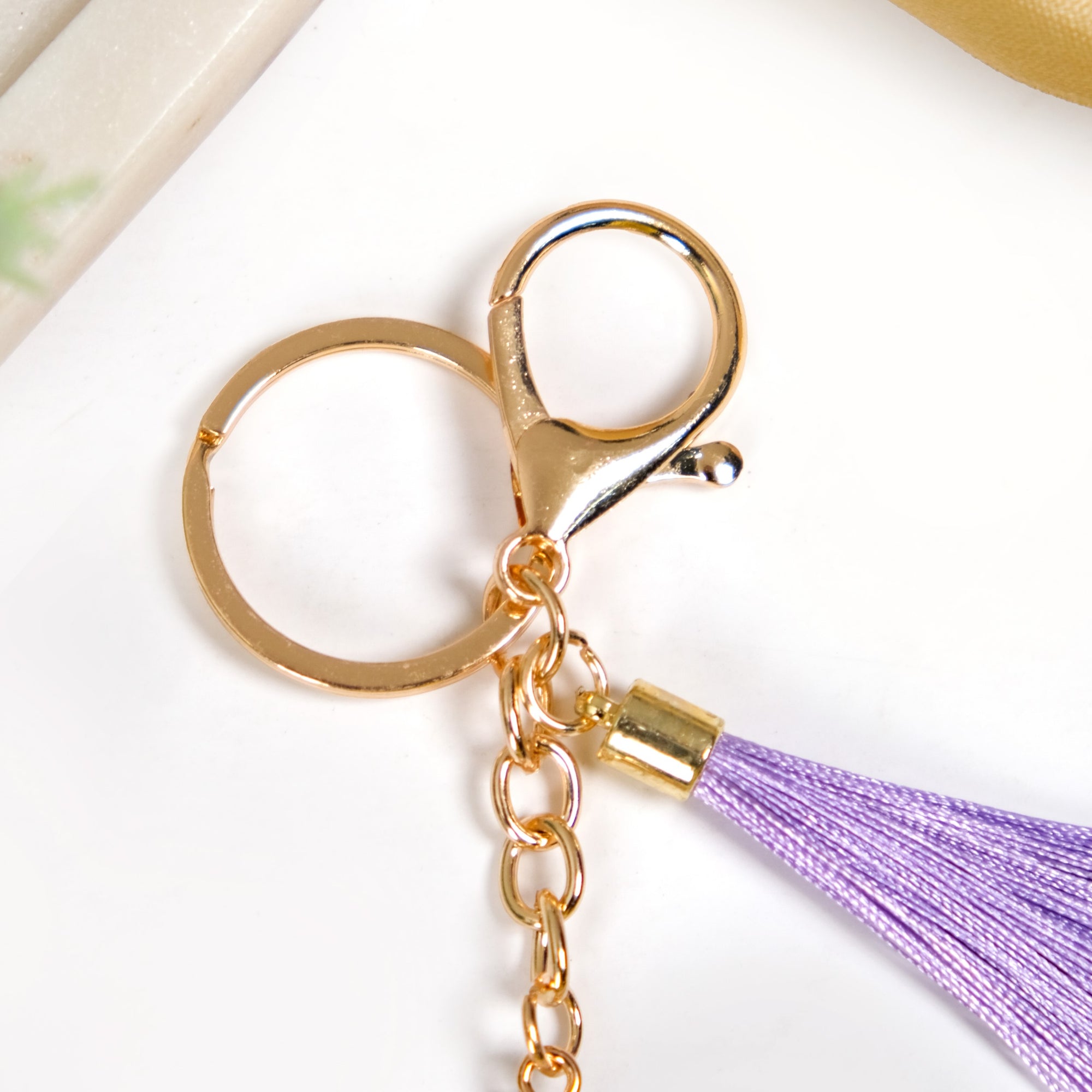 Experience the timeless charm of our alphabet "B" resin art keyring. It is made from durable resin that encases delicately pressed forget-me-not flowers (Myosotis), also known as scorpion grass, in soft lavender hues. Flecks of golden foil add a shimmering touch to the botanical keychain, while a chic satin tassel enhances its appeal.