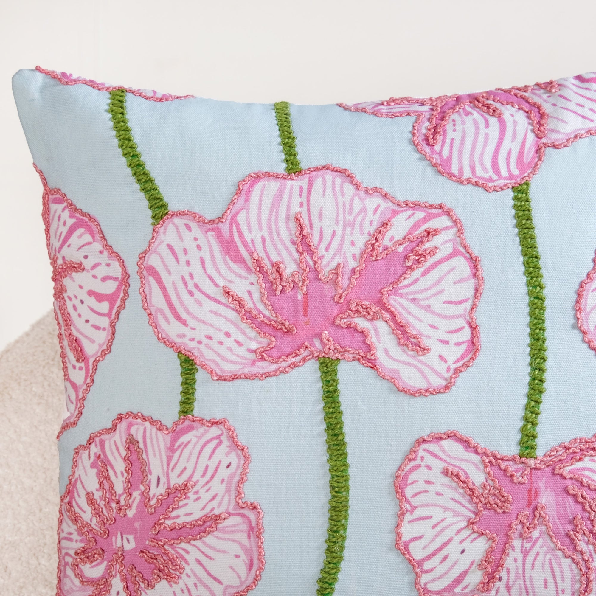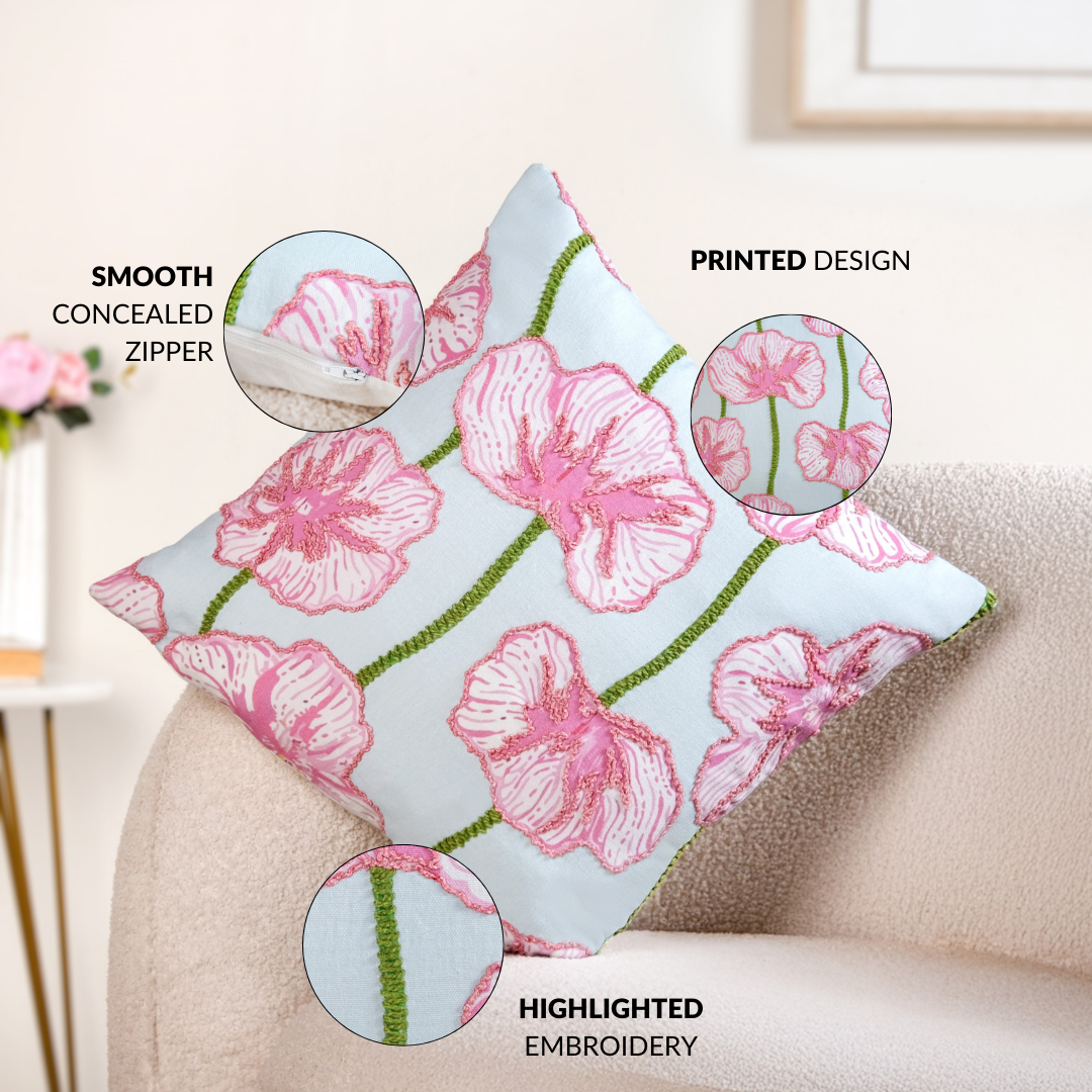 Design: Set against a soothing powder-blue base, this printed cushion cover features delicate highlight embroidery on pink florals. Vertical, green-stitched stems add structure, creating a balanced, garden-inspired composition. The plush embroidery gives the flowers a raised, artisanal look, while the subtle colour palette keeps the design calm.