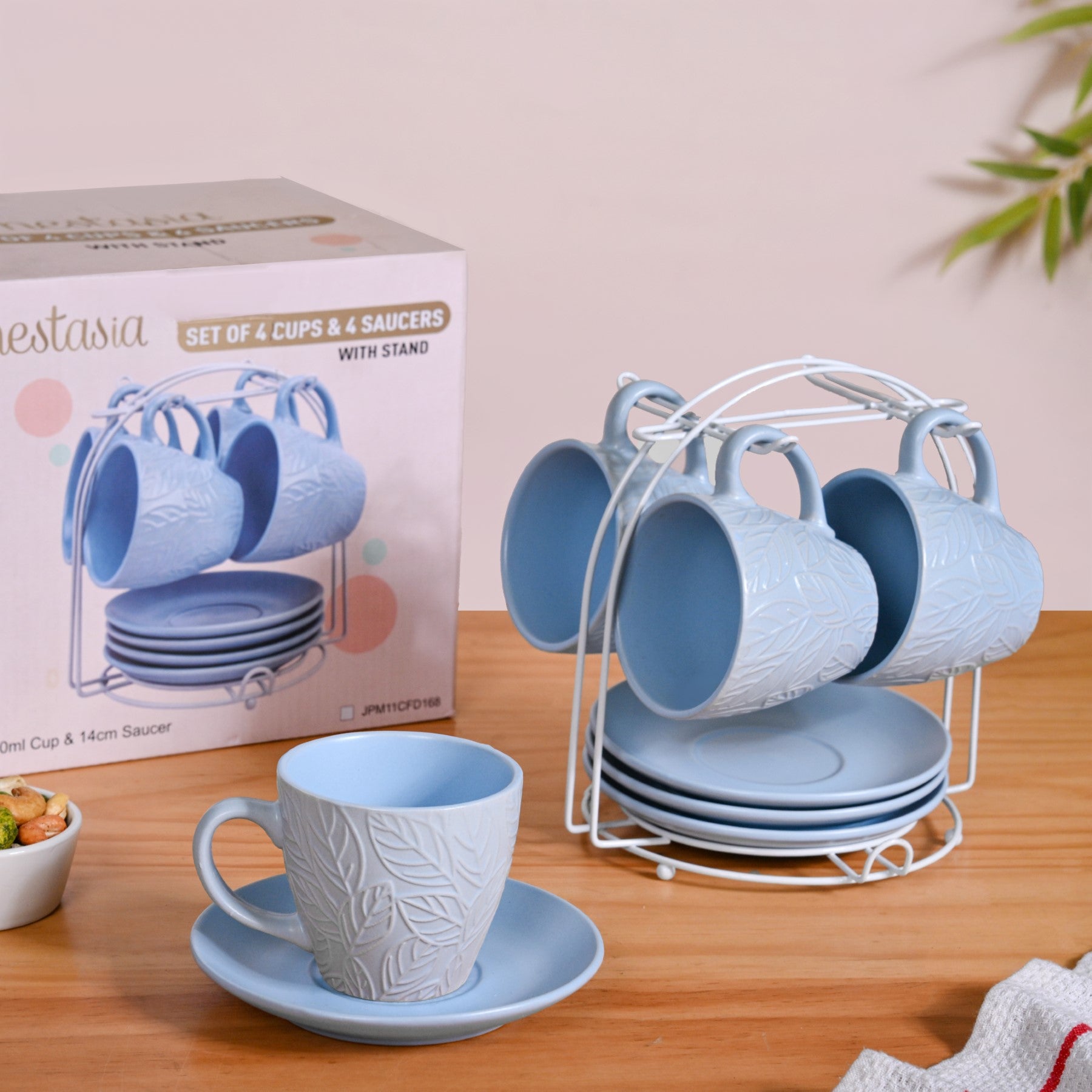 Soft Pastel Ceramic Tea Cup And Saucer Set For 4 With Stand 200ml |