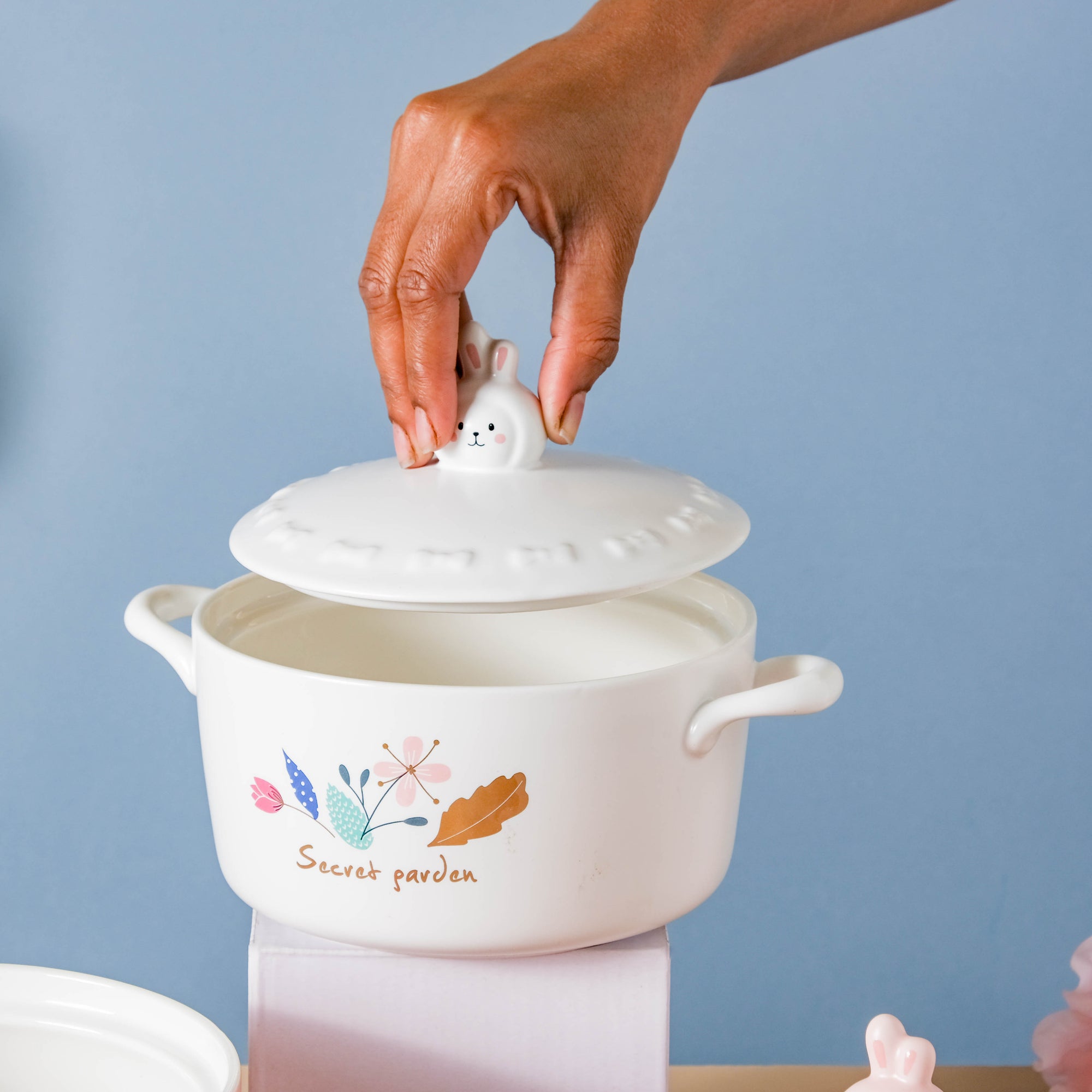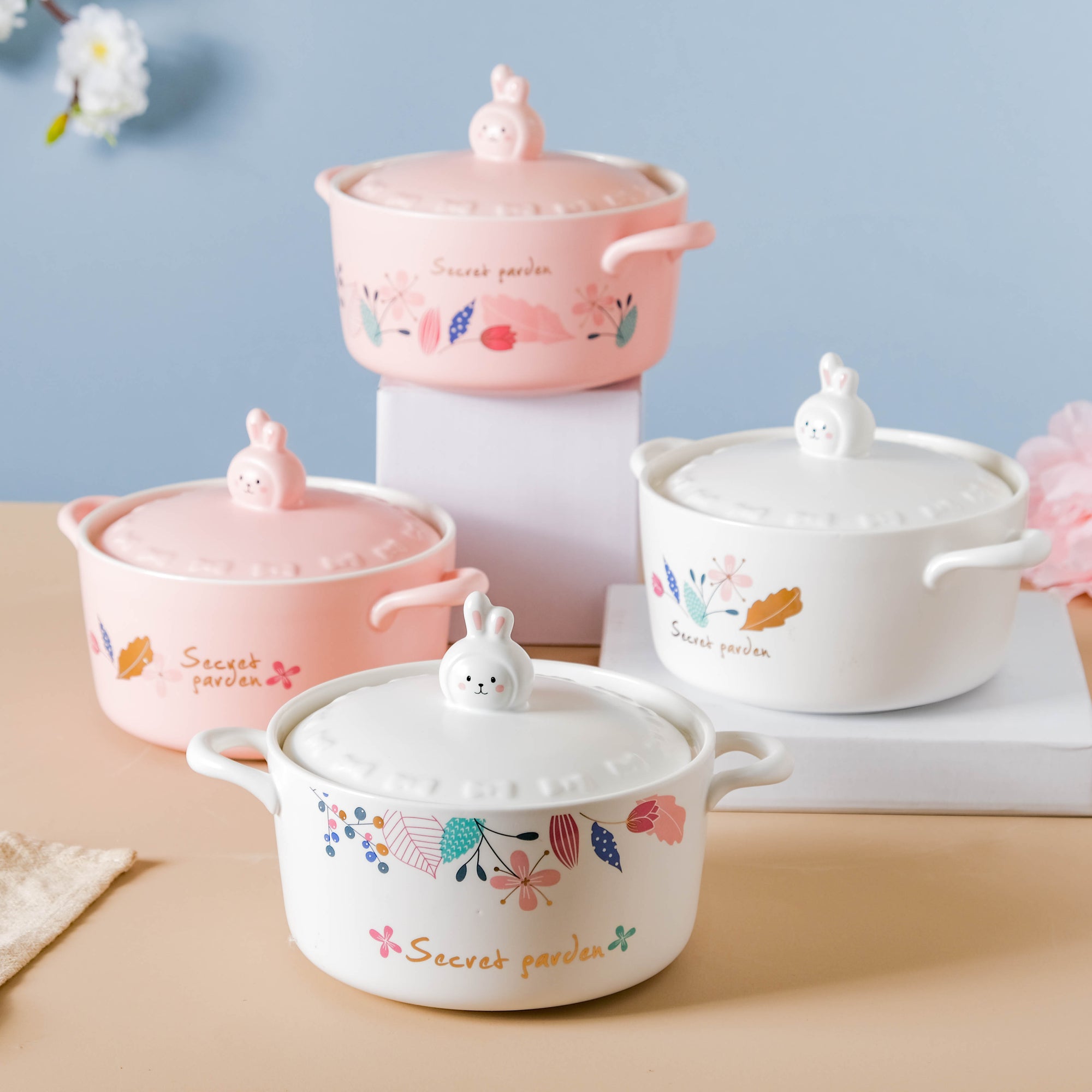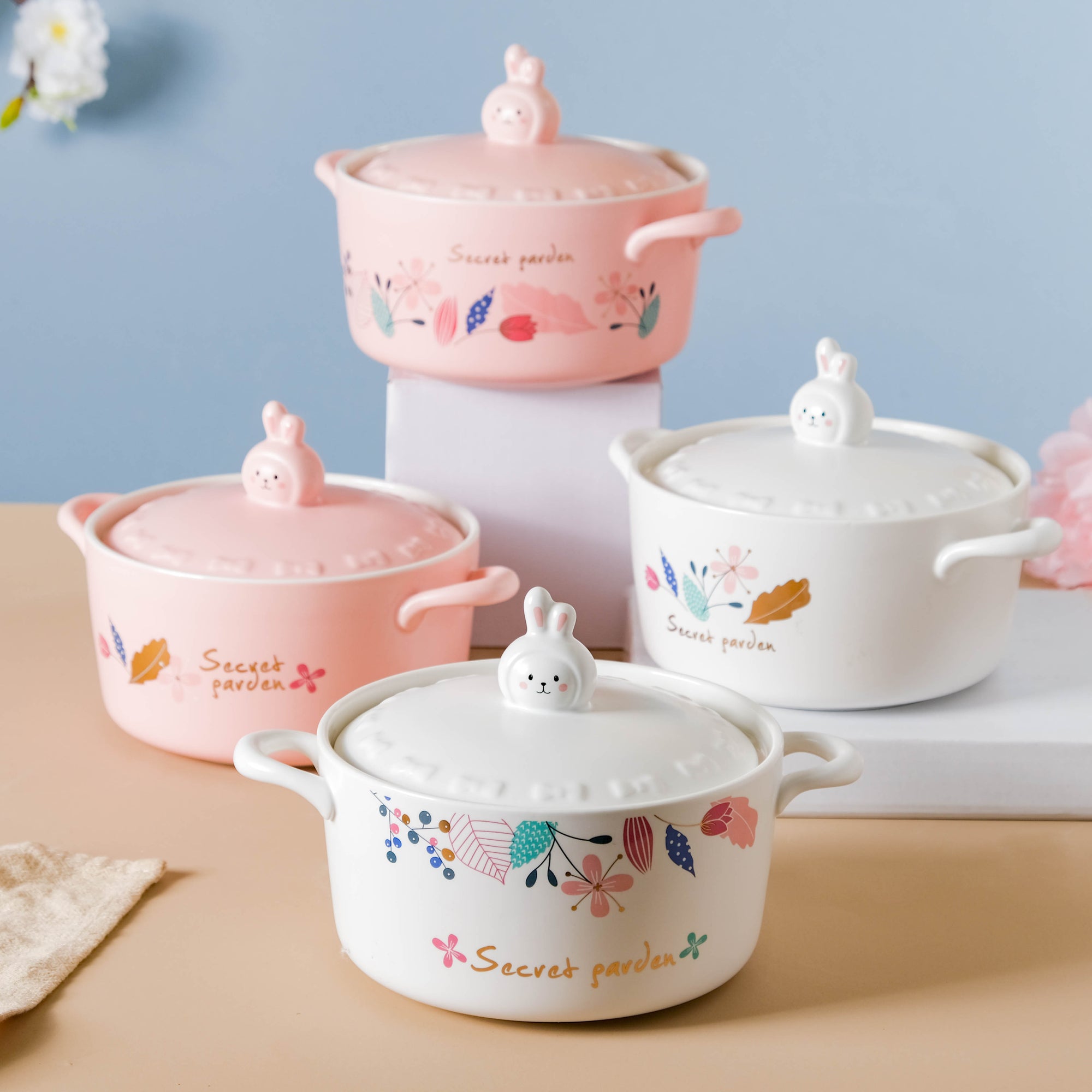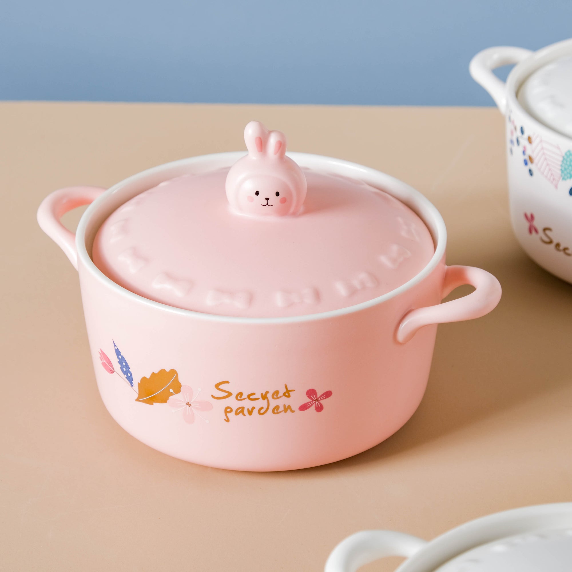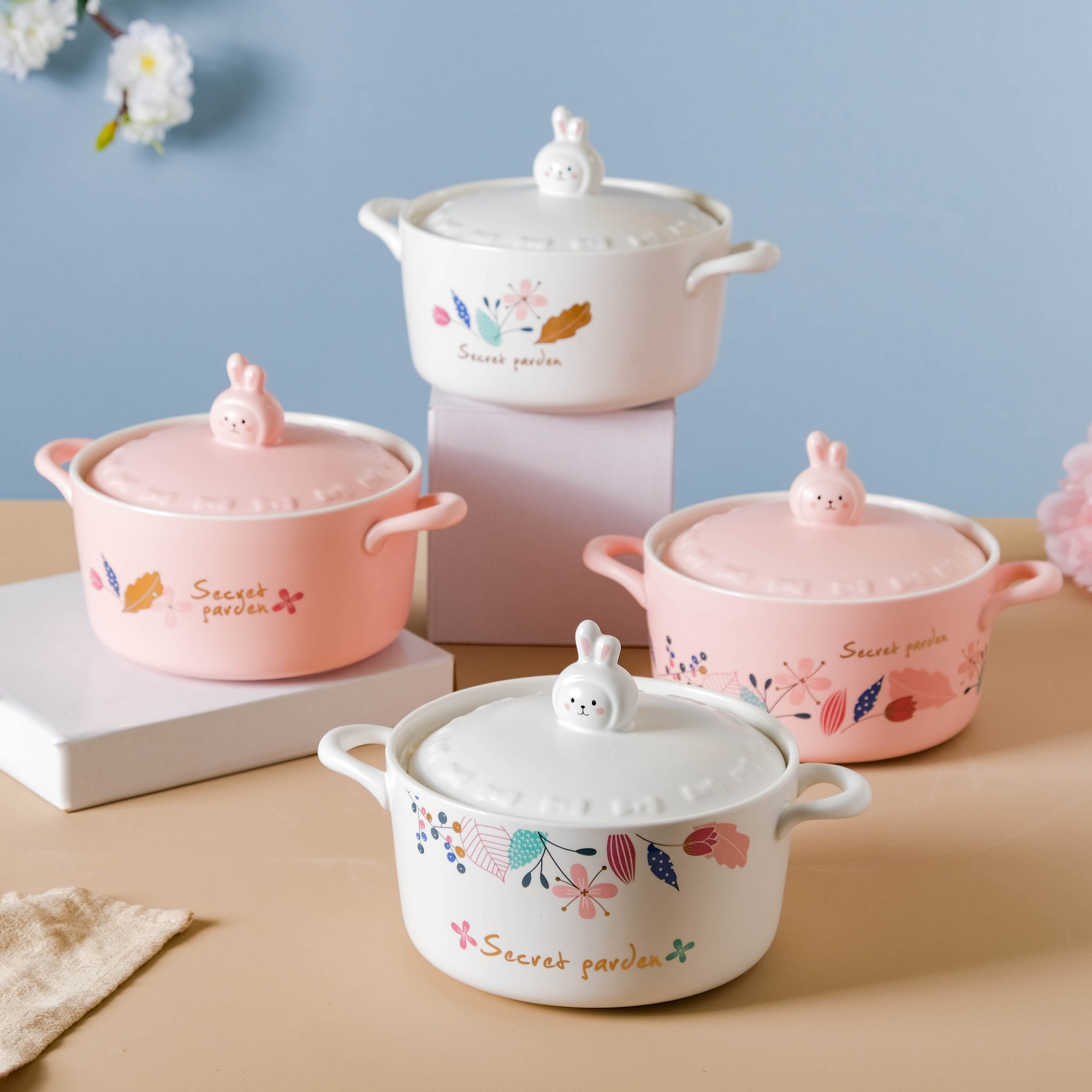 The lid of the ceramic bowl is ornamented with a cute bunny giving it a festive appearance. In the ceramic serving bowl, serve noodles, ramen, soup, or stew. Multi-hued flowers, leaves, and other beautiful motifs may be seen on the bowl's outside surface. The pastel pink and white cooking pots are a great way to upgrade the way one prepares one's food, be it any cuisine.