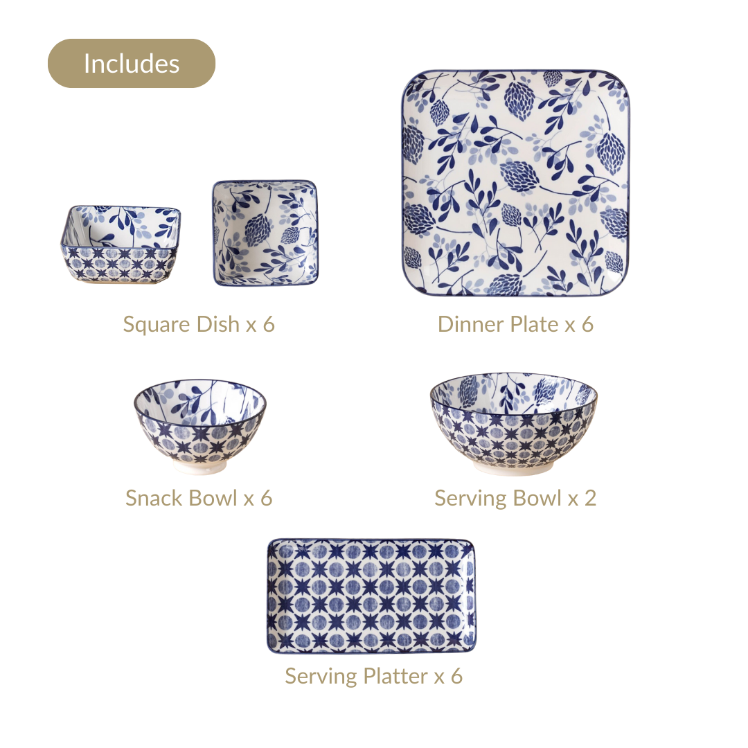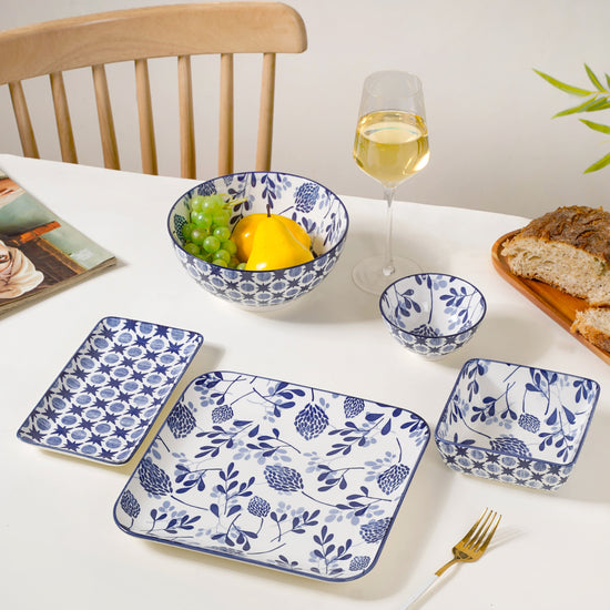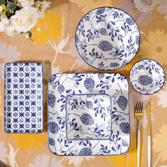 Unveil dining excellence with our Blue Blossom 26-piece ceramic dinner set. Expertly crafted from premium ceramic, this dinner set embodies quality and sustainability. Its microwave and dishwasher-safe properties ensure hassle-free dining. Adorned in captivating blue and white hues, embellished with intricate leafy, floral, and abstract patterns, it transforms any meal into a grand affair. Perfect for casual gatherings or special occasions, this 22-piece dinnerware set serves 6 diners at a time, elevating your table setting. Embrace the art of dining with this stunning dinner set and make every meal extraordinary.