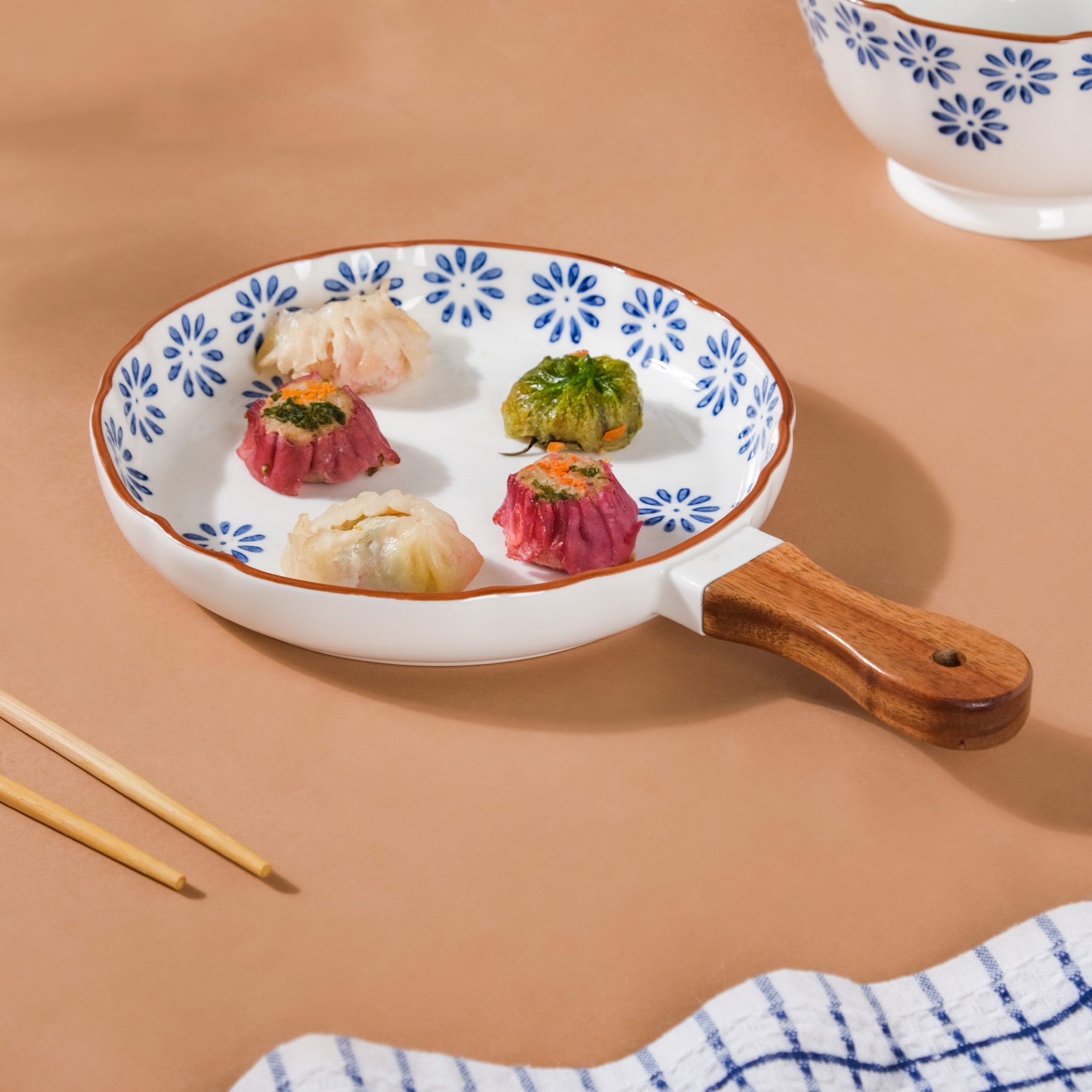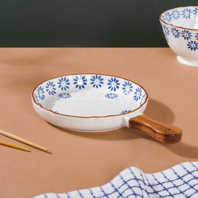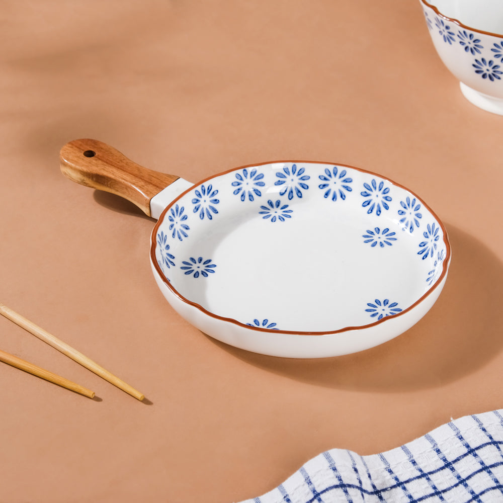 The floral patterned white ceramic plate with a wooden handle radiates sheer beauty and elegance. The white plate with a handle features a flower shower with every serving on the dining table, and a colorful hand-painted abstract pattern of flowers to enhance every tablescape. The bowl's wooden handle makes it easy to use. The exquisite ceramic bowl may be used to serve pancakes, crêpes, or saucy entrees.