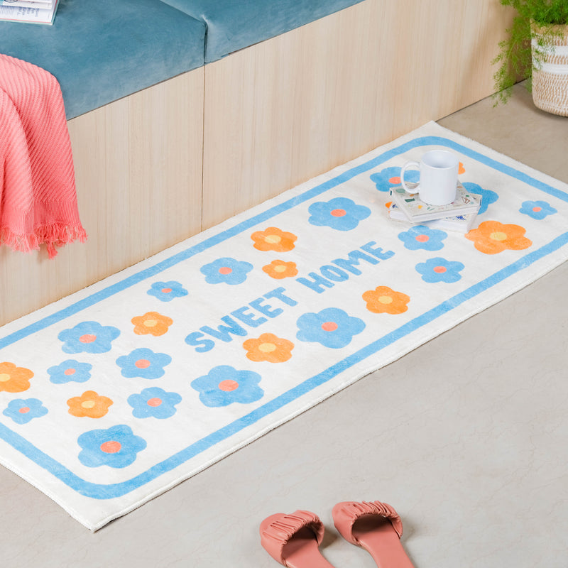 Nestip: For a colorful aesthetic on the floor, lay the blue flower carpet in the kids room.