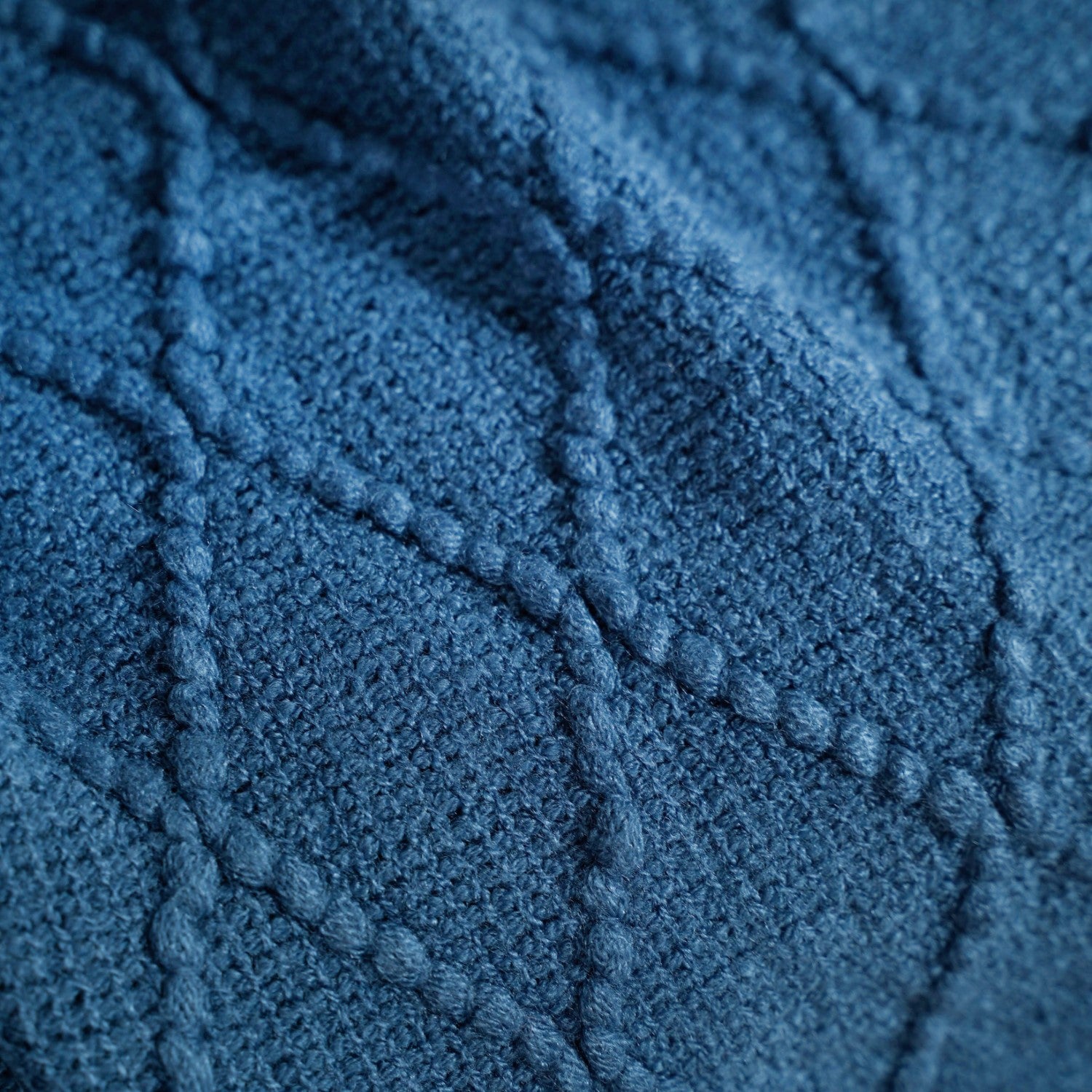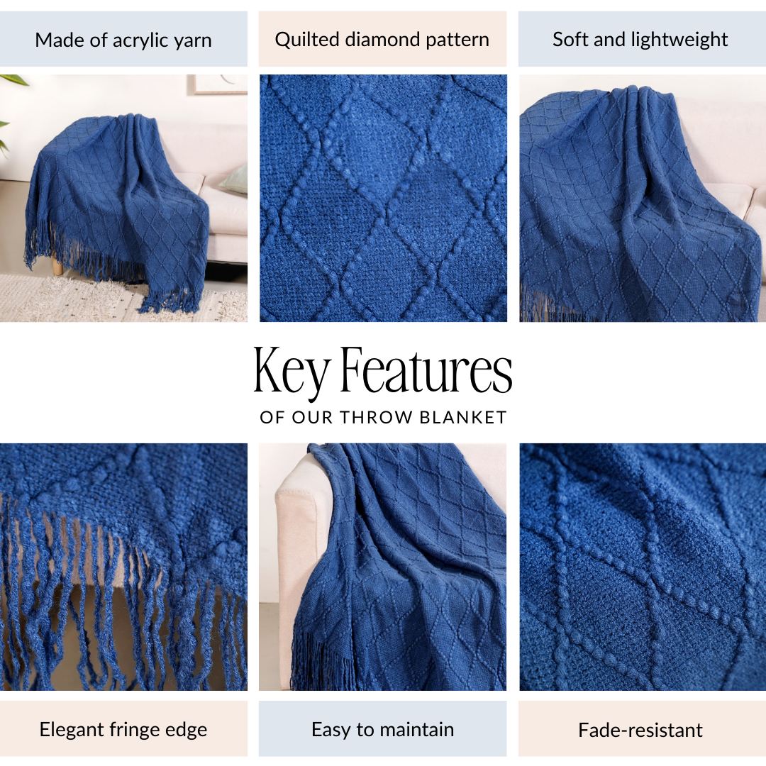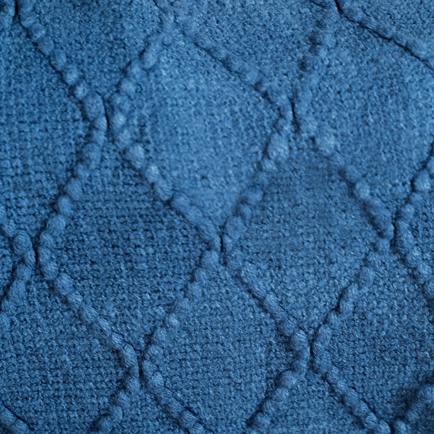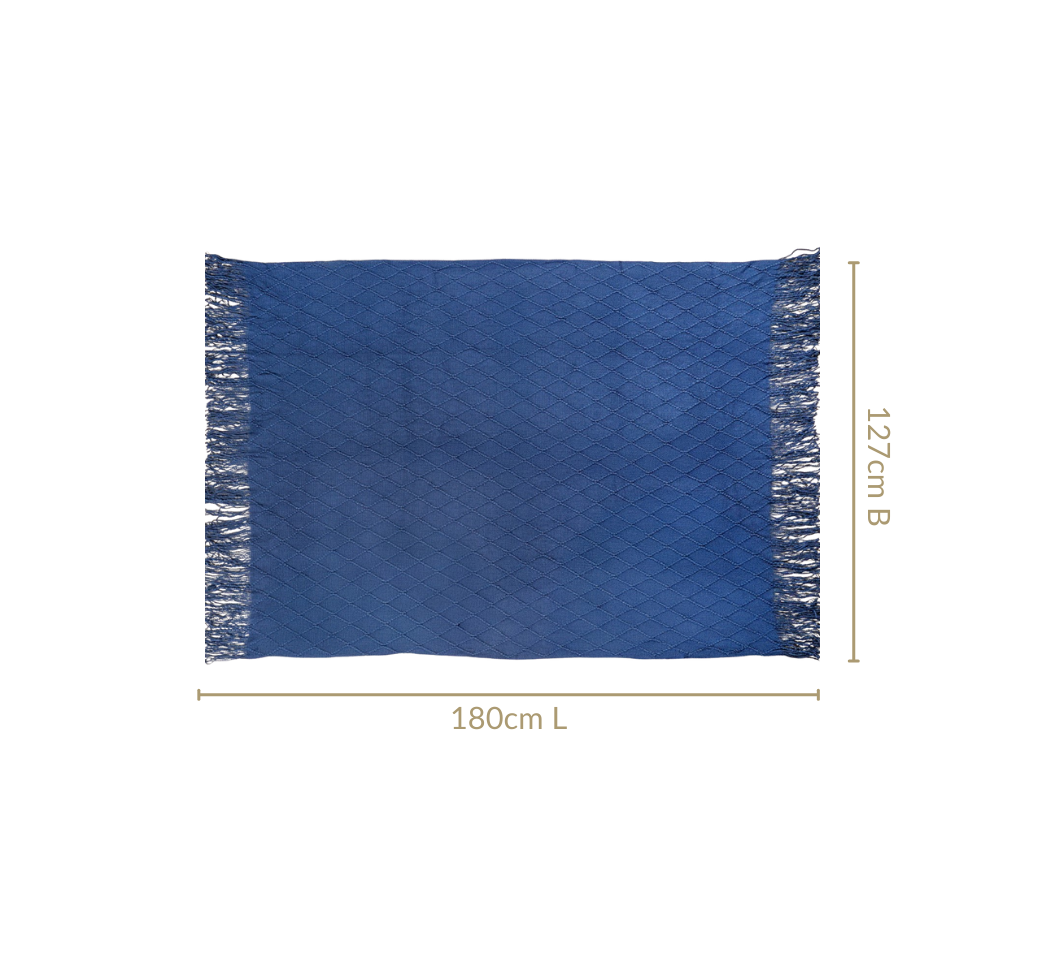 Design: Boasting a calming blue hue, this throw blanket is woven from high-quality acrylic yarn that feels wonderful to the touch. The design features a classic quilted diamond pattern with a raised, textured finish that adds depth to your decor. It is completed with long, flowing fringes along the edges for an elegant look.