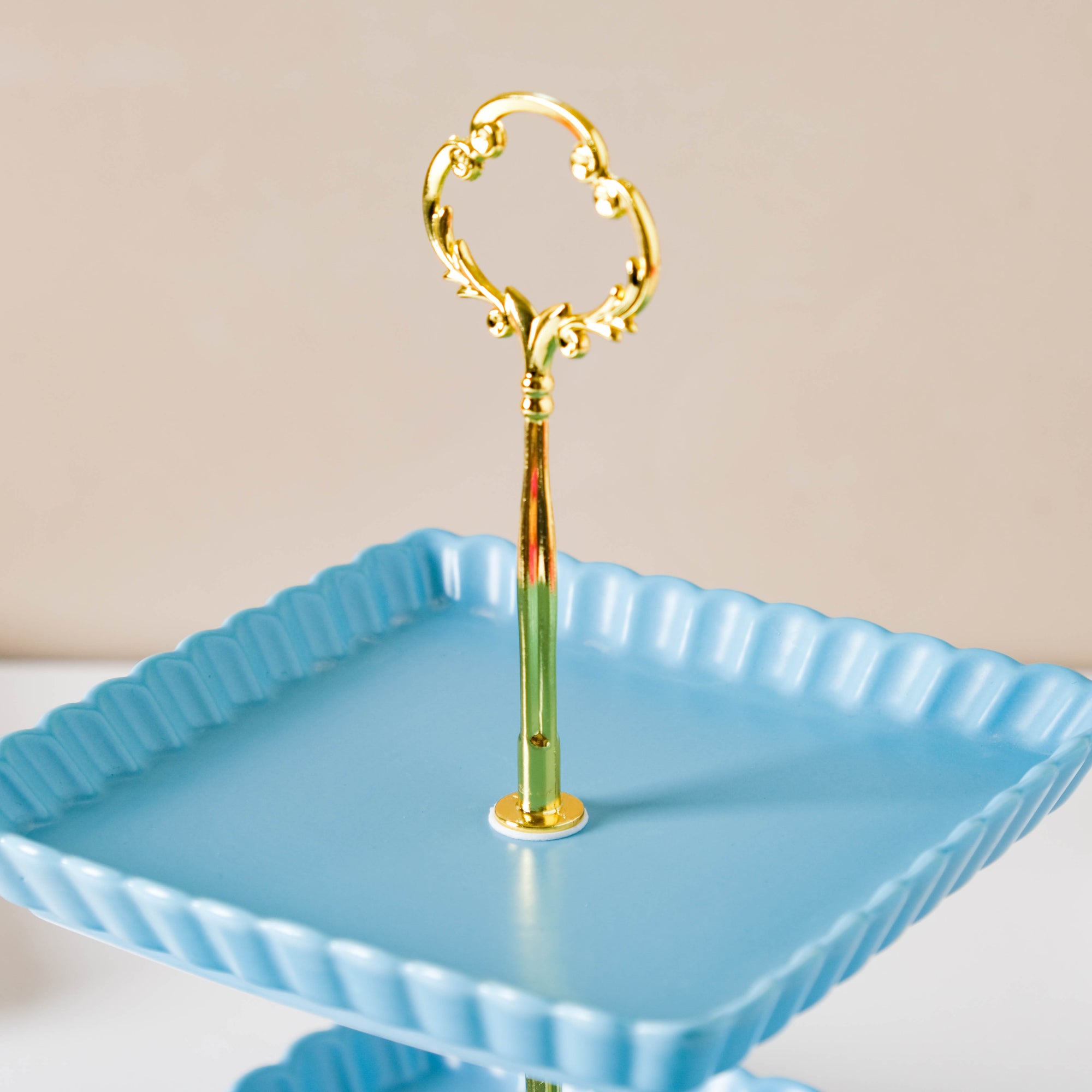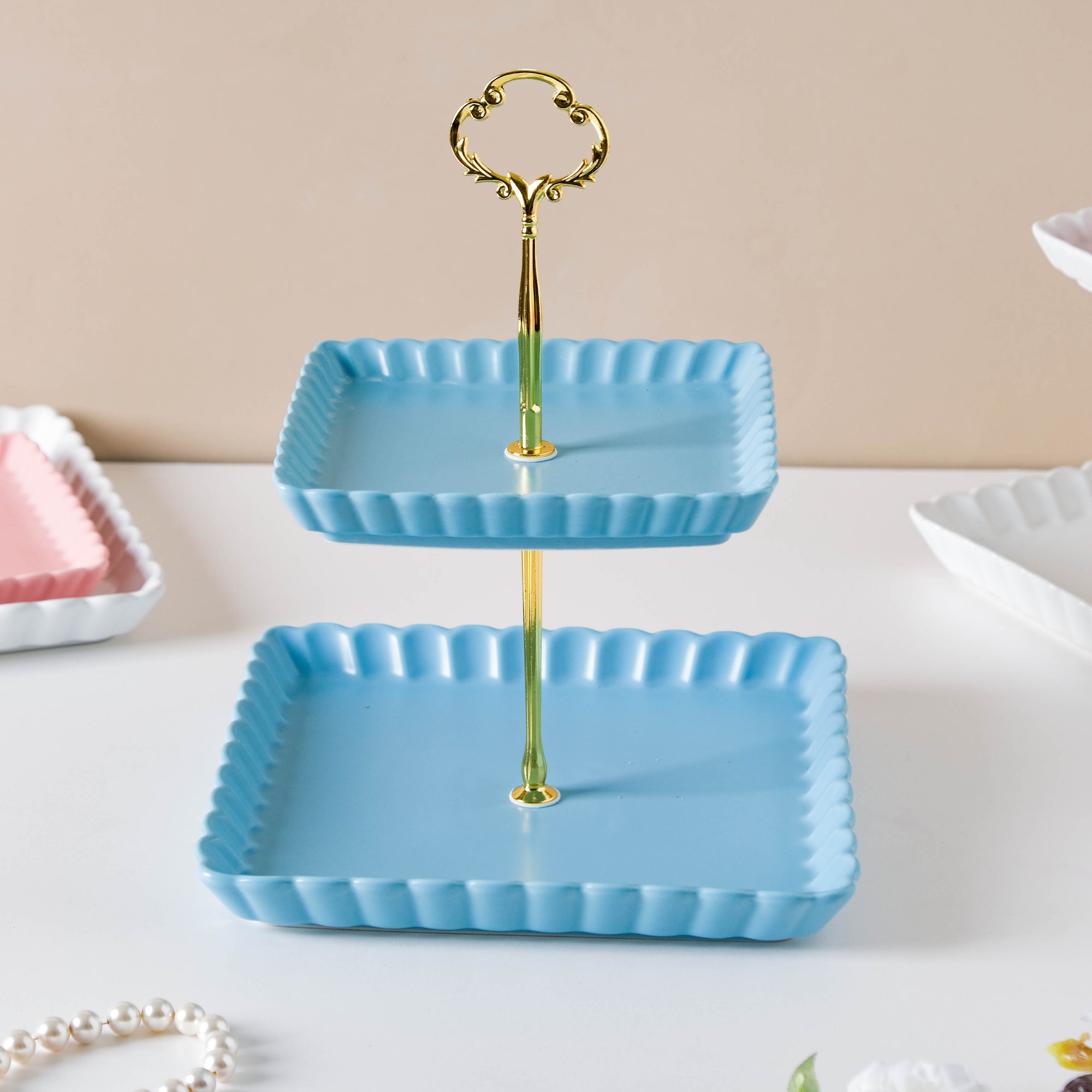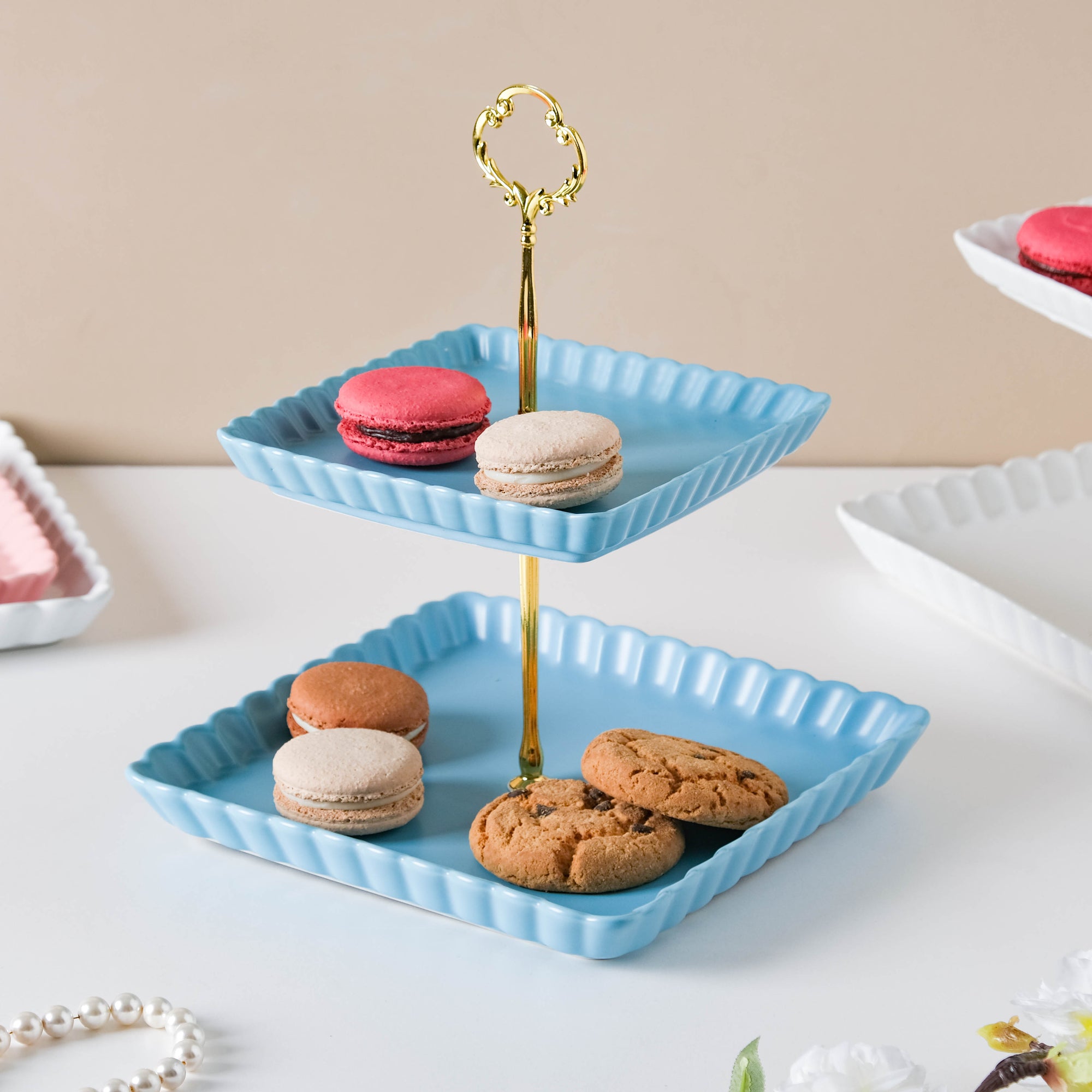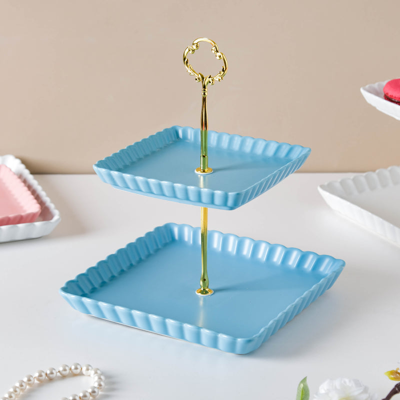 The two-tier light blue cupcake tray comes with two ceramic trays and one metal stand. There's a crown-like structure at the top of the metal stand which lends a royal touch to the cake tray. Serve candies, sweets, macaroons, and pastry on the trays at a brunch or house party. The plates without the stand are microwave and dishwasher safe. Nestip: The trays can be used for keeping trinkets and tiny essentials. Size: Small plate- 16cm side x 2.5cm H Large plate- 21cm side x 2.5cm H Total height- 27cm Color: Blue, gold Material: Ceramic, metal Products included: 2-tier snack stand Style: BRC88C199