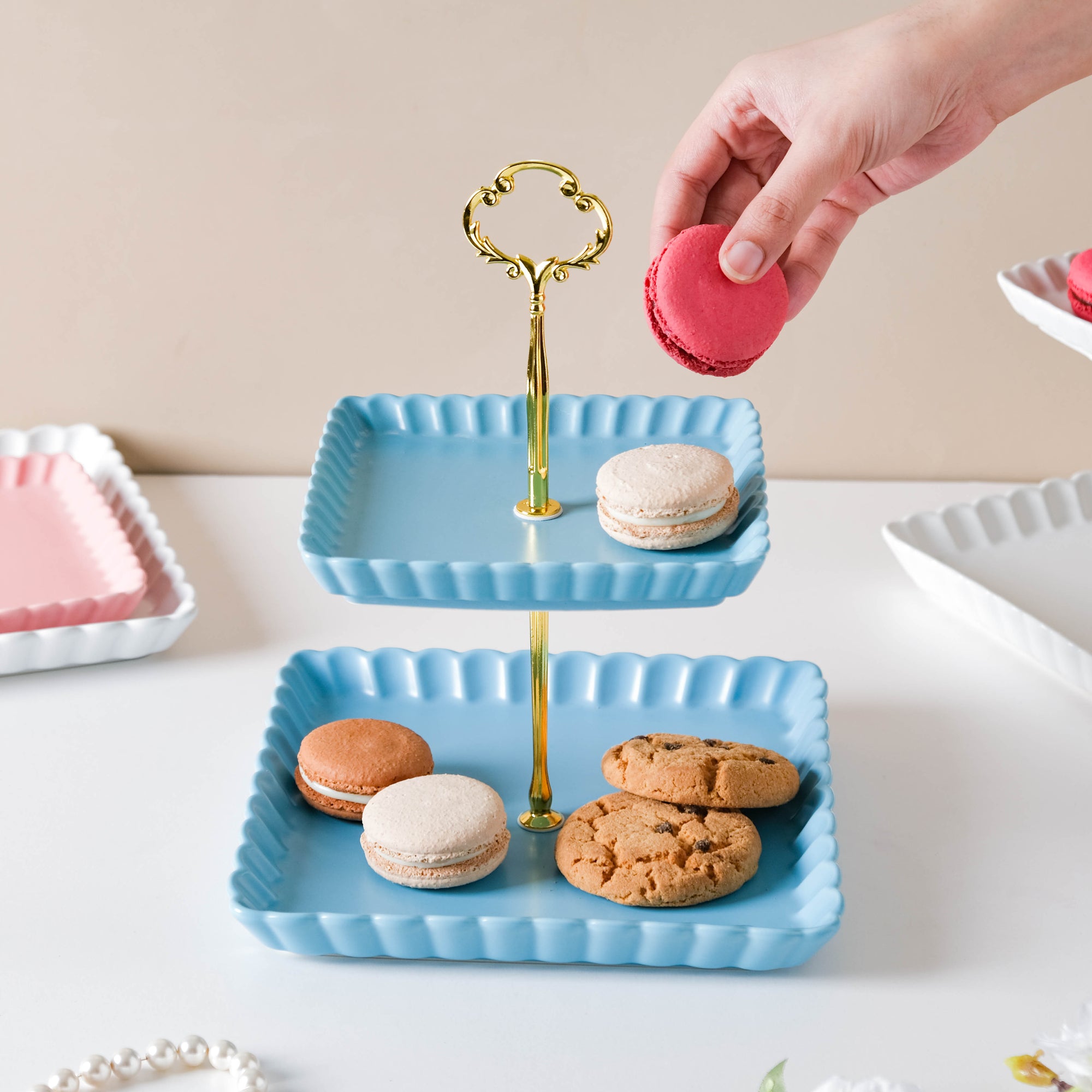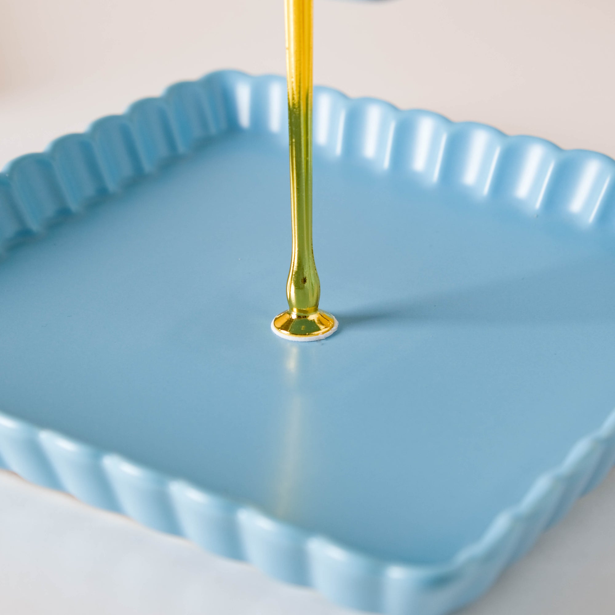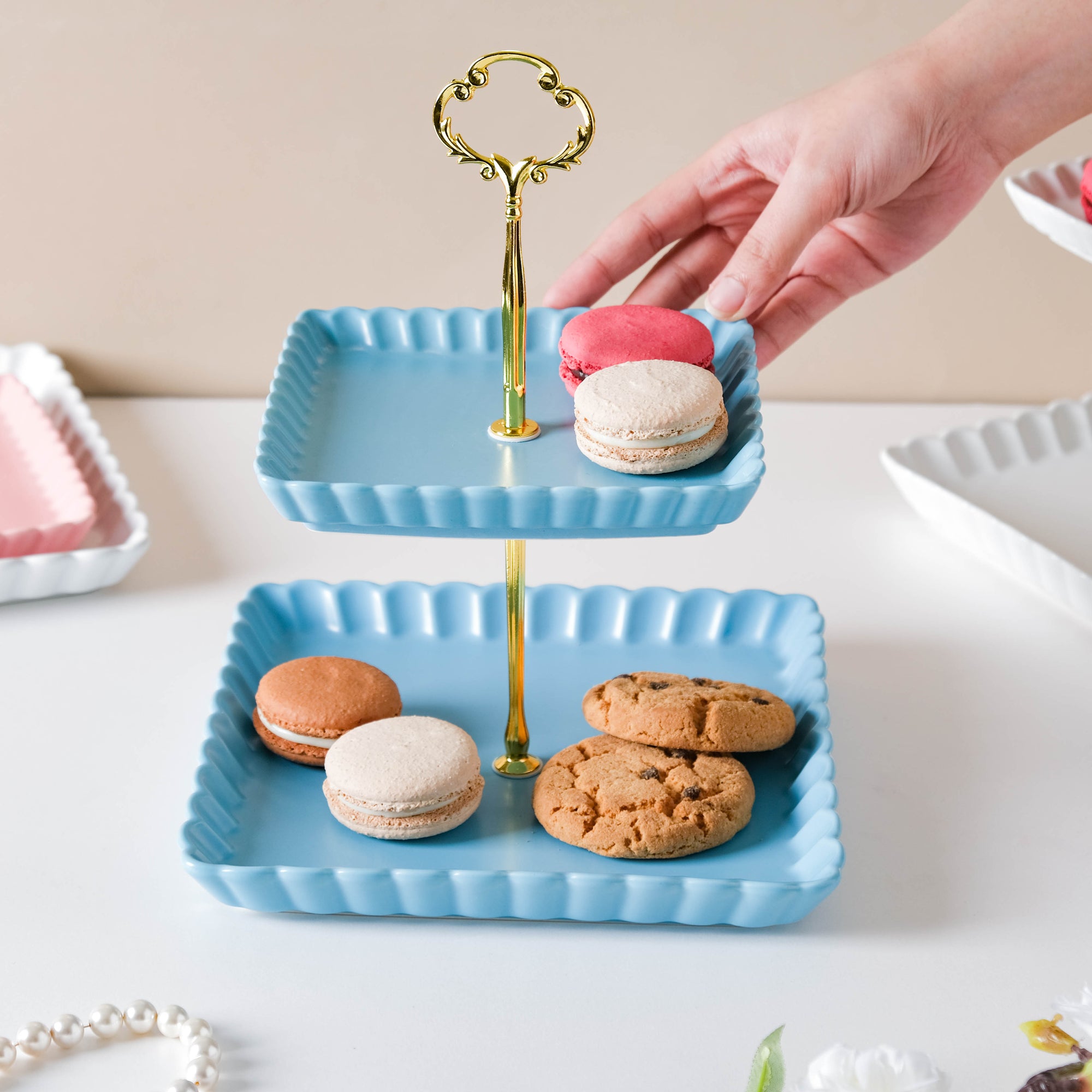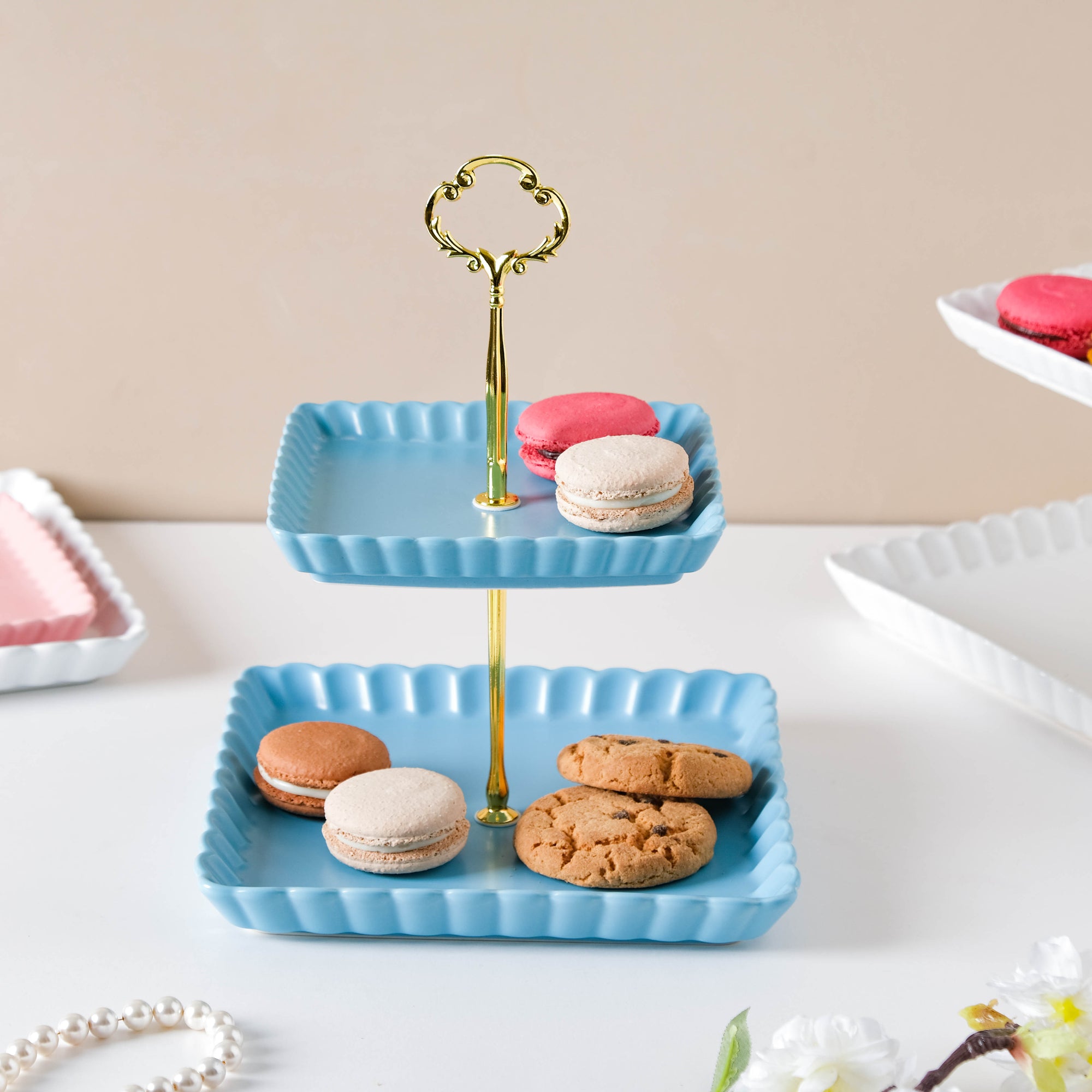 The two-tier light blue cupcake tray comes with two ceramic trays and one metal stand. There's a crown-like structure at the top of the metal stand which lends a royal touch to the cake tray. Serve candies, sweets, macaroons, and pastry on the trays at a brunch or house party. The plates without the stand are microwave and dishwasher safe. Nestip: The trays can be used for keeping trinkets and tiny essentials. Size: Small plate- 16cm side x 2.5cm H Large plate- 21cm side x 2.5cm H Total height- 27cm Color: Blue, gold Material: Ceramic, metal Products included: 2-tier snack stand Style: BRC88C199