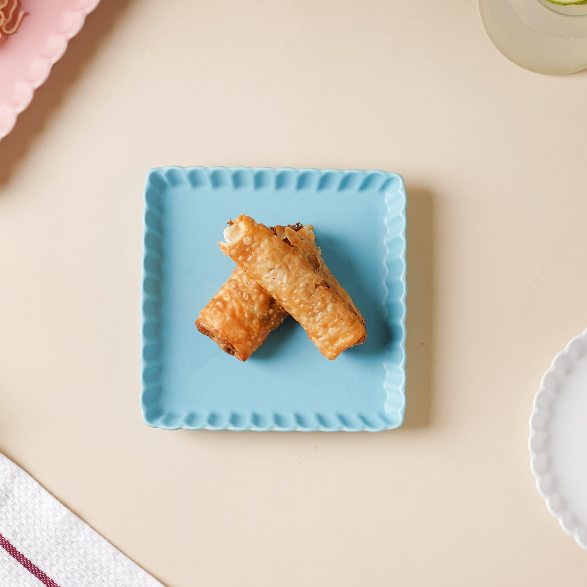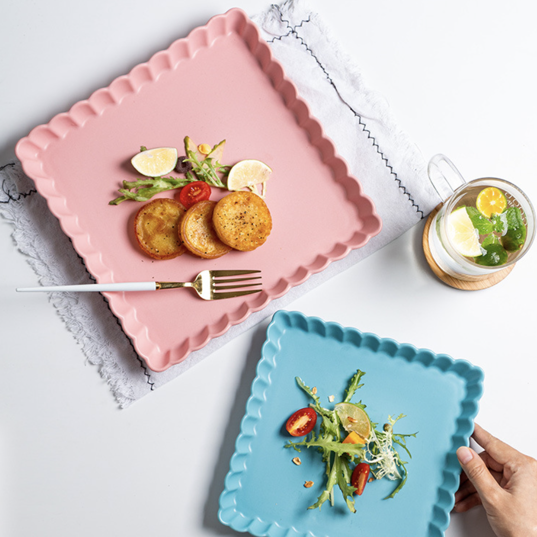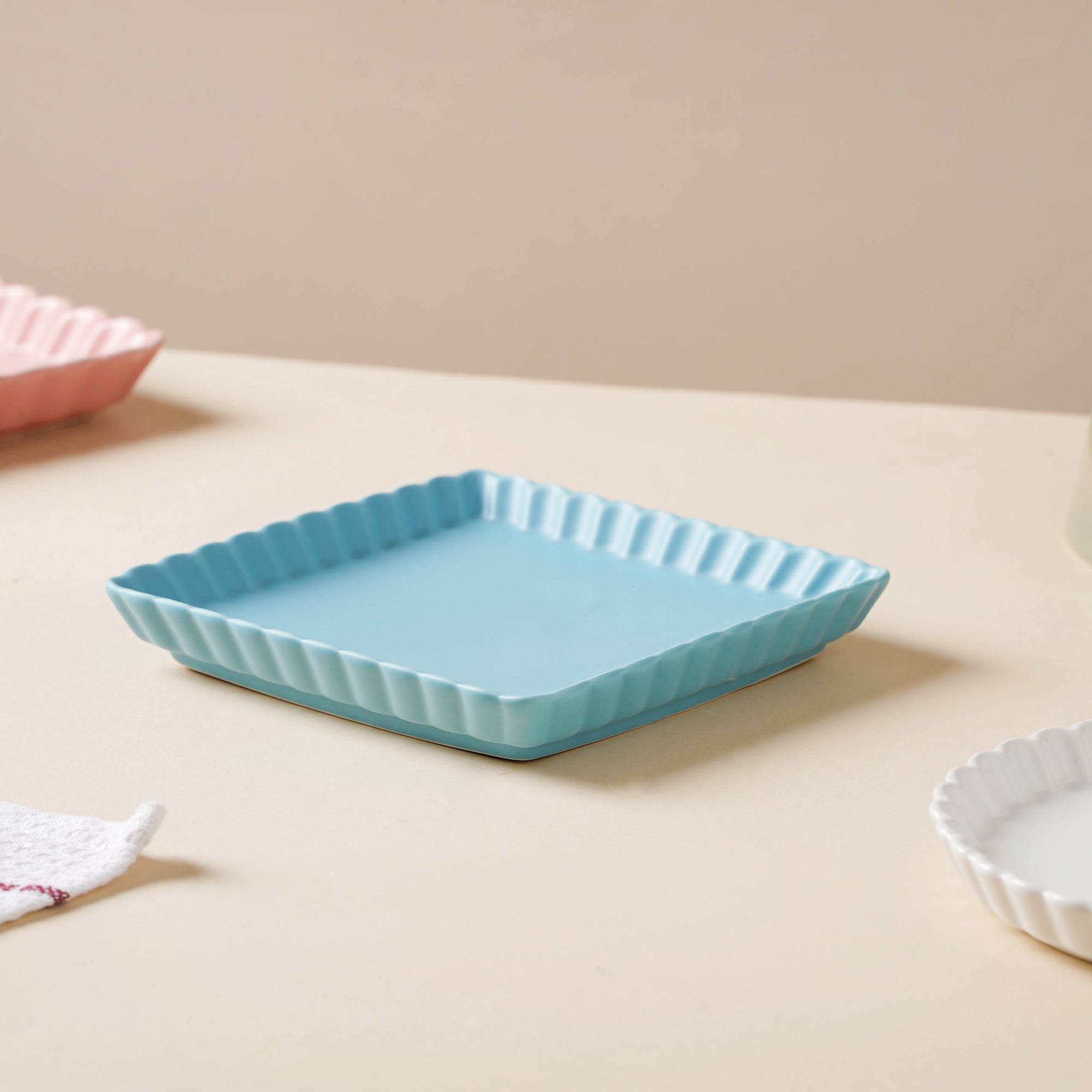 Serve homemade appetizers to guests on this gorgeous square-shaped ceramic platter and let their eyes fall into the eye-catching design. The elegant cyan color with a combination of the wavy raised rim elevates the design aesthetics to a new level. The platter is made of ceramic and may be used to serve both bread and appetizers to guests.