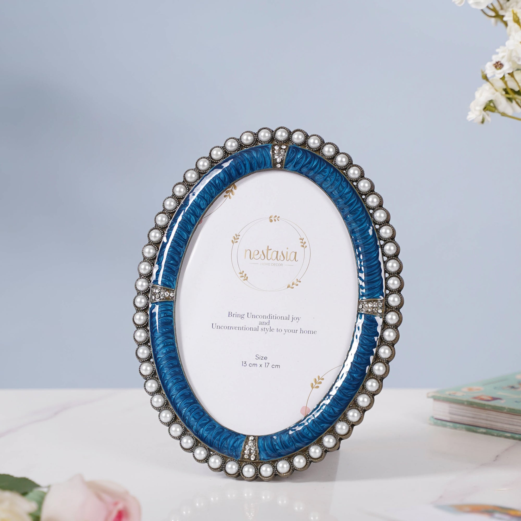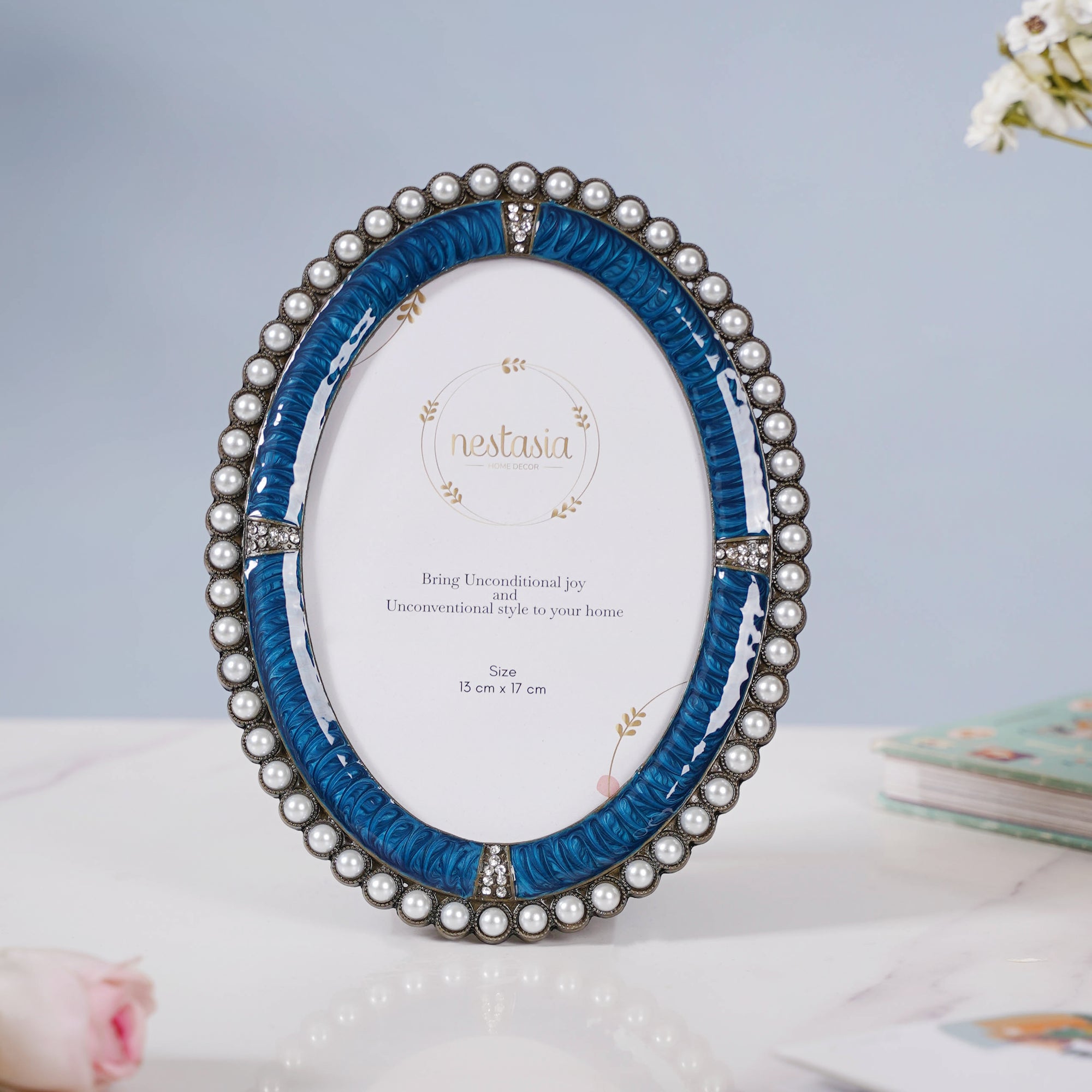 The circular photo frame can help house all such precious photographs. A thick, blue border surrounds the center image space of the frame. Silver beads, too, occur on each side, adding to the aesthetic appeal of the picture frame.