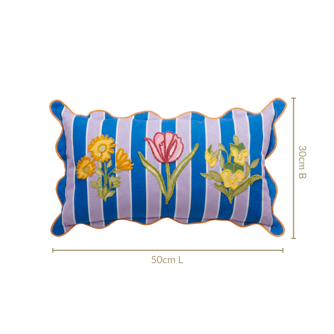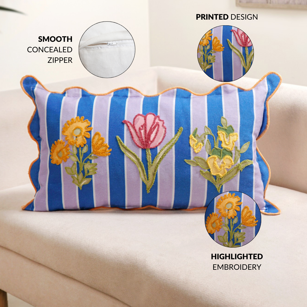 Design: 100% pure cotton forms the base of this rectangular decorative cushion cover, finished with floral embroidery over soft blue and lavender stripes. Scalloped border shapes the silhouette, while neat stitching, a concealed back zipper, and a plain white cotton back keep it practical.