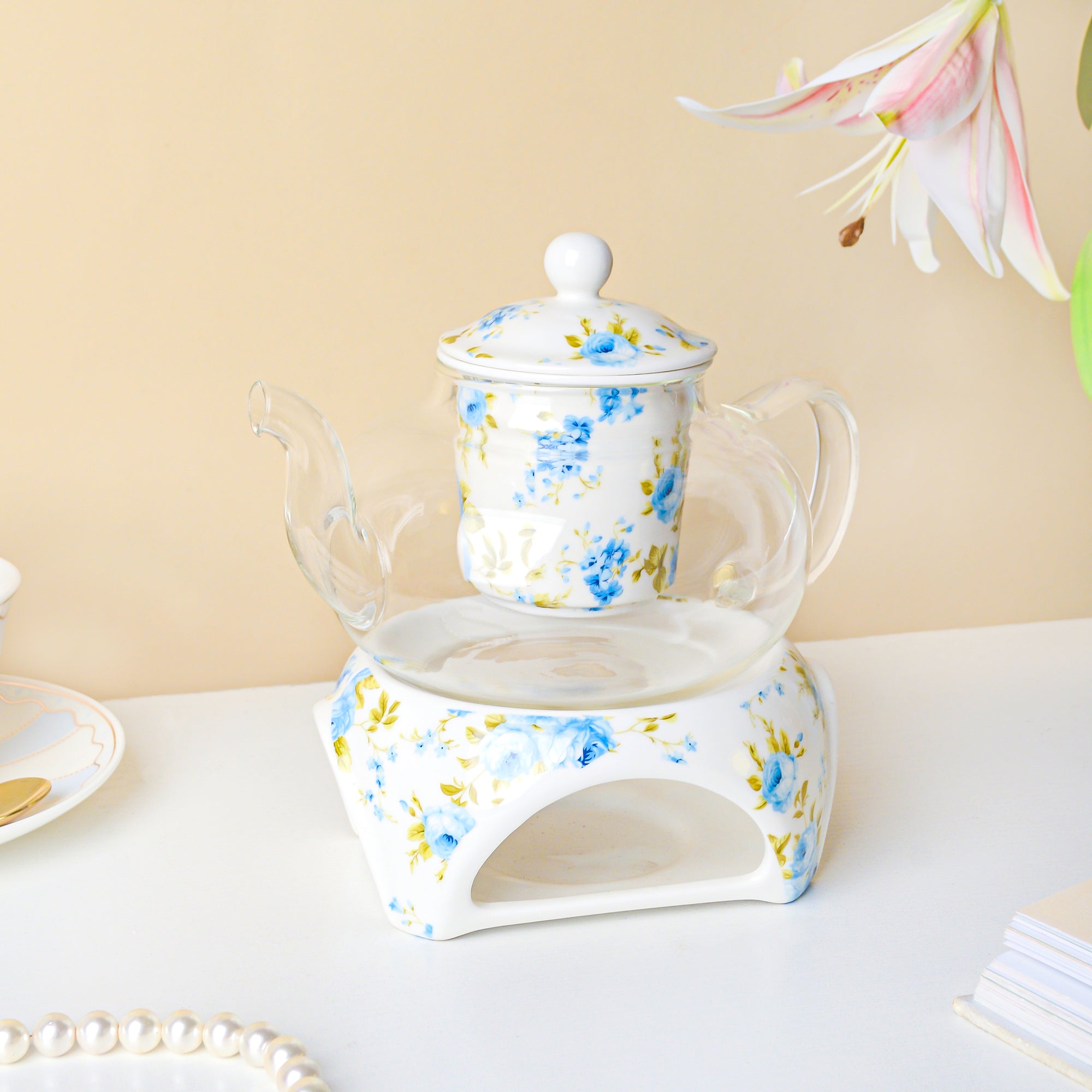 The stylish glass teapot comes with a ceramic tea warmer and an infuser with a lid. The c-shaped handle on the glass kettle makes pouring of beverages easier while serving. Bright blue floral motifs adorn the surface of the ceramic infuser and the tea warmer, that sits at the bottom of the transparent teapot. The ceramic warmer helps in retaining the warmth of the tea or coffee for a longer period of time. Brew tea leaves or coffee in the glass teapot and serve it hot to guests during family gatherings and social functions.