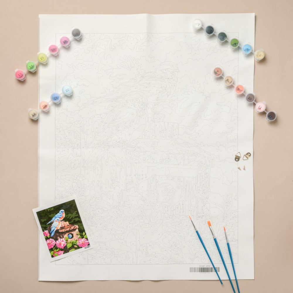 Kit includes: - 1 cloth canvas - 3 paint brushes - 22 acrylic colours - 1 set of 2 metal screws for mounting the painting - 1 reference image of completed painting