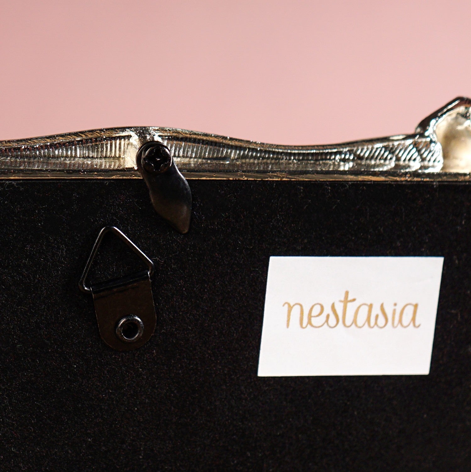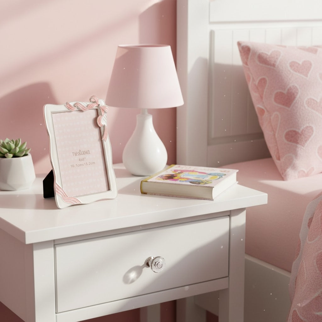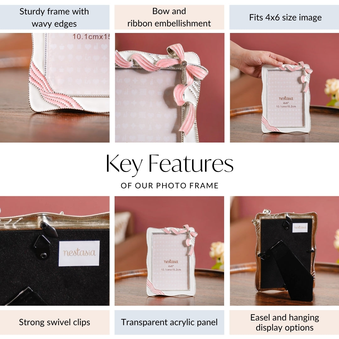 Design: This aesthetic frame features silver wavy edges and a playful pink bow and ribbon embellishment. The elegant details and sleek rectangular shape create a captivating border for your photo. Your image is perfectly preserved behind a crystal clear acrylic frame, ensuring optimal clarity and protection while highlighting the frame's overall delicate appeal. This frame is perfect for displaying 4x6" photos.