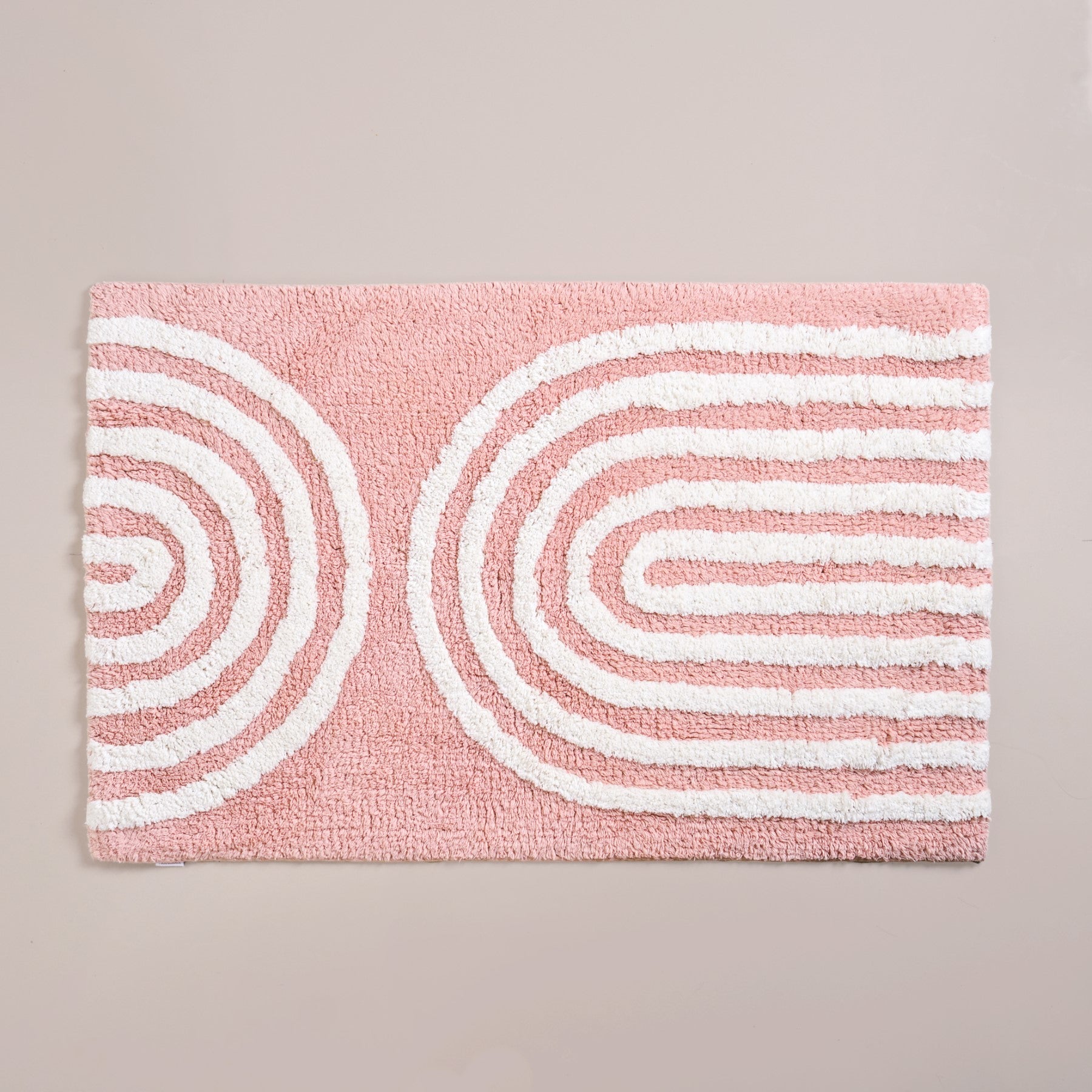 Design: Style your everyday spaces with this chic, tufted floor mat that blends function with style. Crafted from soft cotton, it offers a cosy, cushioned feel underfoot, ideal for bedrooms, entryways, or bathrooms. Featuring a soft mauve base with raised concentric arches in ivory-white, the pattern creates a modern geometric effect. The asymmetrical layout adds dimension without overwhelming the space, making it suitable for minimal, Scandinavian, or contemporary interiors.