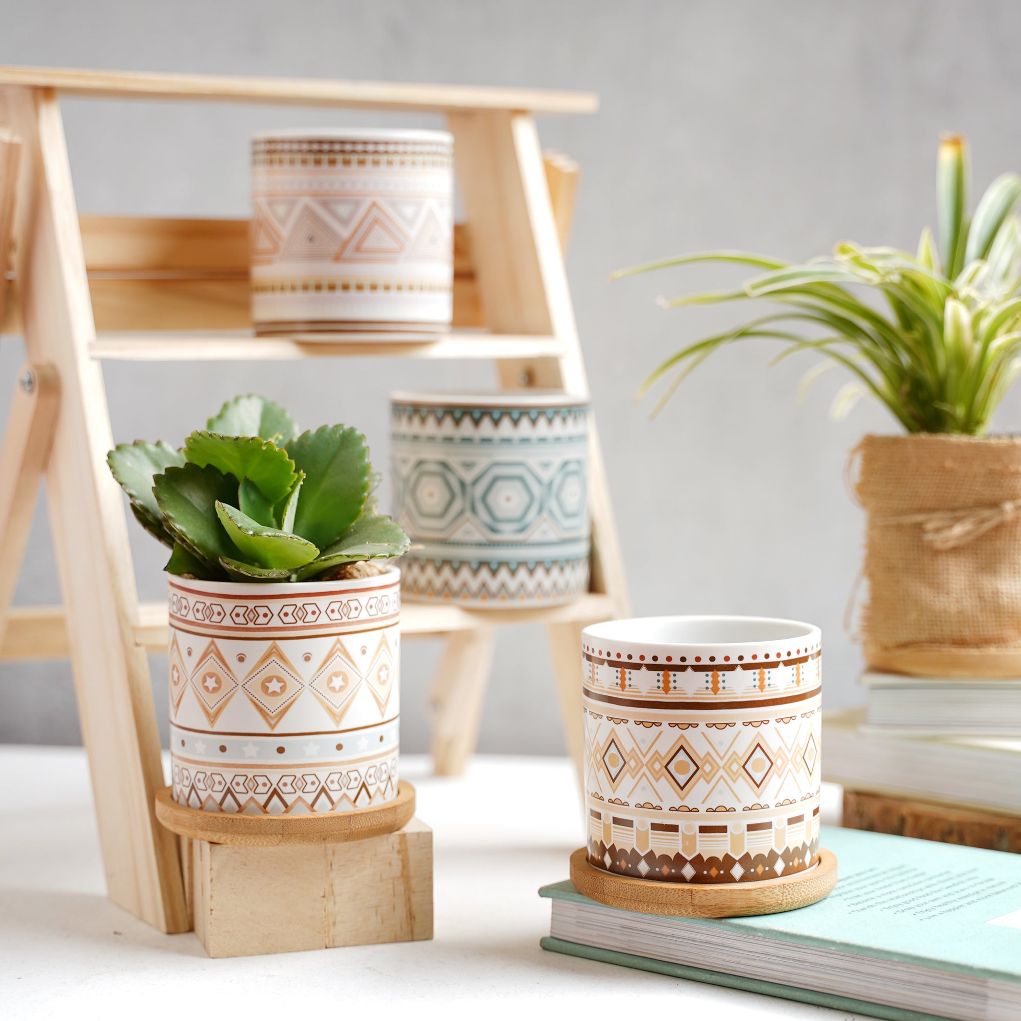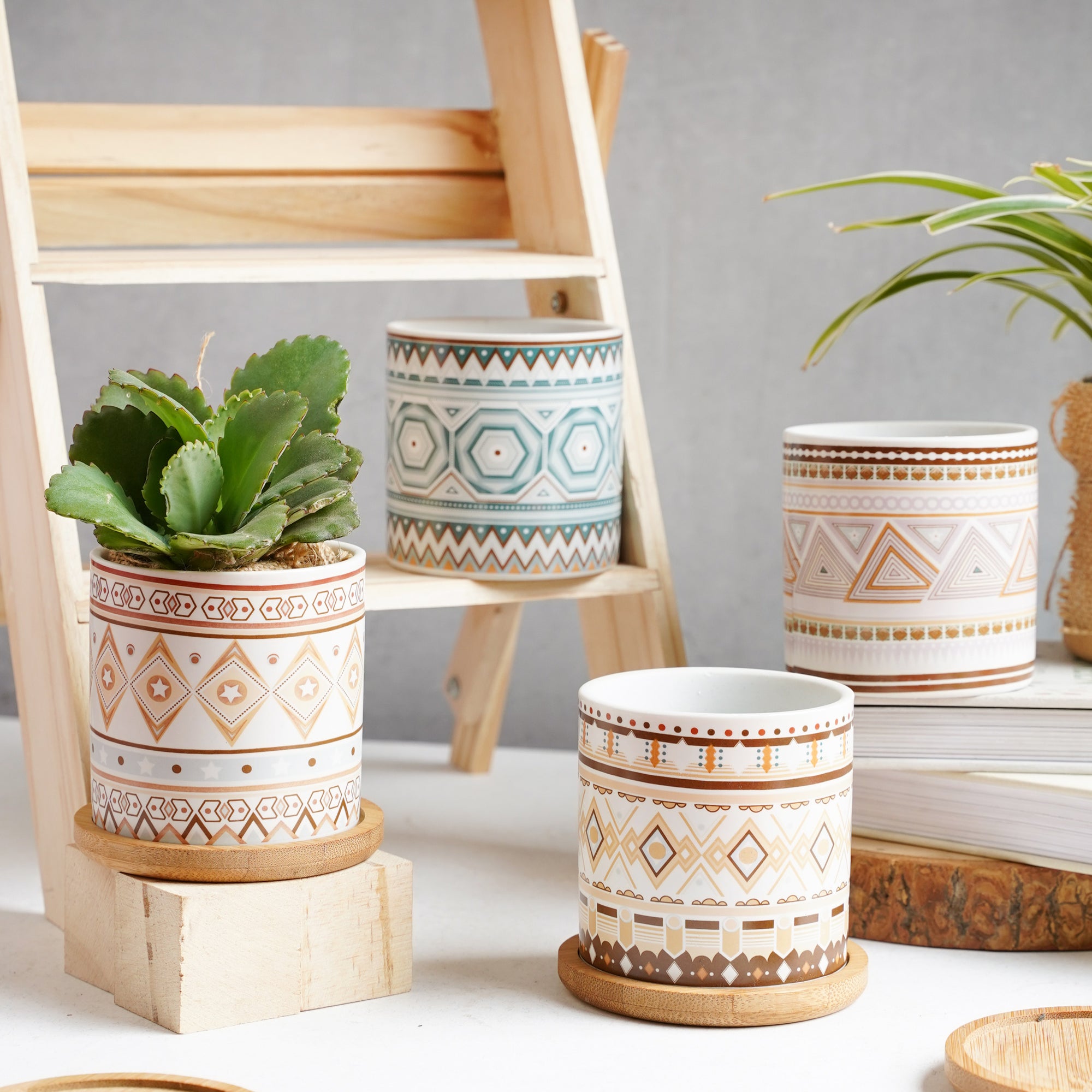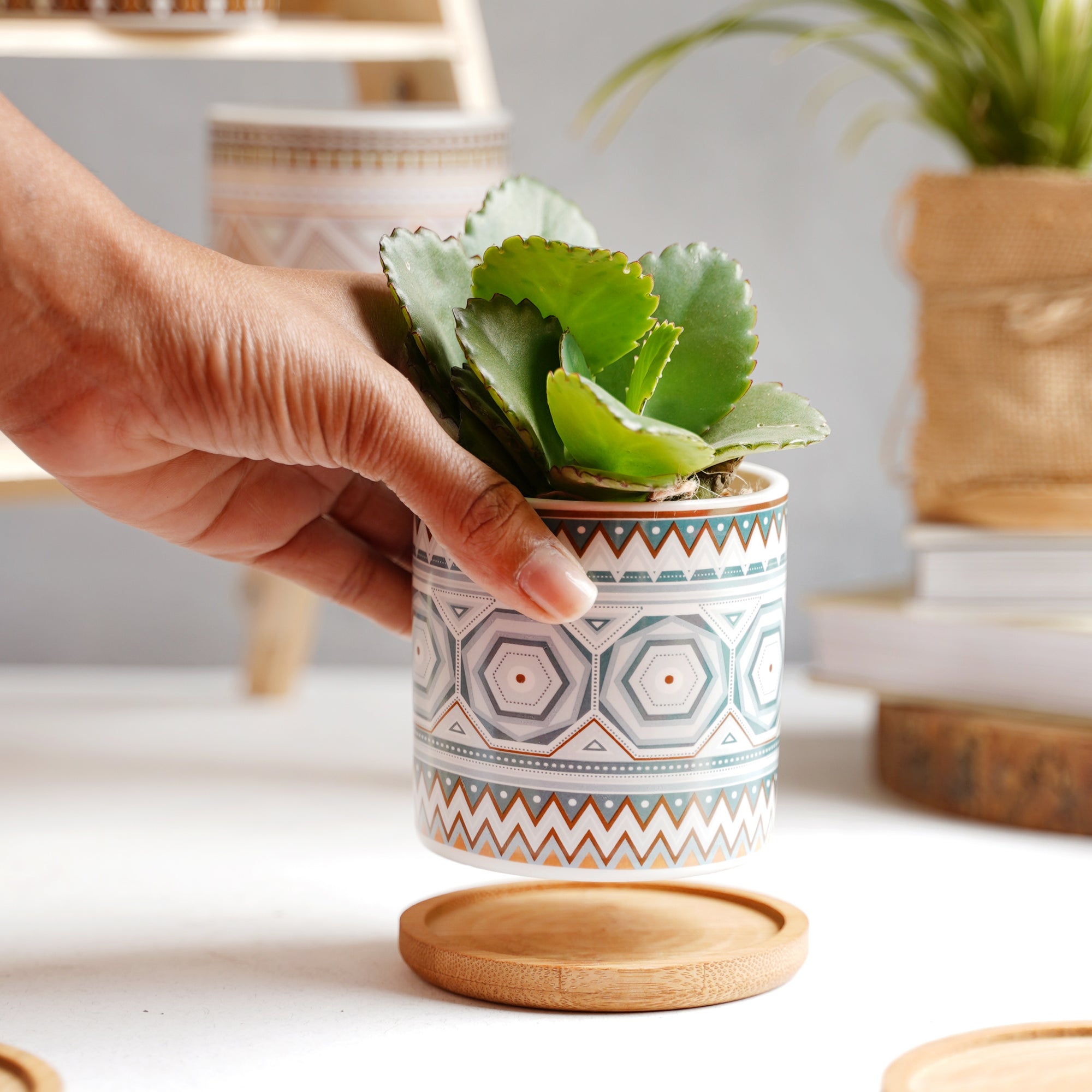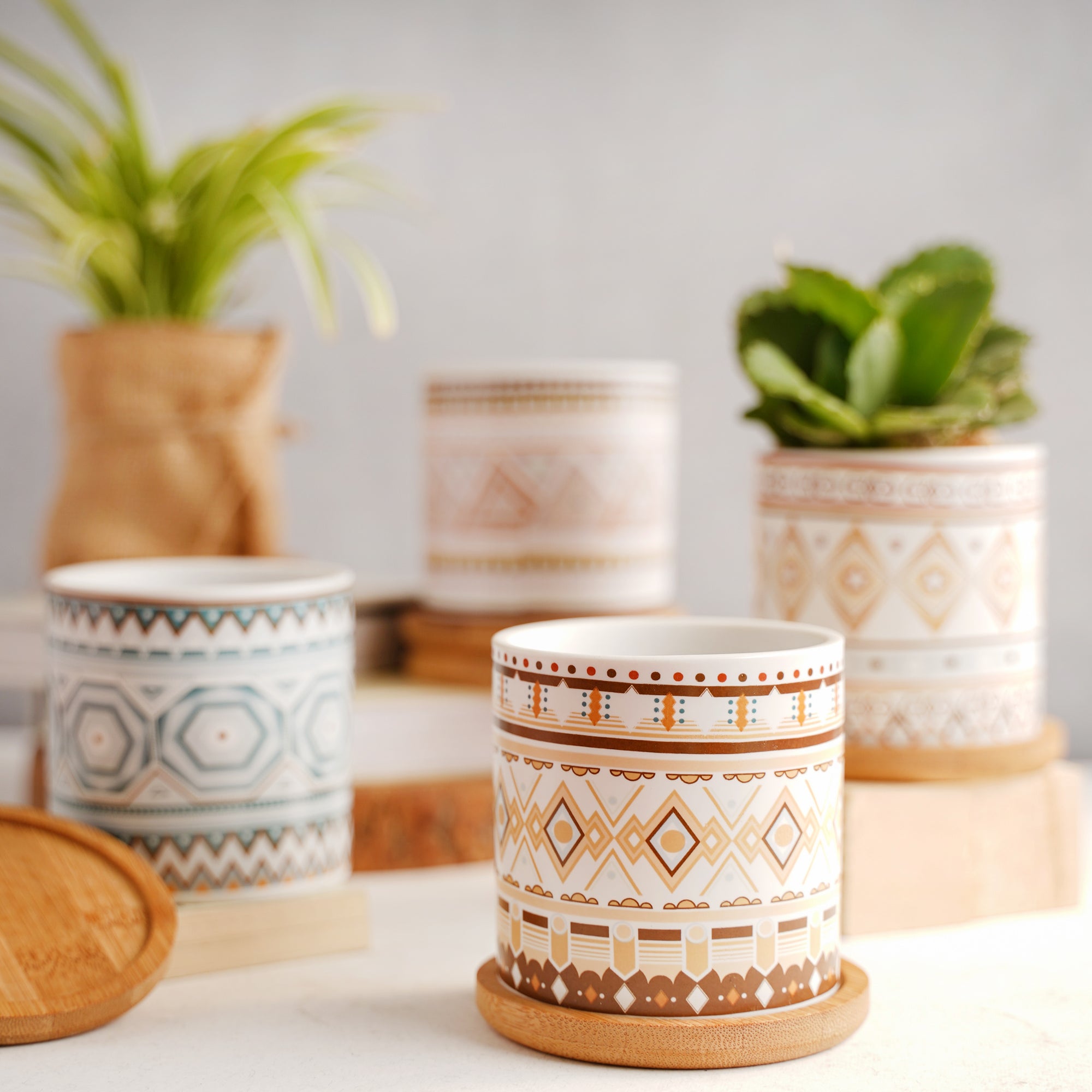 Bohemian planters that come in tribal prints with unique combinations of colours. The eye catching prints give the planters a modern look, making them stand out. They are apt for being paired with greens or colourful blooms, and can also be used as decor pieces to jazz up any solid colour toned corners of a living space with their hues. Plants do not come along with the planters.