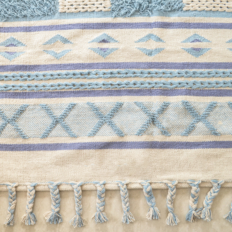 Nestip: The rugs can be paired well with the blue pompom cushions to create a serene setup.