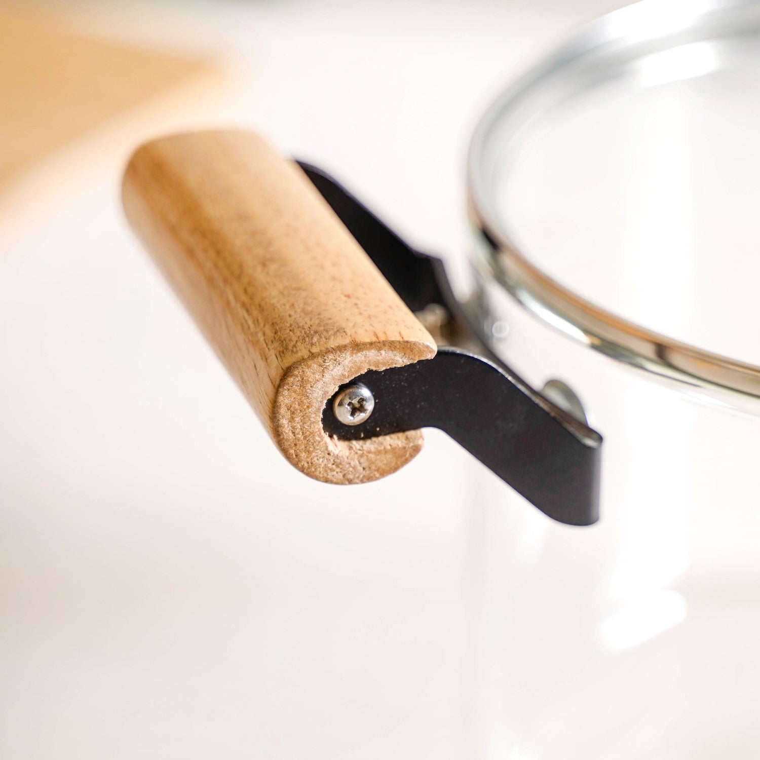 Design: This elegant cooking pot is meticulously crafted from premium, high-borosilicate glass, offering unparalleled clarity that allows you to observe your culinary creations in real-time. It features a sturdy, wide base for balanced placement and efficient heat transfer. The pot is beautifully complemented by two ergonomic handles, made of sleek metal for a modern touch and natural, engineered brown wood for a warm, organic feel. The matching lid, rimmed with stainless steel and also made of transparent borosilicate glass, is crowned with a refined knob featuring a smooth wood grain accent that perfectly echoes the natural handles. A discreet yet practical steam vent is seamlessly integrated into the lid's design, ensuring controlled steam release.