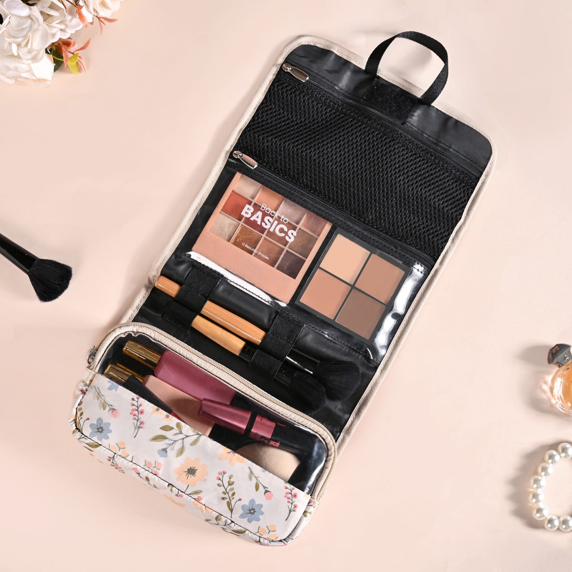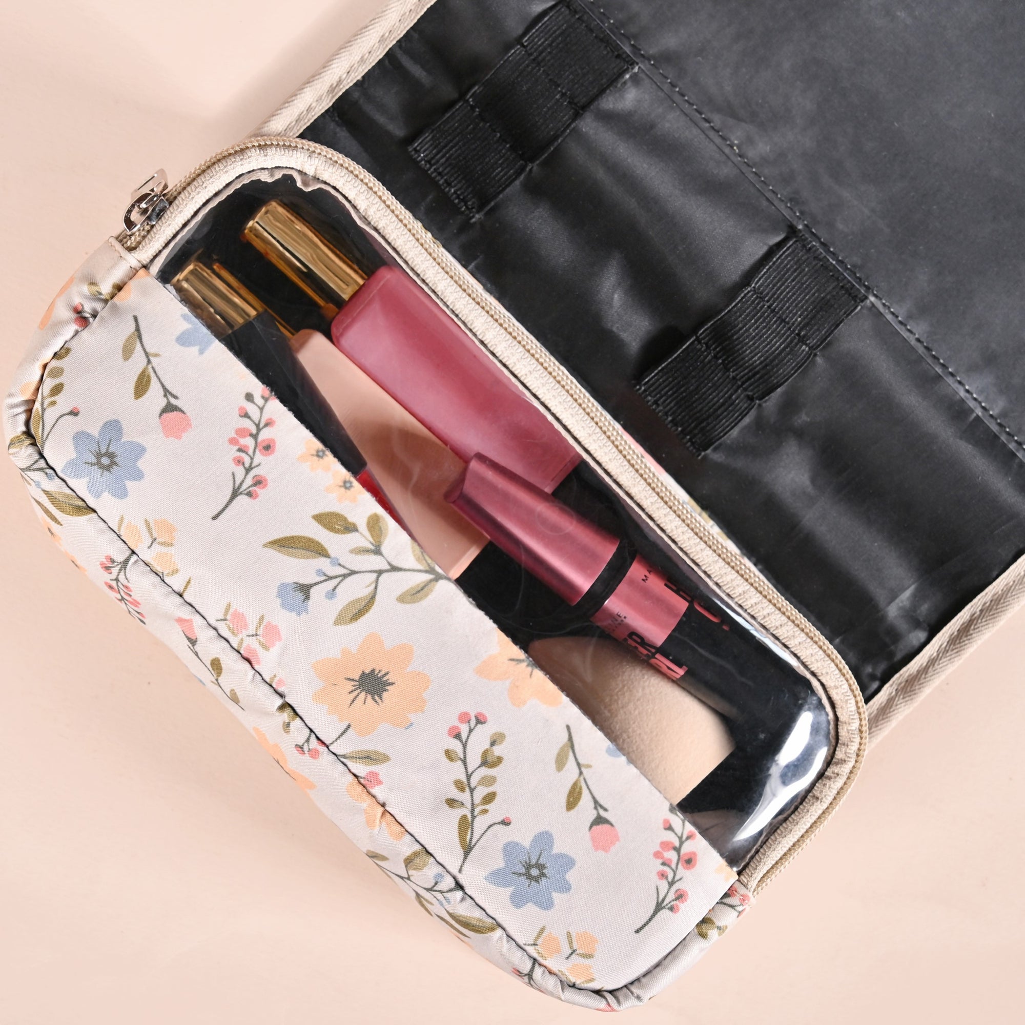 Design: Made from durable nylon with a wipe-clean inner lining and sturdy metal zips, this makeup pouch is built for travel. The exterior features a pastel floral print on a cream background and a stitched brand plate. Inside, one zip mesh pocket, a clear PVC pocket, elastic brush loops, and a padded zip compartment are arranged vertically. A small carry loop, suspension hook, and velcro strap let you hang the pouch as a hanging travel toiletry bag or fold it compactly for storage.