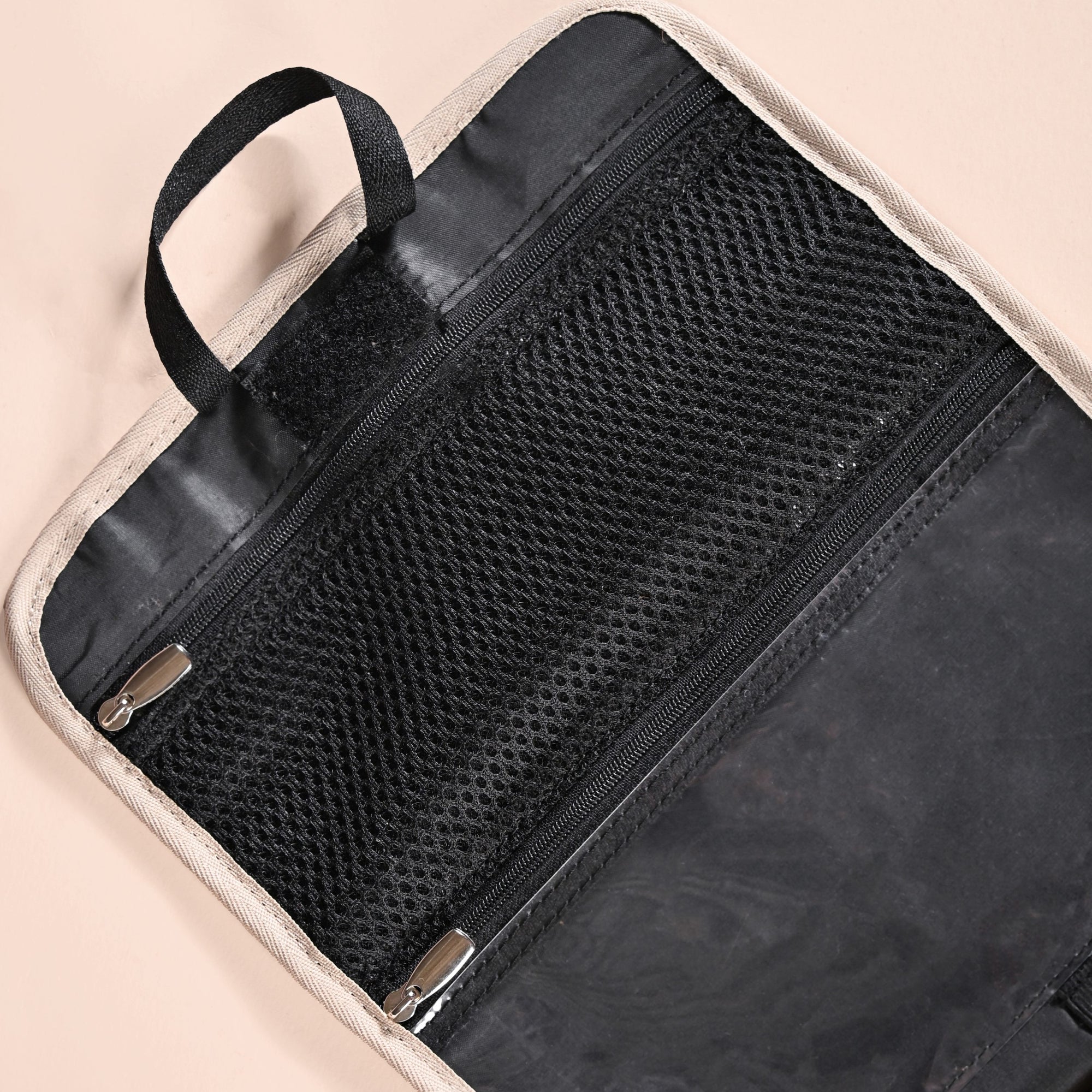 Benefits: This travel pouch keeps cosmetics and toiletries organised. The mesh pocket provides visibility and ventilation, the clear pocket stores small items, elastic loops secure brushes, and the padded lower compartment protects compacts. The suspension hook and attached strap make it easy to hang anywhere when travelling and keep counters clutter-free. The compact foldable design is ideal for short trips or daily carry. The velcro closure ensures all products stay intact in the pouch. Easy to wipe clean and lightweight, it’s a practical travel make-up bag for organised packing and quick access.