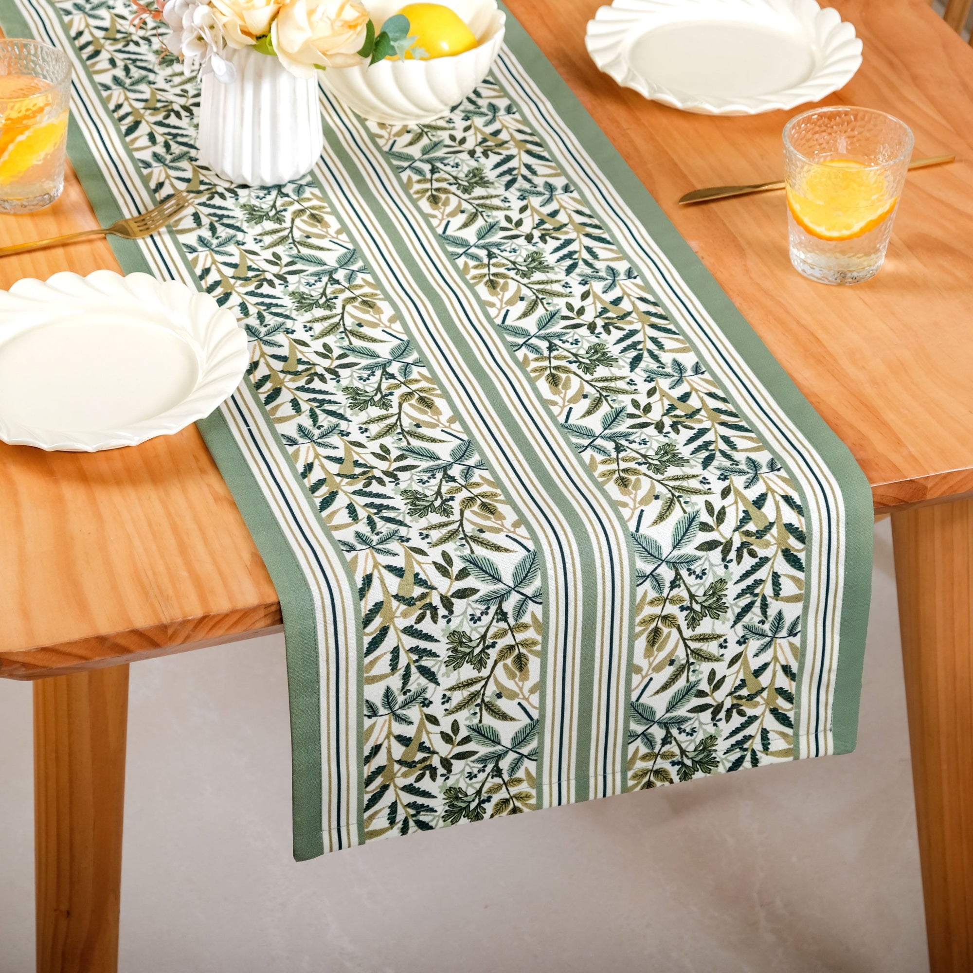 Design: Grace your dining space with this beautifully designed table runner, perfectly sized for a 6-seater table. The durable, woven fabric showcases an elegant botanical stripe print composed of soft green and neutral beige foliage. Crucially, the material is treated with a light, protective acrylic polymer coating that provides superior defence against liquid and food spills. The long, narrow shape and neat, reinforced edges ensure the runner drapes beautifully, making it a highly practical and attractive centrepiece for your setting.
