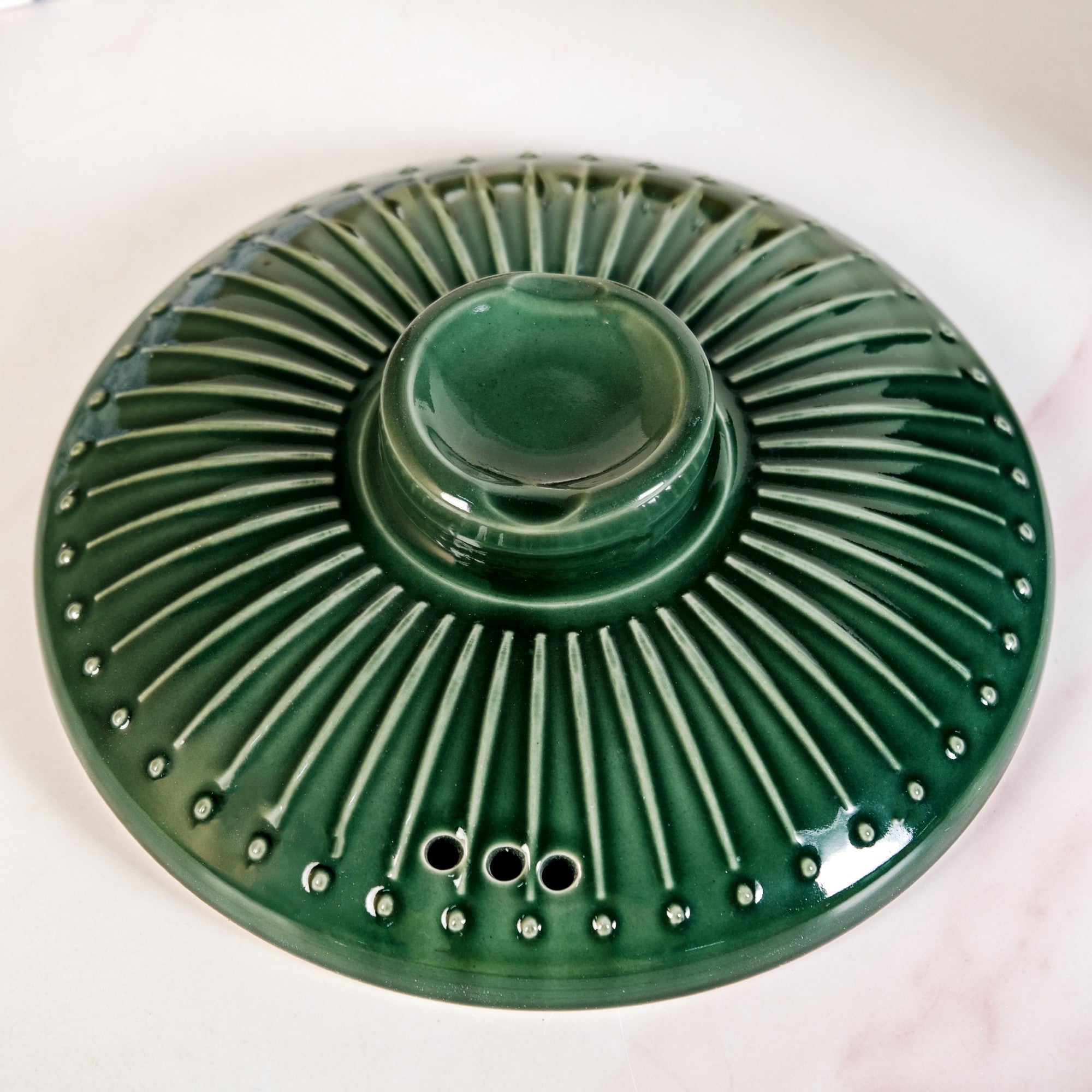 Design: Infuse a sense of artisanal elegance into your cooking space with this Japanese-style ceramic pot. The standout feature? A striking, emerald green lid with a radial etched pattern that mimics sunbursts. Glazed to perfection, the lid shimmers with a subtle sheen and includes three symmetrically placed steam vents. The lid is topped with a matching ceramic knob, blending seamlessly into the design while staying cool to the touch. The pot's base contrasts beautifully in a matte black finish. The curved silhouette offers a grounded feel, while the ergonomic side handles feature subtle ridges underneath for a secure grip.