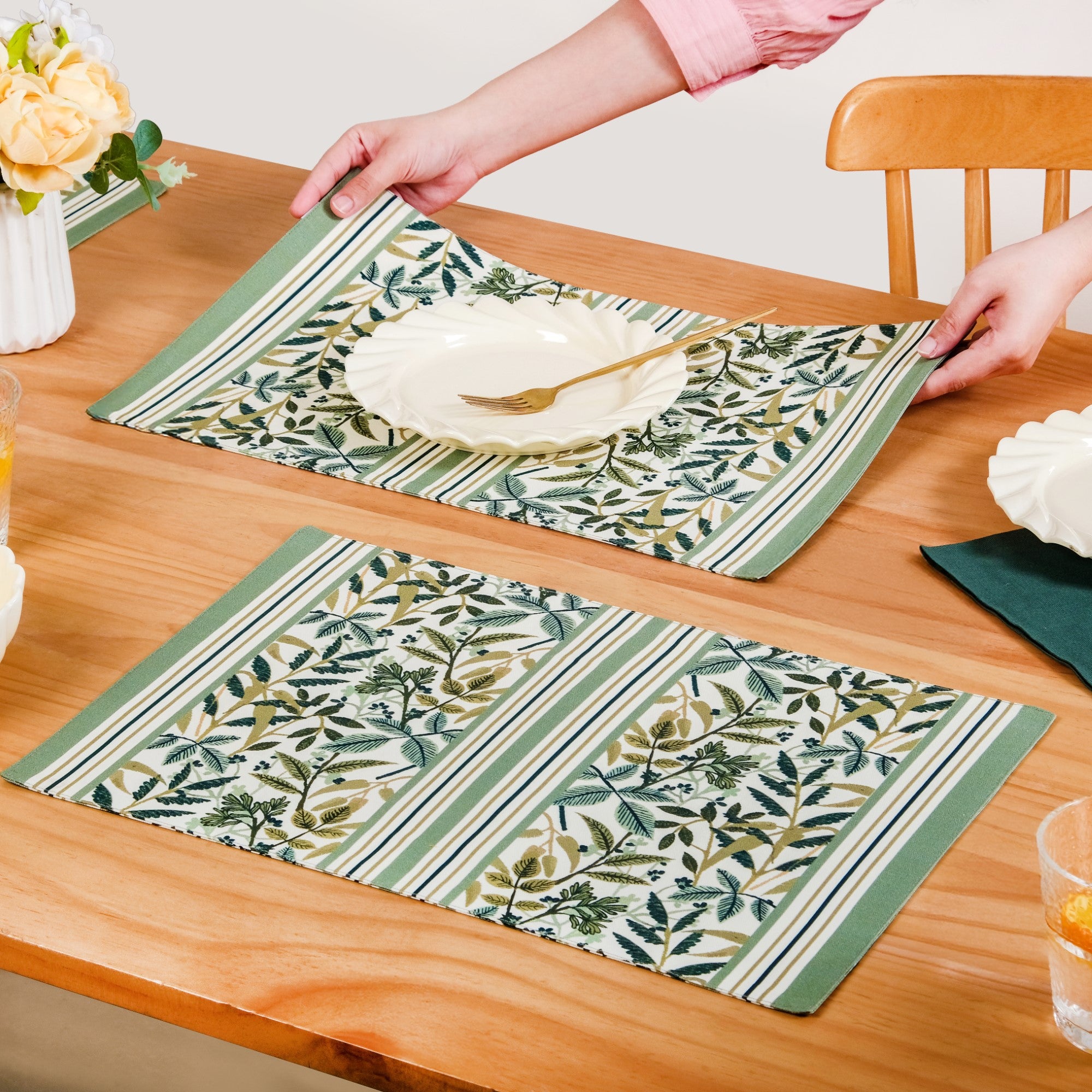 Design: This practical set of 4 place mats is sized perfectly for smaller tables, presenting complete reversible functionality for quick aesthetic changes. The sturdy woven material displays a tranquil botanical design achieved in a soothing spectrum of soft green and neutral beige shades. The outer surface is enhanced with a resilient, transparent acrylic polymer coating that actively repels liquid splashes. Each mat maintains a neat rectangular silhouette and features robust, sealed edges, guaranteeing exceptional form and longevity.