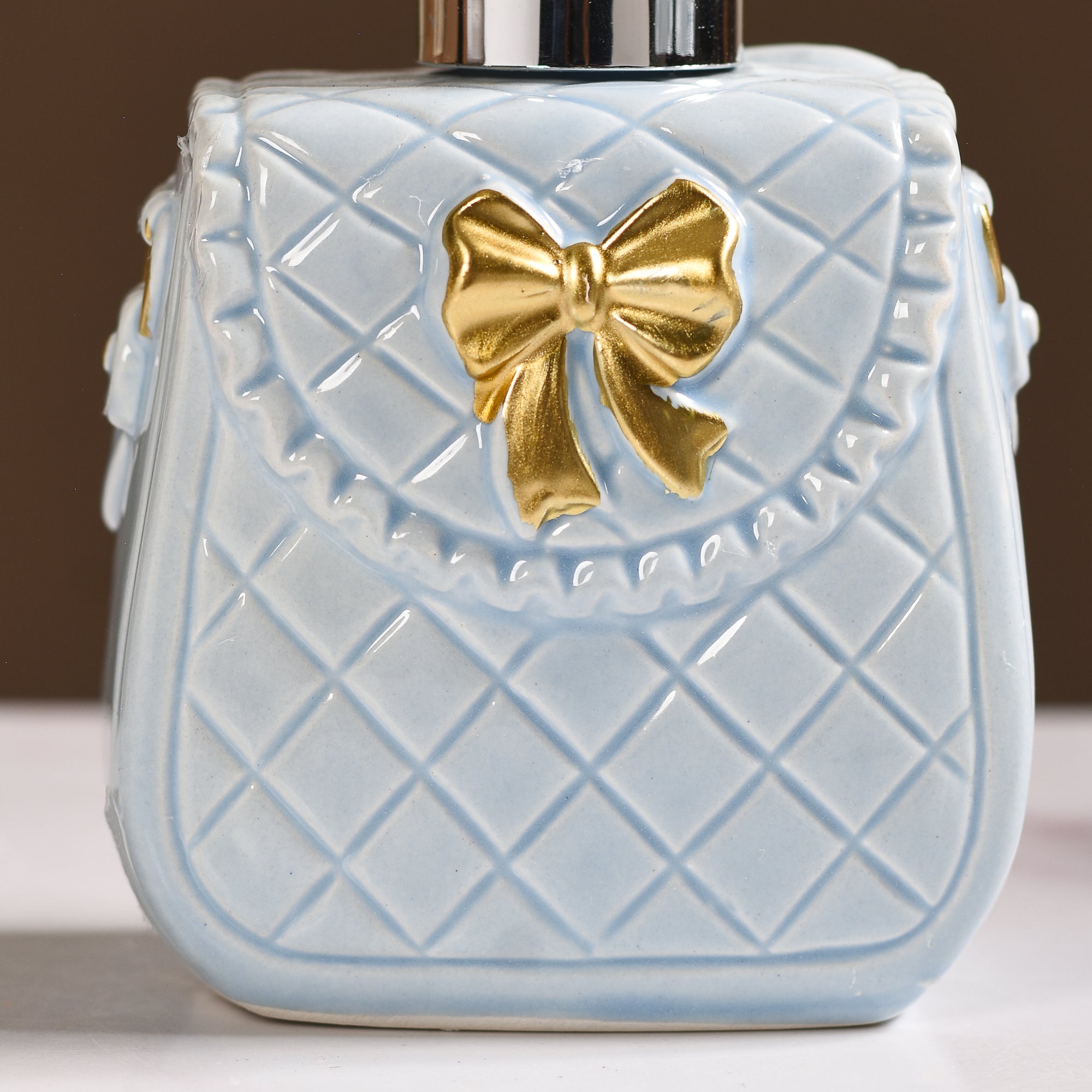 Experience the perfect blend of elegance and practicality with our purse-shaped ceramic bath set. Crafted from durable ceramic material, this bathroom set includes a refillable dispenser with a pump, a versatile tumbler, and a practical toothbrush holder, ensuring your daily routine is both well-organized and stylish. A delicate gold bow detail on this purse-shaped bathroom accessories set adds a touch of sophistication and charm, making it a standout addition to your bathroom decor. Each piece in this set is expertly crafted, reflecting attention to detail and quality in every aspect. The smooth gloss finish adds a touch of luxury to your bathroom decor, creating an elegant and refined ambience. The textured exterior provides a unique and tactile experience, enhancing the set's overall aesthetics.