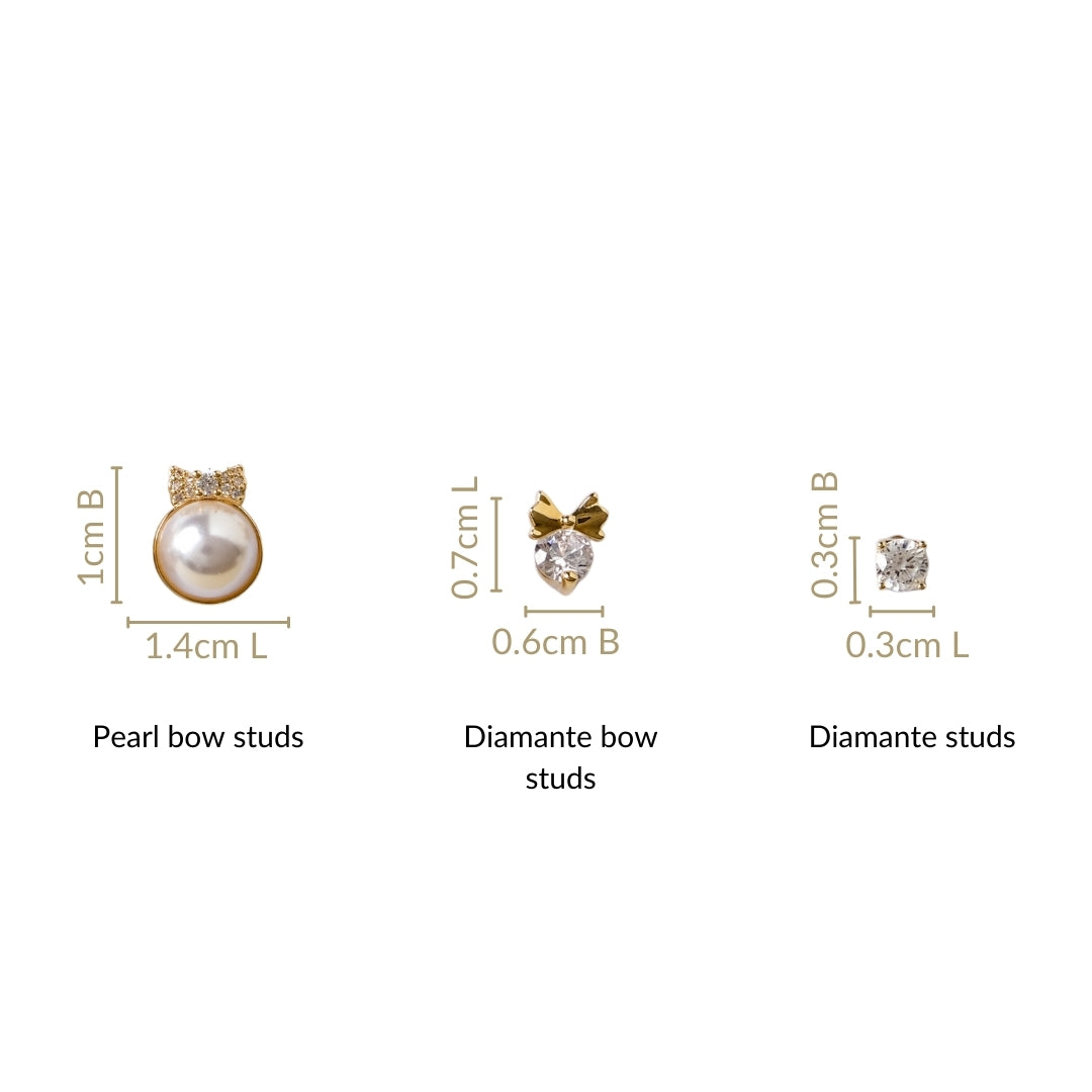 A touch of elegance, a hint of sparkle, and a dash of charm, this earring set is designed to elevate your everyday style. Inspired by the delicate beauty of timeless femininity, each piece embodies grace in its own way. The classic prong-set diamante stud offers effortless sophistication, while the gold bow with its subtle sparkle adds a playful touch. Completing the trio, the faux pearl earring crowned with a diamante-encrusted bow exudes coquette elegance, making this set a perfect blend of chic and refined.