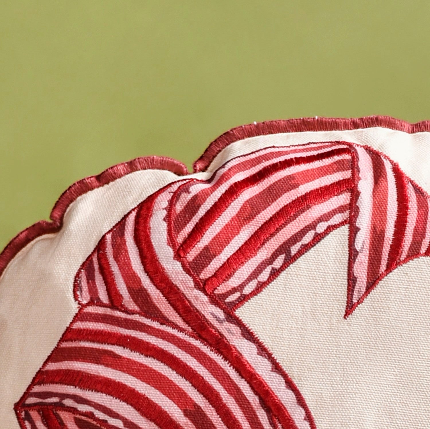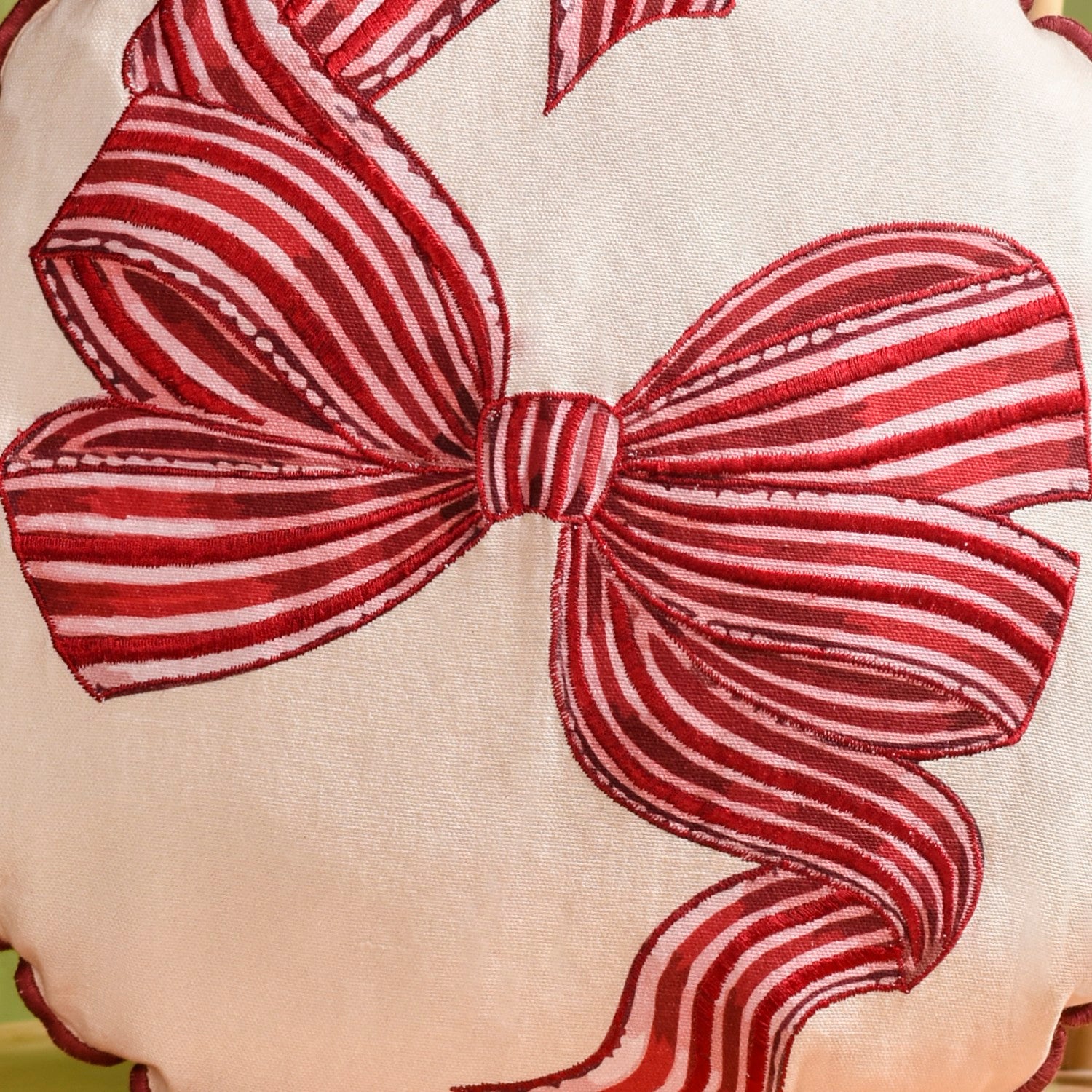Design: This round Christmas cushion cover features a large red and white striped bow in the centre, creating a bright festive focal point. The soft off-white cotton slub background enhances the detailed bow design, while deep red piping frames the edge for a clean finish. The fabric’s natural texture adds character, and the secure back zipper keeps the cover neatly in place and easy to use.
