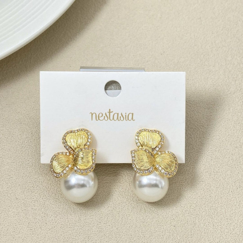 A notion of modern-day luxury, these pearl drop earrings offer a sophisticated twist on classic design. The design showcases rib-textured gold bows, reminiscent of the delicate details found in antique jewelry, with a thin diamante border adding a subtle sparkle. A chunky faux pearl completes the look, offering a perfect blend of old-world elegance and contemporary style.