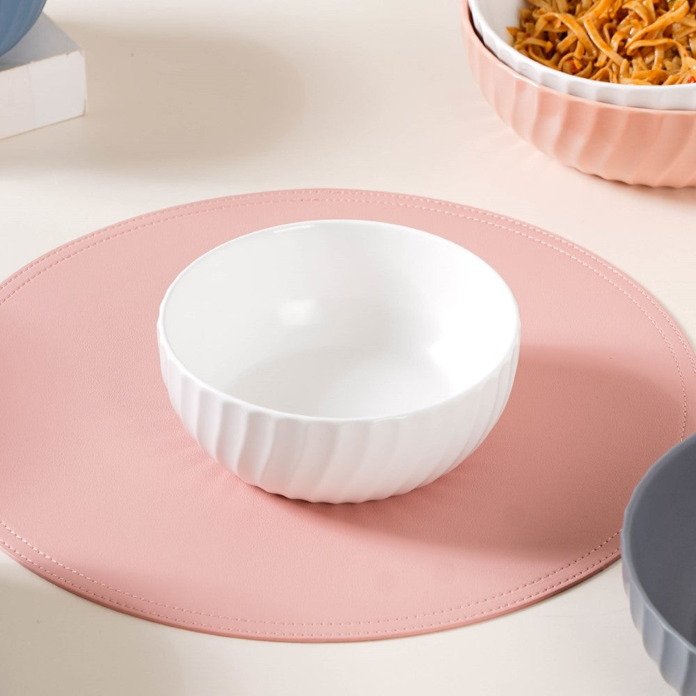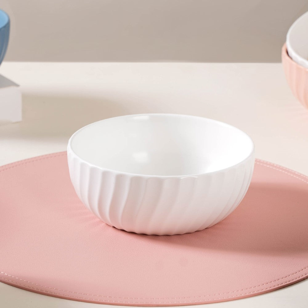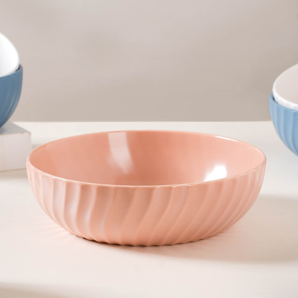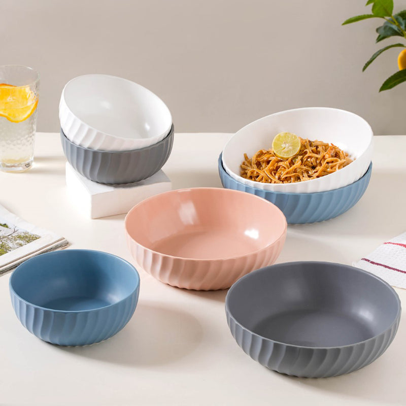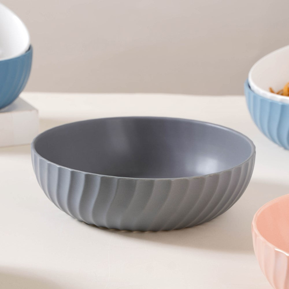 A ceramic bowl that can be used as a salad bowl, soup bowl or curry bowl and for serving snacks, fruits or desserts and can also be used for baking and grilling. The fine textured lines on the surface of the bowl adds convenience and make a table setting look elegant. The bowls are microwave and oven safe.