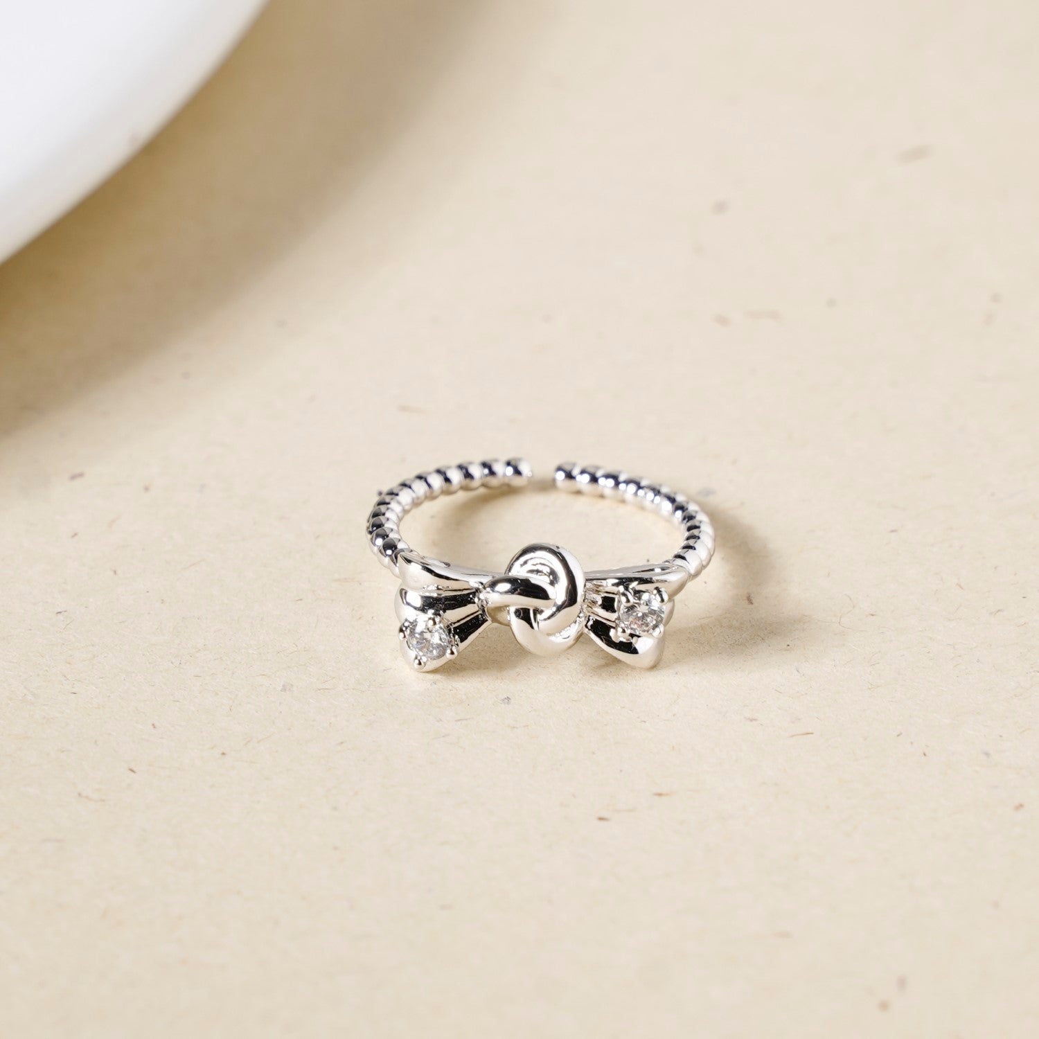 Charming and full of character, this silver-toned ring is designed to stand out. Crafted with a unique beaded texture that adds depth and dimension, the ring elegantly forms a delicate bow tie at the front. A single shimmering stone is placed diagonally on the bow, catching the light beautifully with every movement. The intricate detailing and dynamic design make this ring a perfect blend of playful sophistication and effortless elegance.