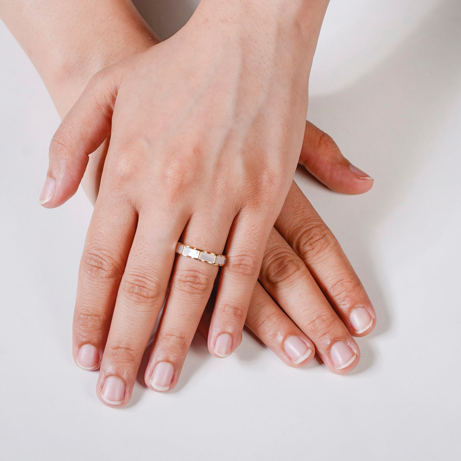 Nestyle: Complement the iridescent gemstones of the ring by pairing it with neutral and pastel outfits for a casual chic look.