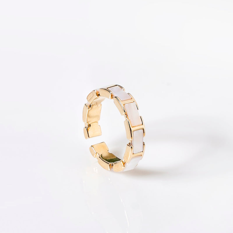 A striking blend of elegance and modern style, this gold-toned adjustable ring features a uniform band designed like a sleek box chain. Rectangular white gemstones with an iridescent finish embellish the band, catching the light with mesmerising hues. Inspired by the refined geometry of contemporary jewellery, the ring seamlessly balances bold structure with delicate shimmer. The adjustable design ensures a comfortable fit, making it a versatile addition to any collection. Whether worn alone or stacked, this piece brings effortless sophistication to any look.