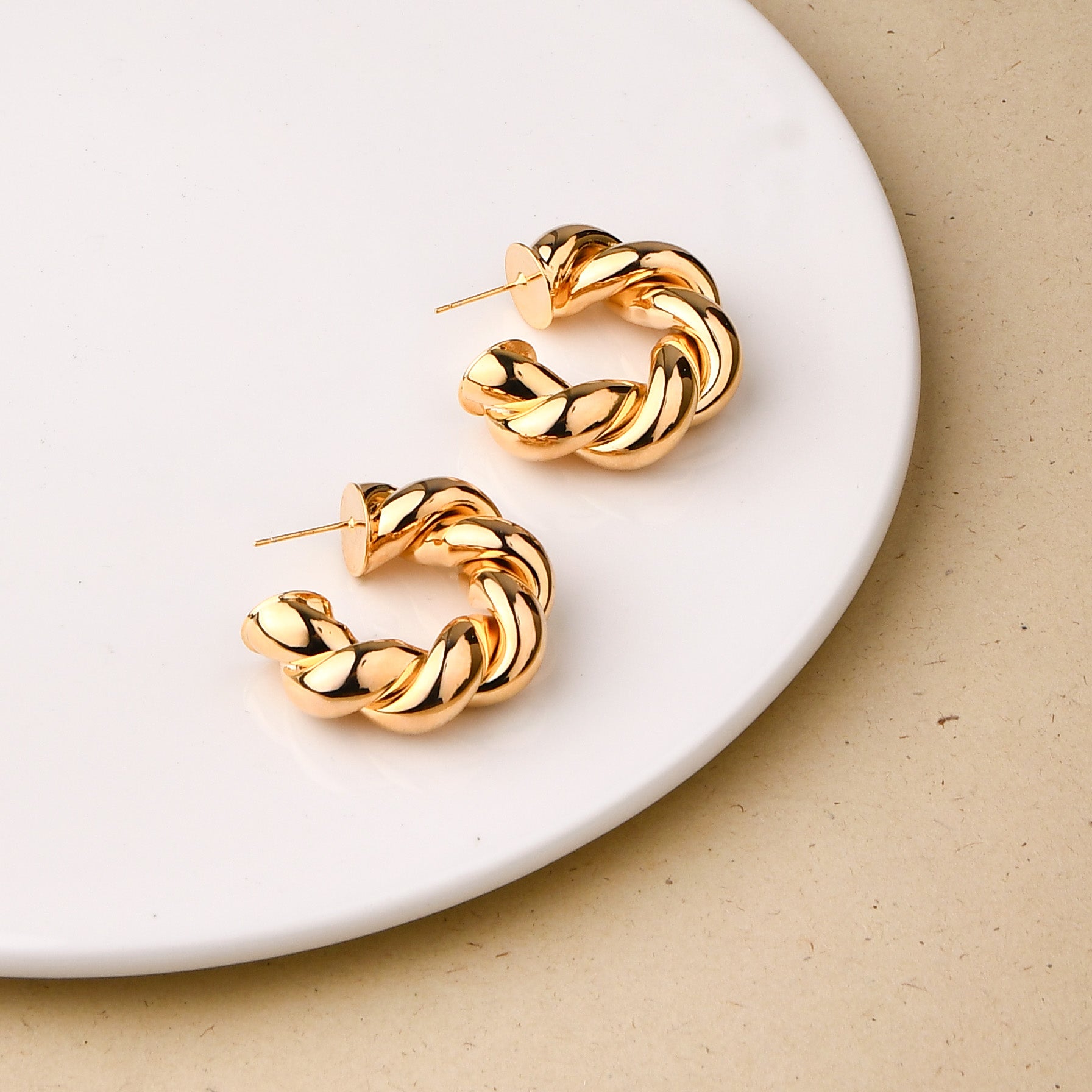 Bold, textured, and undeniably stylish, these gold-toned chunky metal hoop earrings feature a stunning twisted braided design. The thick, sculptural hoops make a statement while maintaining a timeless elegance. Drawing inspiration from classic woven textures, the intricate braid design merges traditional artistry with contemporary flair. Whether you're adding drama to a formal outfit or elevating your everyday look, these hoops promise to bring an eye-catching, sophisticated touch to any occasion.