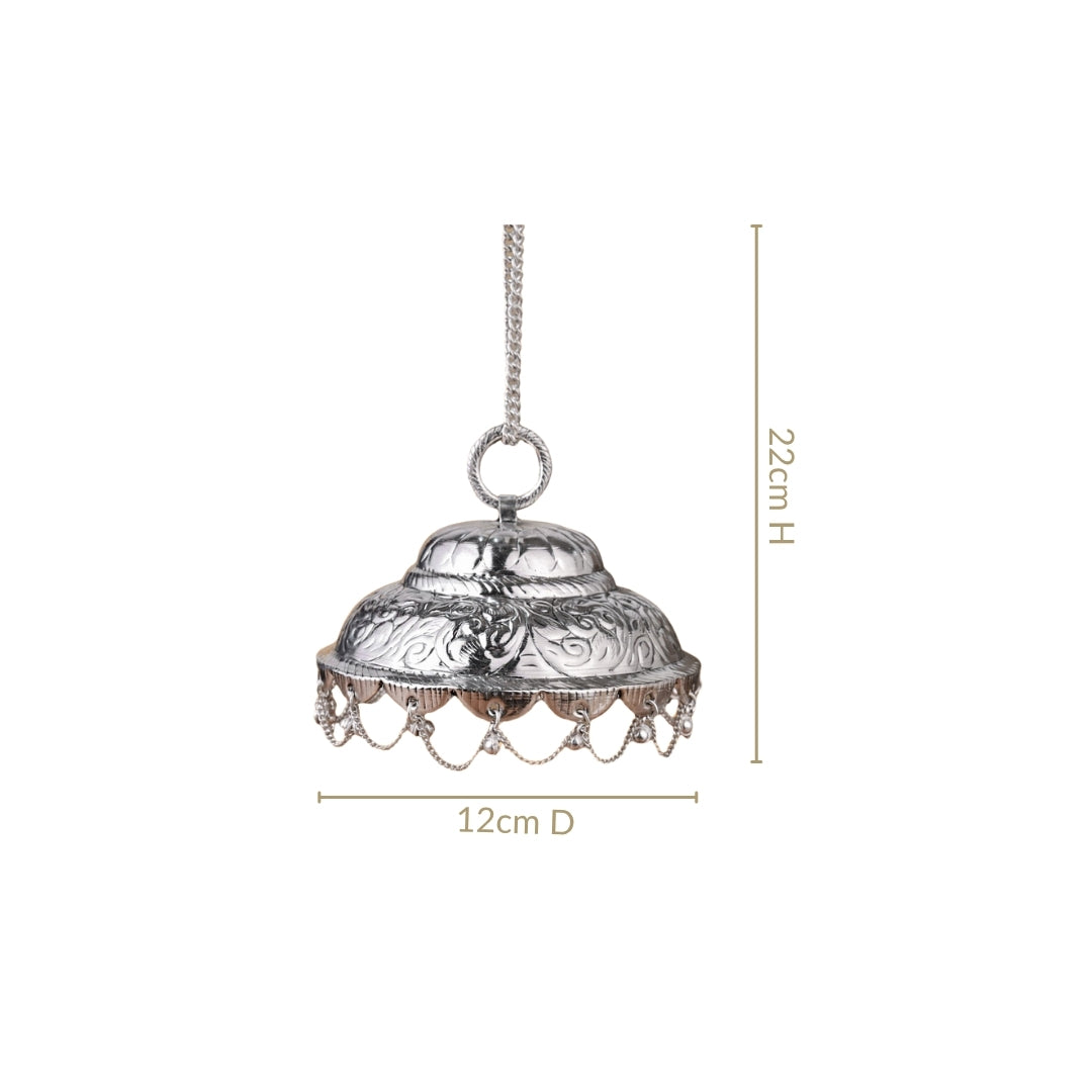 Design: This singhasan chattra features a compact dome-shaped structure crafted from solid brass. Its oxidised silver finish offers a soft gleam that beautifully catches the light. The upper dome showcases hand-engraved floral patterns that lend it a delicate appeal. A sturdy hanging loop is attached to the top for easy suspension. The scalloped edge is finished with dainty hanging chains that move gently with the air. With fine surface etching and graceful curves, the design balances traditional craftsmanship and subtle ornamentation.