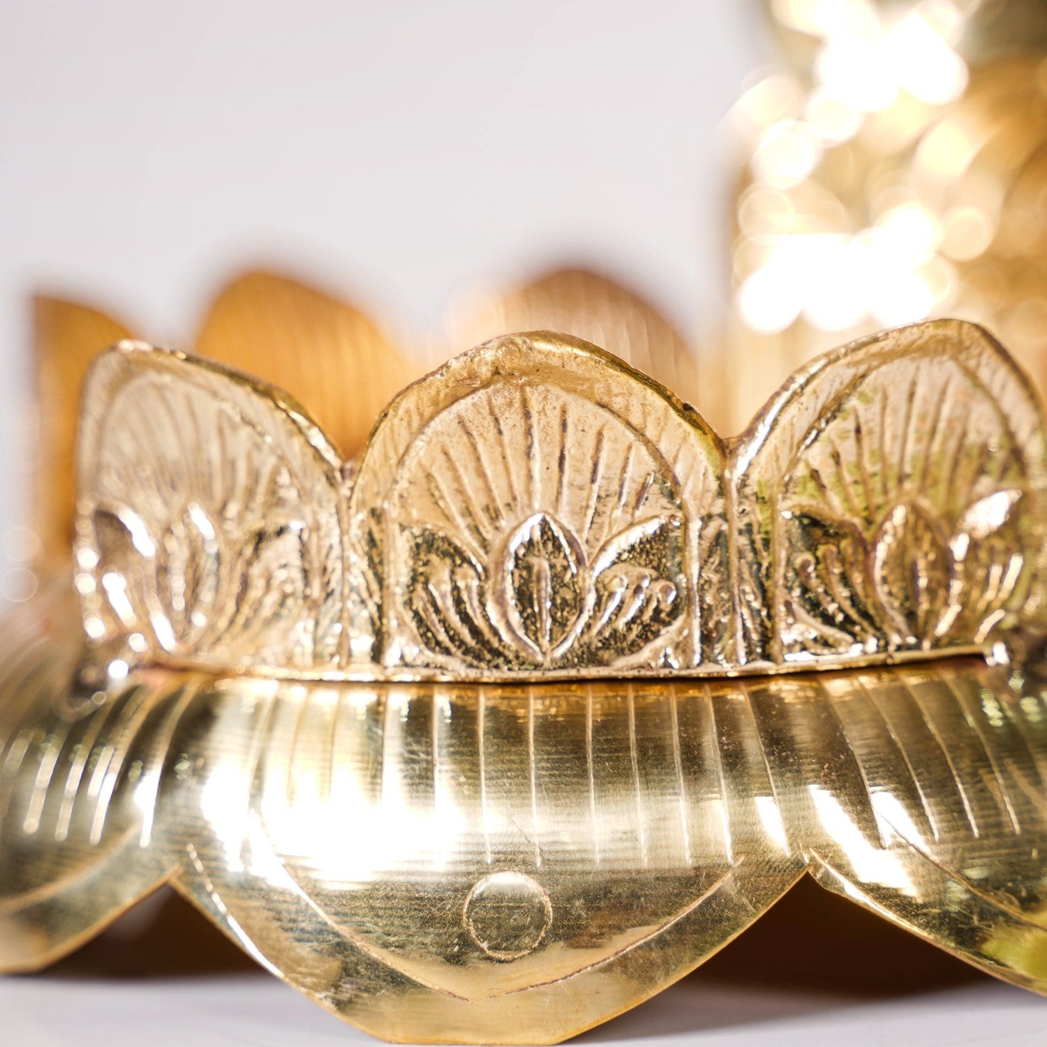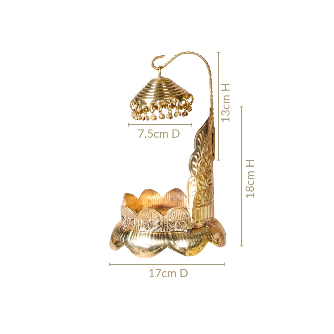 Design: The singhasan is crafted from textured brass, lending it a rich, traditional feel. The base features intricately carved floral motifs, adding depth and ornamental charm. At the centre sits a lotus-shaped aasan, where each petal bears fine detailing that radiates outward like a divine bloom. Rising behind the seat is a beautifully etched peacock backrest, designed to symbolise grace and majesty. Attached to the back is a slender stem that supports a detachable chatra, which is further adorned with delicate, tinkling beads. The entire structure is proportioned to seat Laddoo Gopal comfortably while maintaining spiritual elegance. Its compact yet opulent form makes it ideal for any sacred altar or temple space.