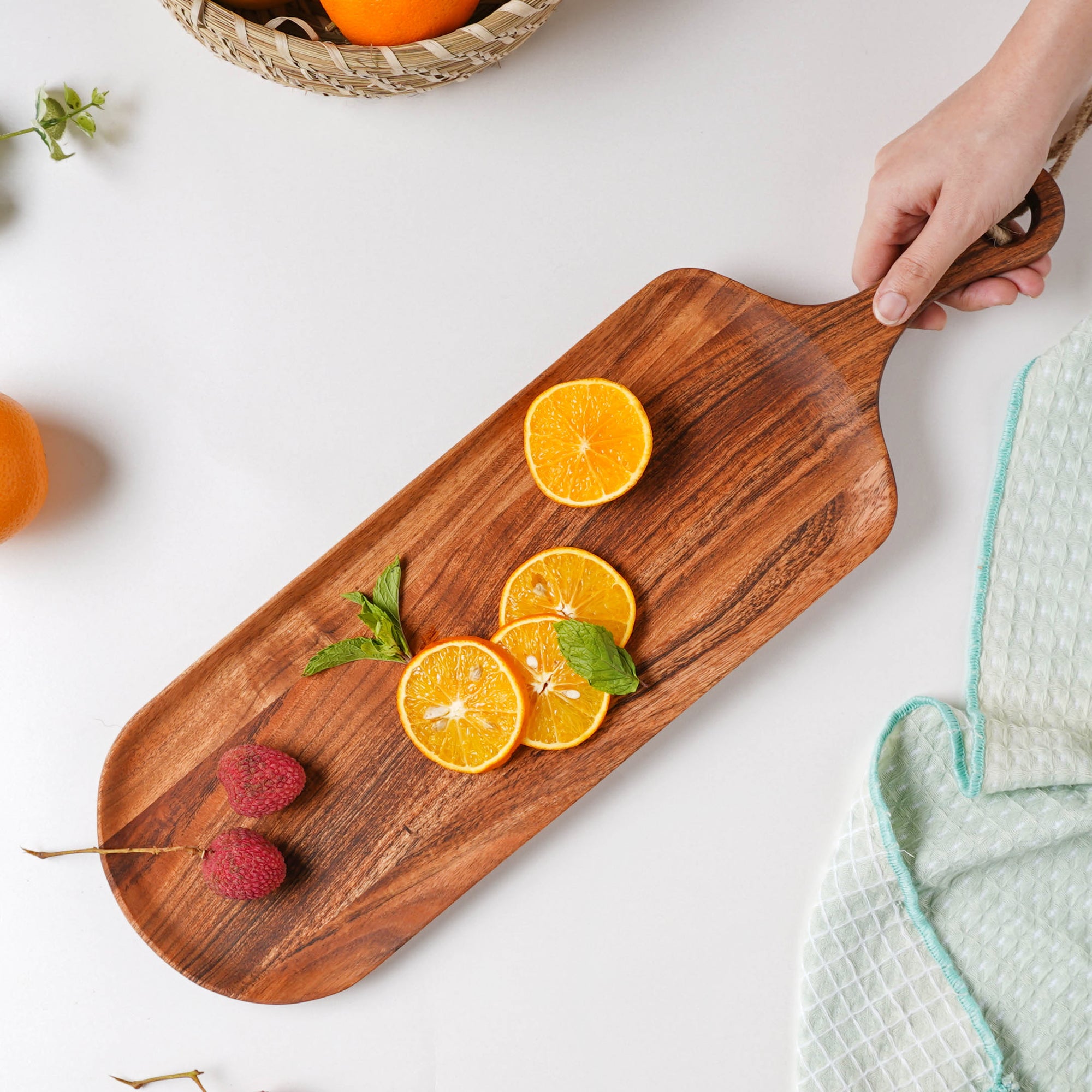 Our exquisite long wooden bread board with a handle can be a perfect addition to elevate your dining experience! Crafted with precision, this wooden platter blends elegance and functionality flawlessly. Its generous length allows for a stunning display of delectable dishes, while the sturdy handle ensures easy and safe transportation. Made from premium quality, sustainable wood, this platter exudes natural beauty and durability. Whether you're hosting a lavish dinner party or enjoying a cosy family meal, this timeless piece adds a touch of rustic charm to any occasion. Embrace style and convenience with our long wooden platter – a must-have for any discerning home chef.