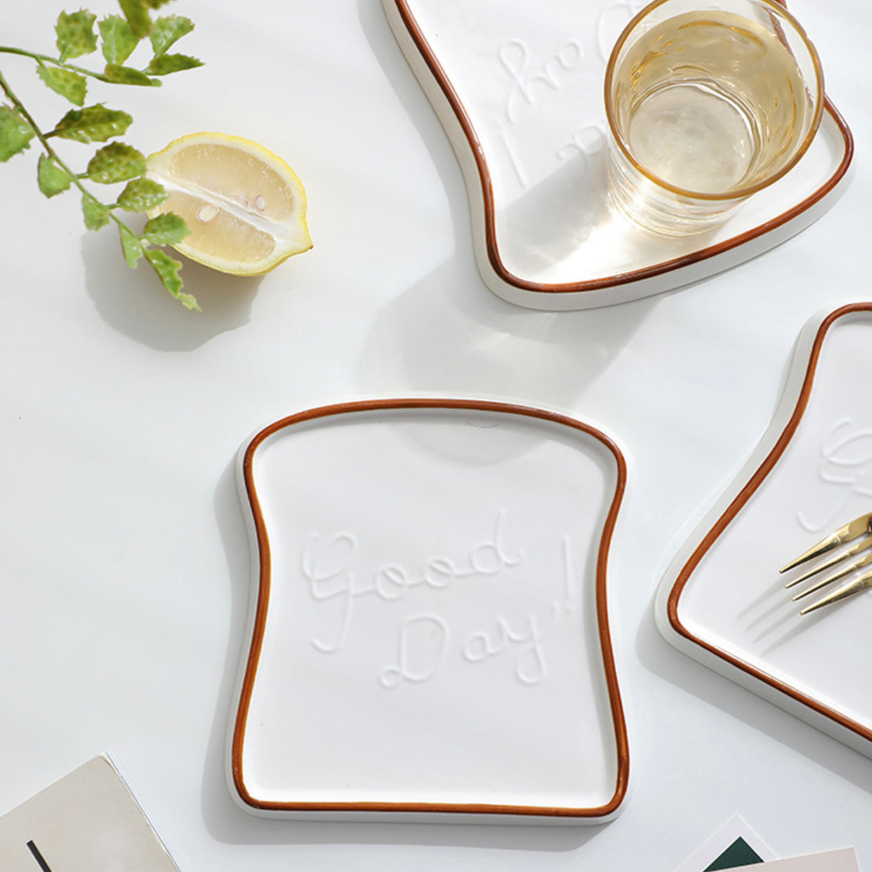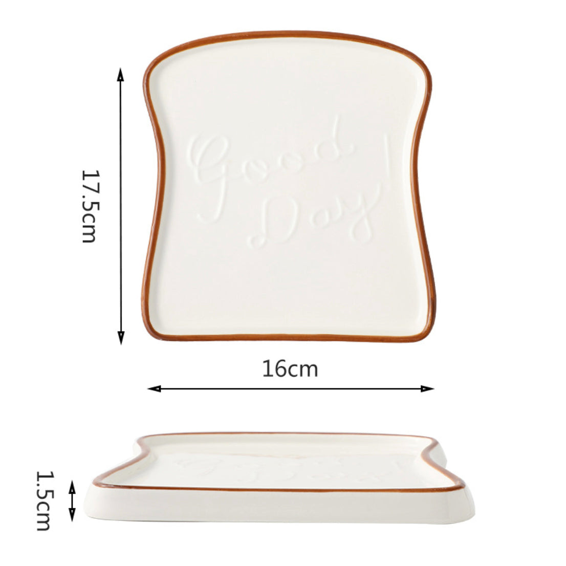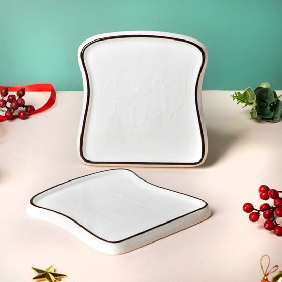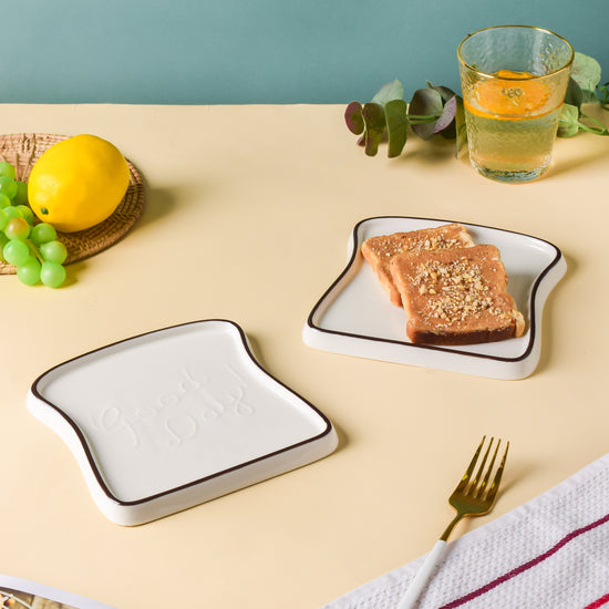 A breakfast plate in the shape of a bread with brown lining along the sides resembling a slice of bread. As the shape suggests, the plate is apt for serving snacks like sandwiches, burgers, or samosas. It can not only be used for breakfast but also for an evening teatime setting. The unique shape of the product with good day written on the surface is perfect for spreading positive vibes and turning an ordinary day into a special one. It can also be perfect for gifting on birthdays and occasions.