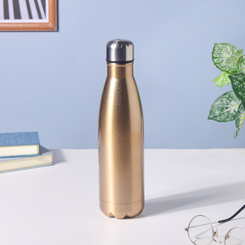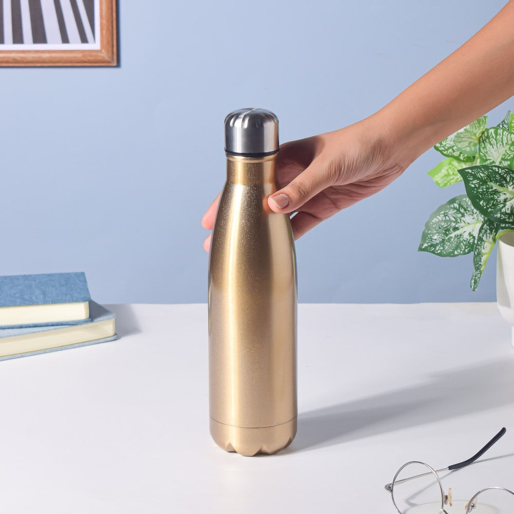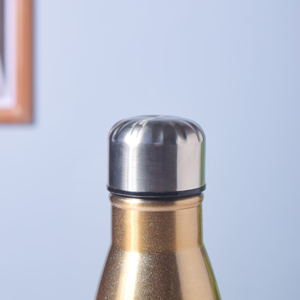 The lidded stainless steel bottle is the pinnacle of summery delight. All that is essential amidst the stifling heat is a sip of iced water. The bottle, which is bright gold in color, ensures that performance. Even when traveling, one can take a hearty sip from the chilled water-filled bottle with a lid featuring silicon lining. The bottle fits comfortably in backpacks or gym bags because it is compact and leak-proof. Refreshments and juices can be stored in the water bottle and served chilled and nutritious. Features: -Double-walled -304 stainless steel bottle -Easy to clean and maintain -Silicon lining lid -Leakproof -Odour free -100% food grade -Easy to carry in backpacks/gym bags -Easy to pour & easy to hold Nestip: The bottle can be used to carry freshly poured lemon tea. Size: Bottle- 8cm B x 28cm H (with lid) Lid- 3.5cm D Capacity- 500ml Color: Gold, silver Material: Stainless steel Products included: 1 bottle Style: TIAT39S05