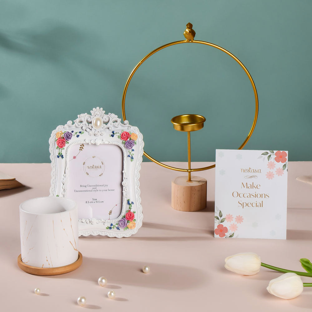 A budding sapling in a beautiful planter symbolises the start of a new journey and can be an ideal wedding gift for the newlyweds. To celebrate the new journey of the bride ad groom, the wedding gift hamper set features 1 white planter that can be used to place small indoor plants on the work desk. The wedding hamper also includes 1 large tealight stand to revamp the work desk decor. Not to mention, the hamper contains 1 photo frame to help the bride and groom cherish their beautiful wedding memories forever.