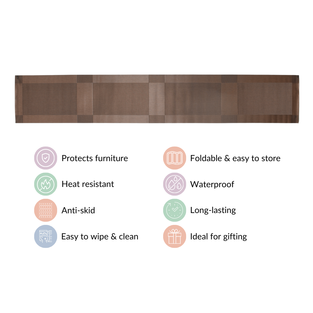 Absolutely! Crafted with precision and attention to detail, our table runner effortlessly combines style and practicality. While the rich brown colour lends warmth and sophistication, the heat-resistant, anti-skid, foldable, and waterproof qualities make it a practical addition to one's dining ensemble.