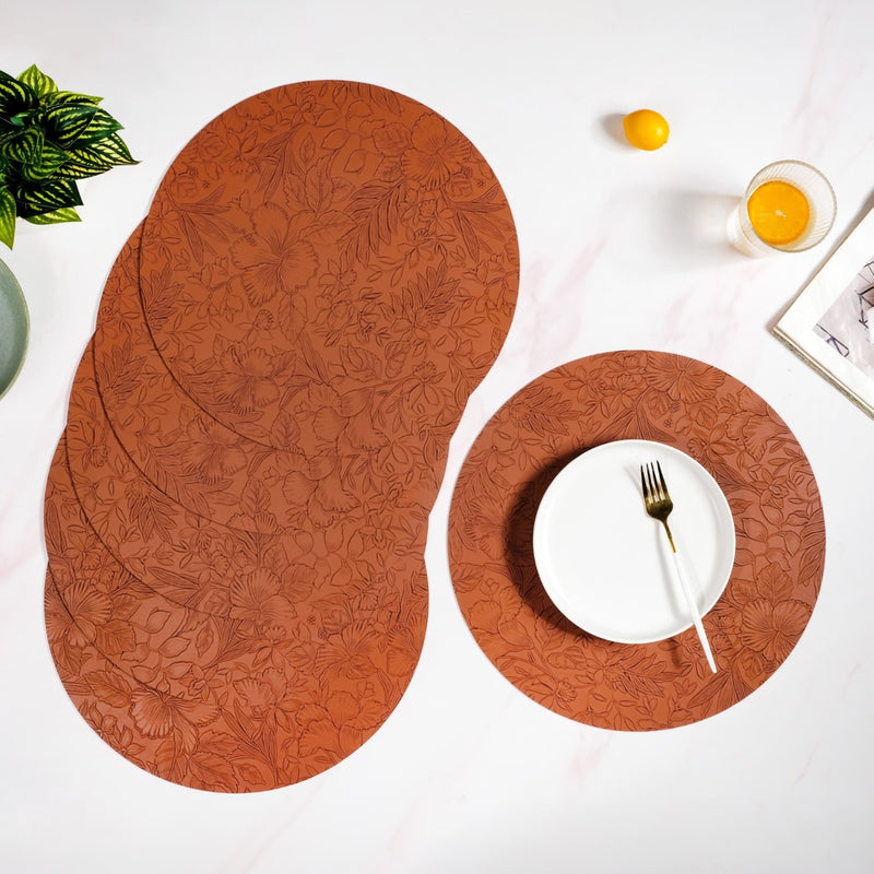 Design: Bold, chic, and modern, this table mat set is adorned with an embossed hibiscus flower pattern that screams modern elegance. The earthy rust colour of these dining table placemats adds a warm, natural vibe, while the anti-skid, rubber backing ensures these dining table mats stay exactly where you want them. It’s a perfect blend of ergonomic functionality and visual appeal, making every placemat a standout addition to your dining ensemble.