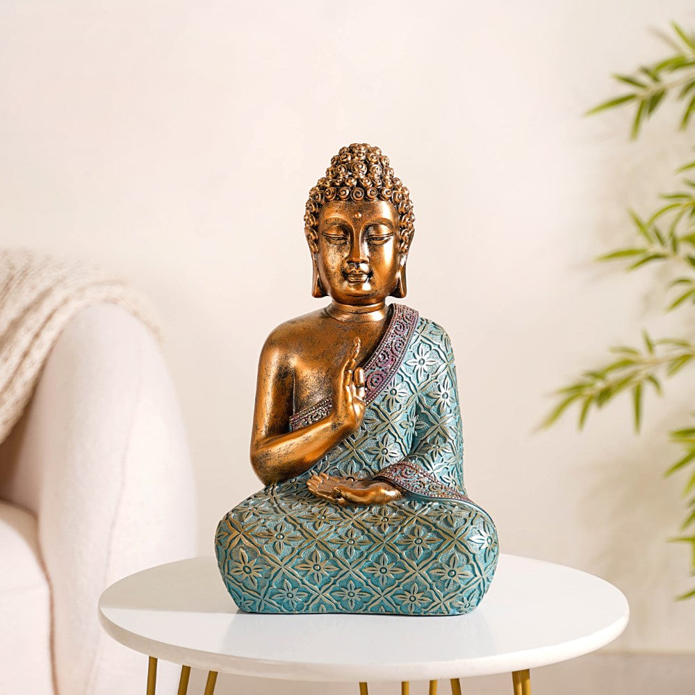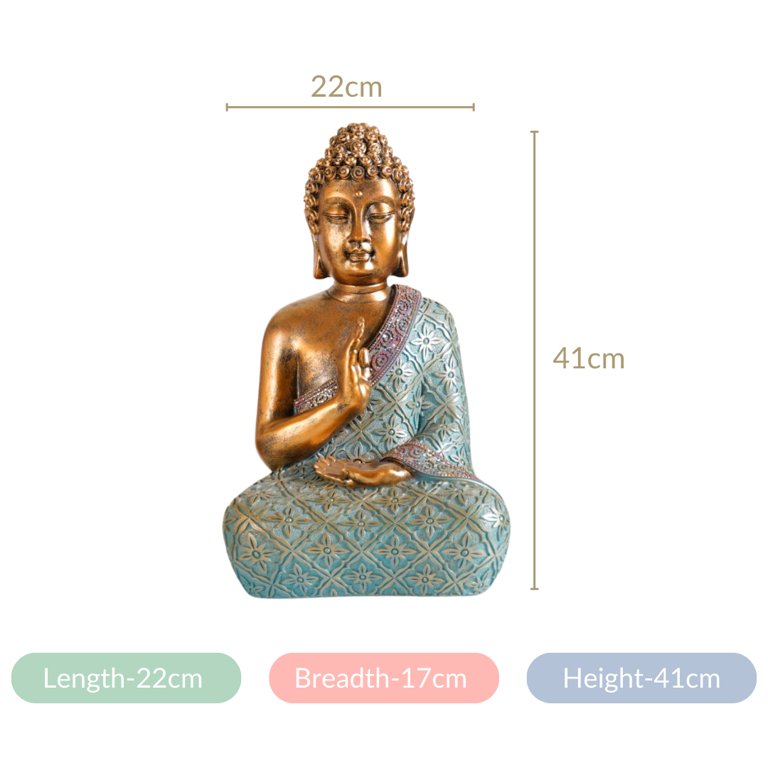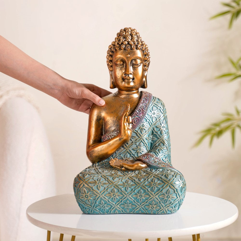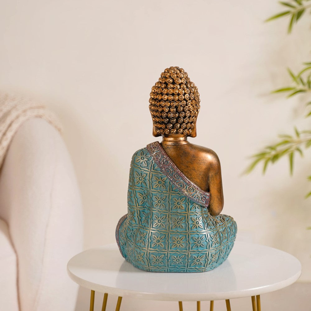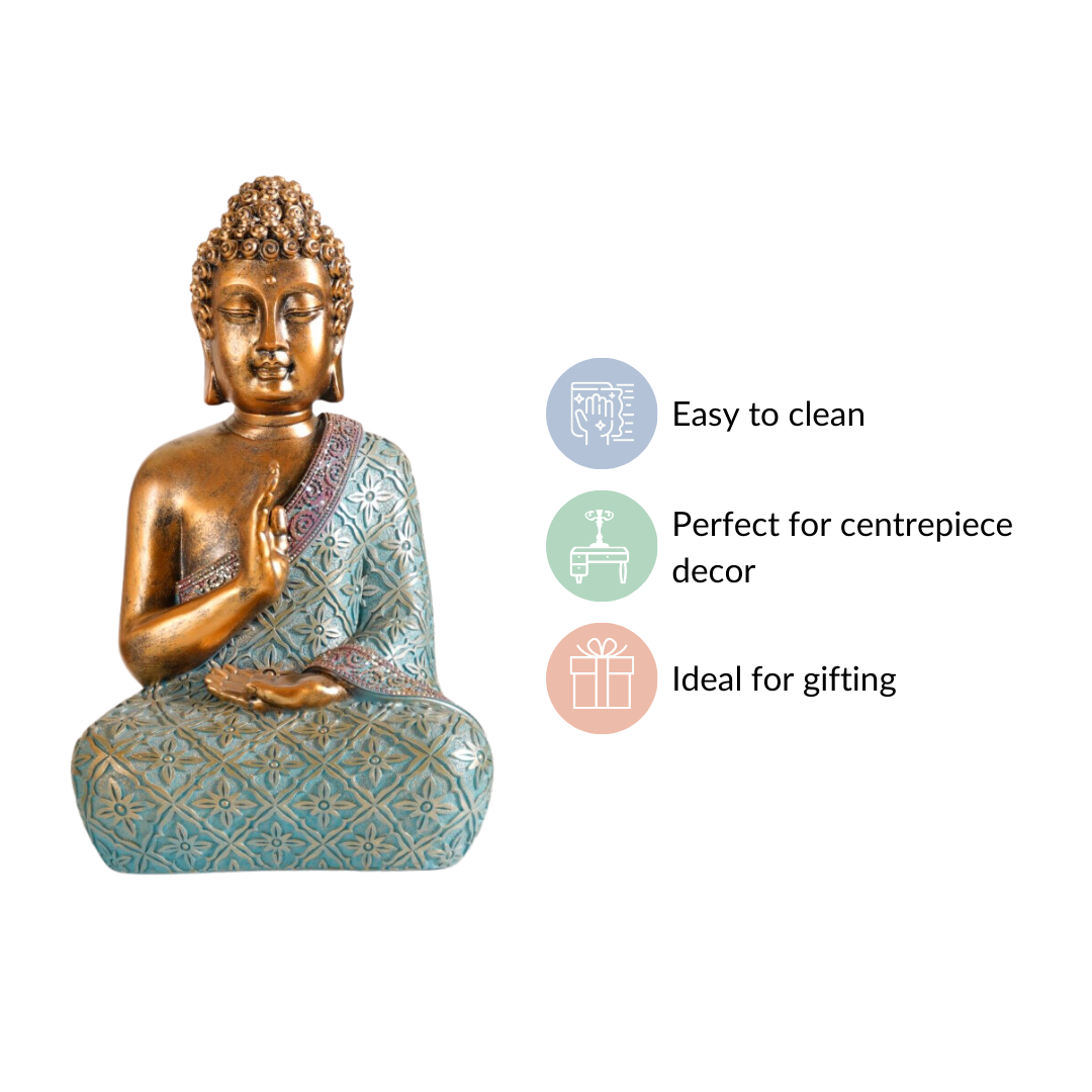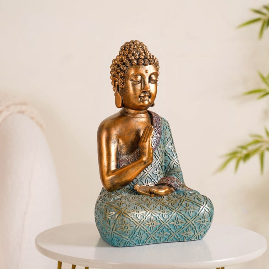 This Sitting Buddha Statue is an opulent addition to your home decor, particularly your living room decor, and it can completely transform the ambience in your home. Furniture pads at its base make this eye-catching decor showpiece strong and sturdy and keep it from slipping off from wherever you want to display it. The showpiece, which features Gautam Buddha wearing a blue patterned robe, was meticulously constructed, making it a perfect option for a centrepiece. This display showpiece has an unmatched level of elegance because of its gold finish.