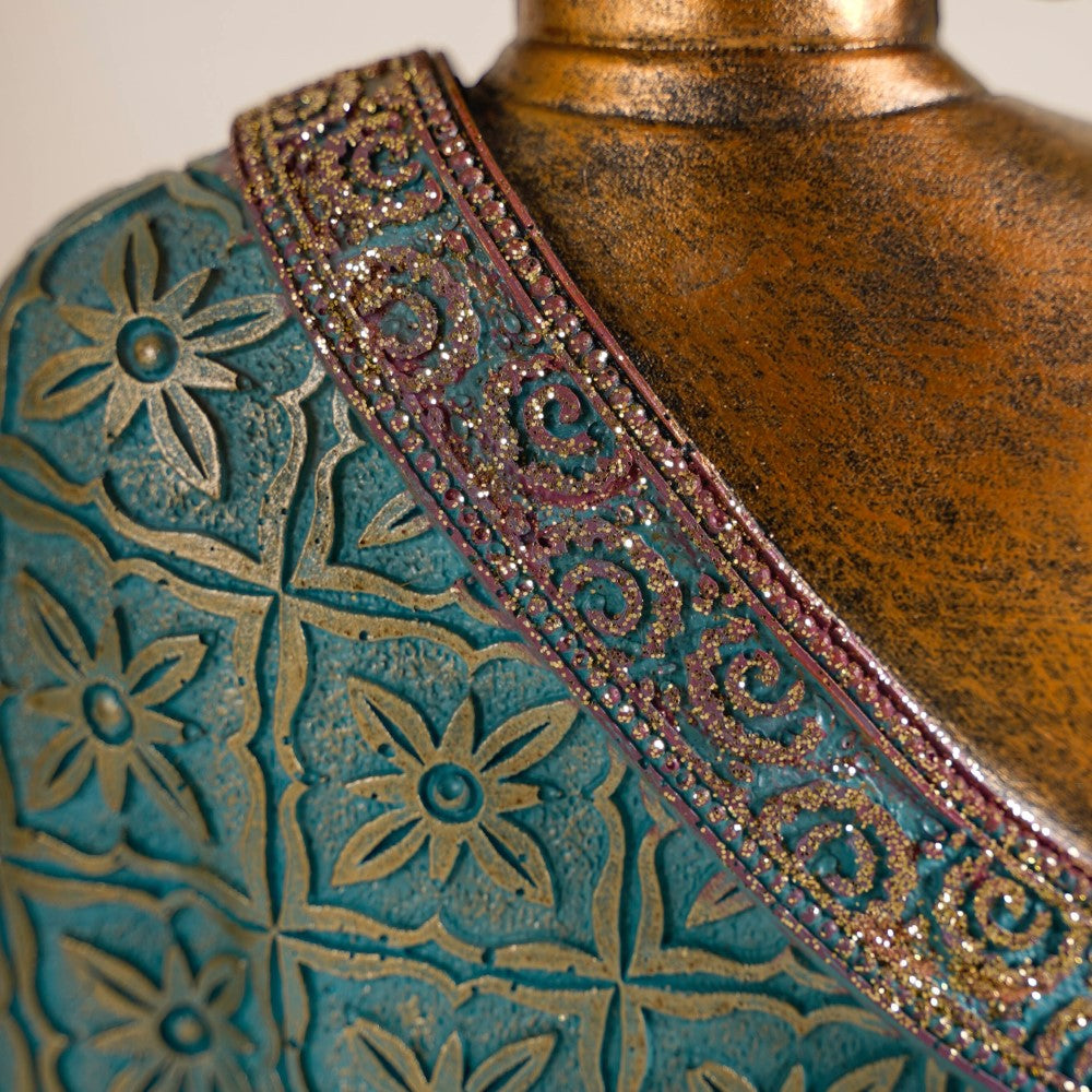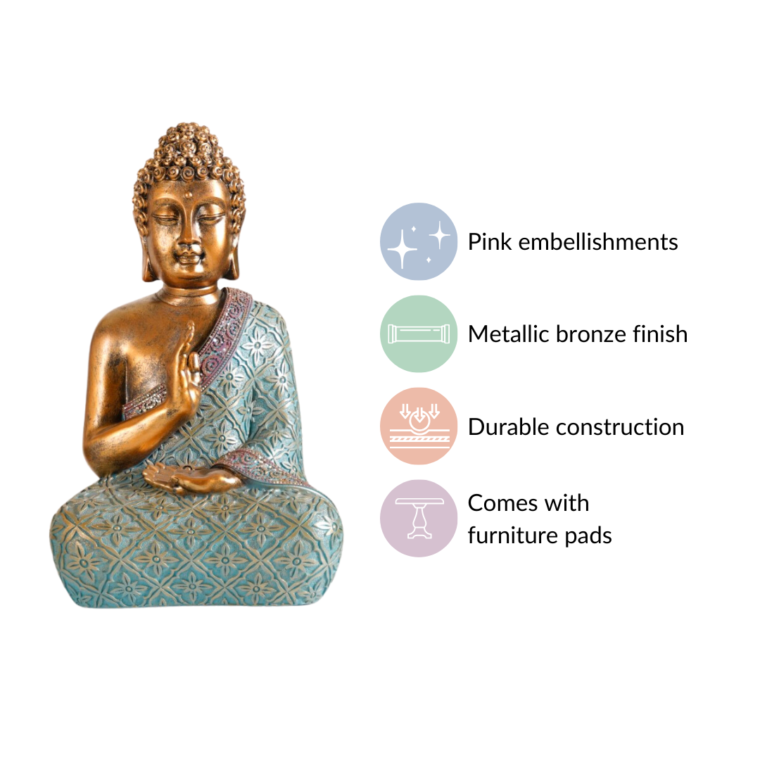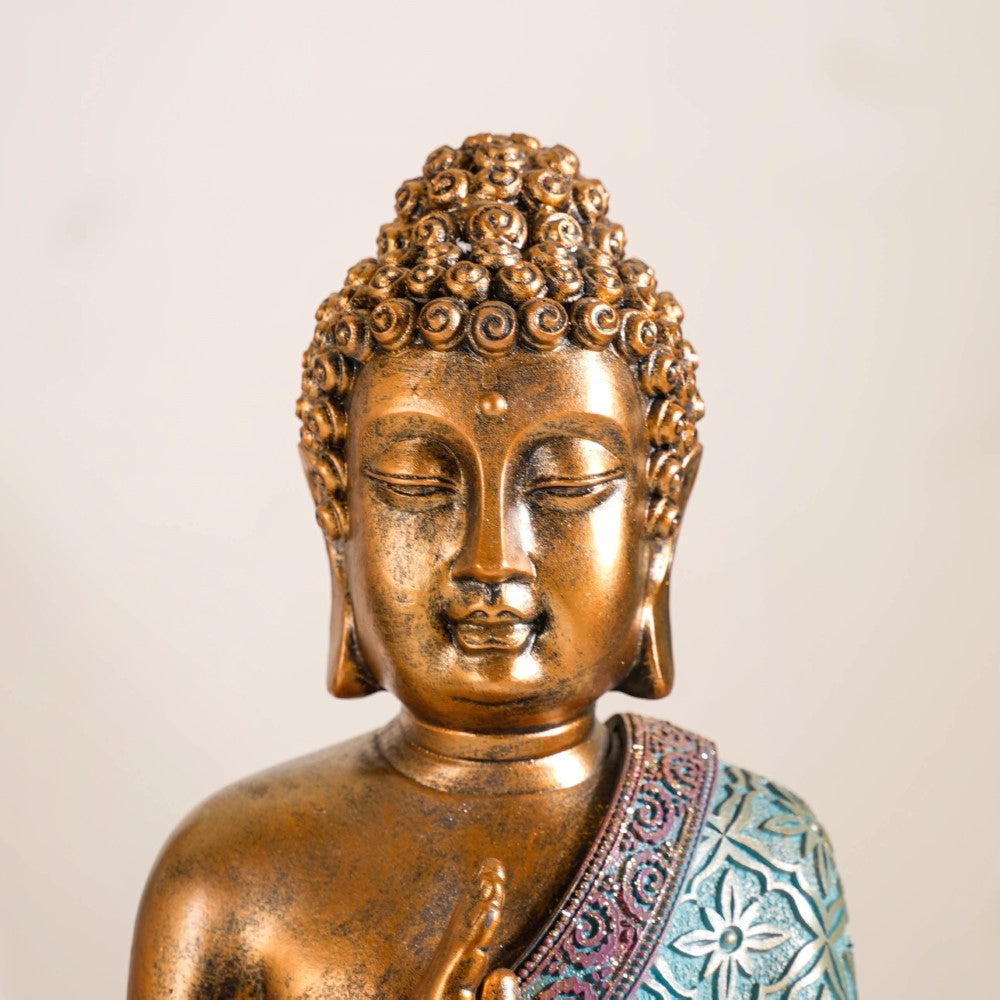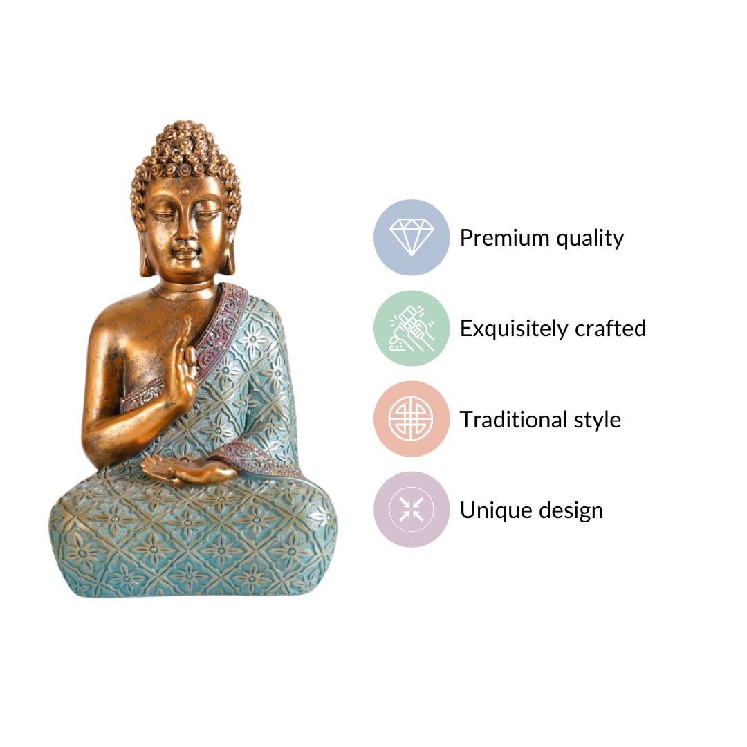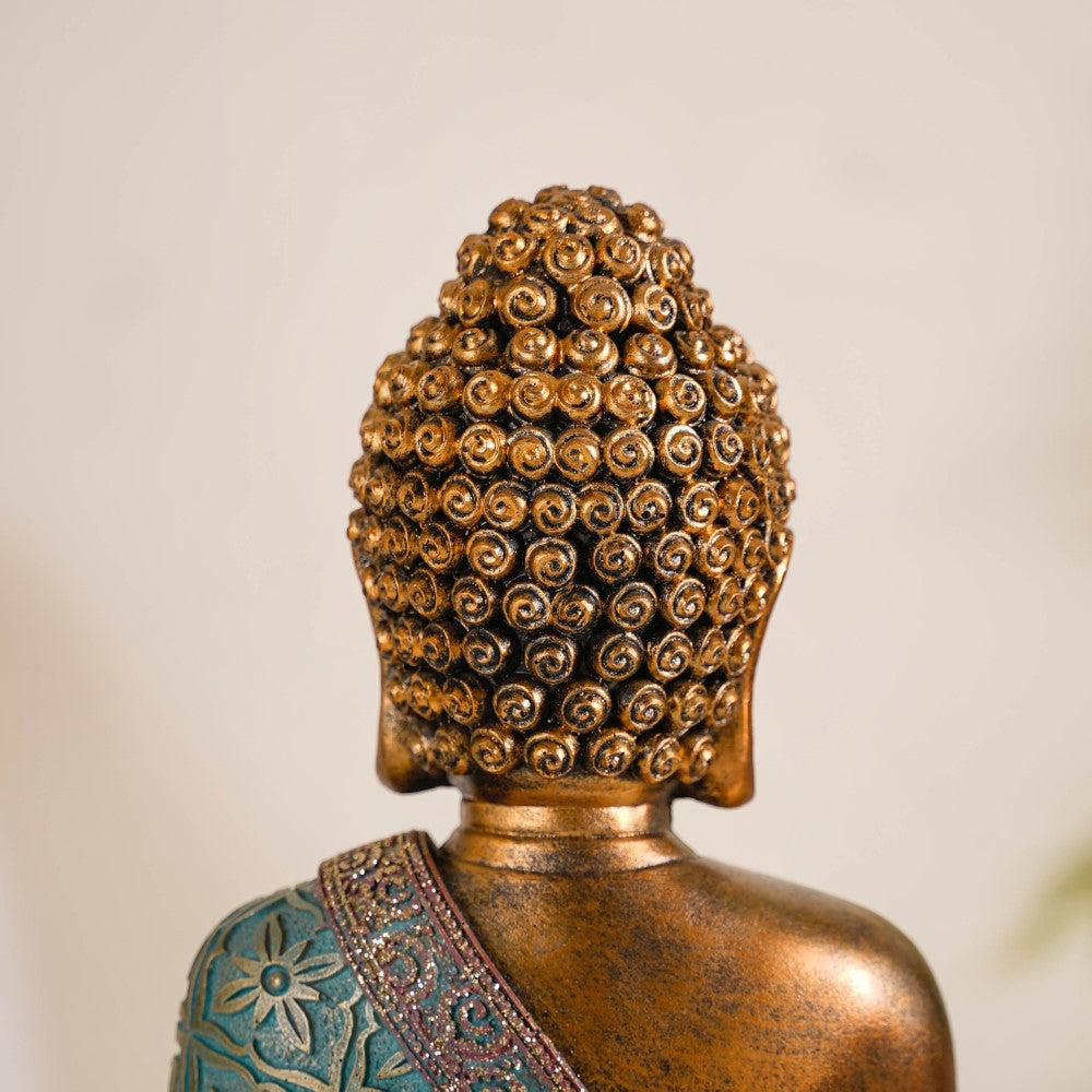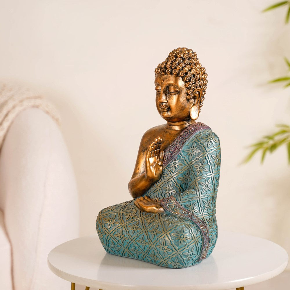 This Sitting Buddha Statue is an opulent addition to your home decor, particularly your living room decor, and it can completely transform the ambience in your home. Furniture pads at its base make this eye-catching decor showpiece strong and sturdy and keep it from slipping off from wherever you want to display it. The showpiece, which features Gautam Buddha wearing a blue patterned robe, was meticulously constructed, making it a perfect option for a centrepiece. This display showpiece has an unmatched level of elegance because of its gold finish.