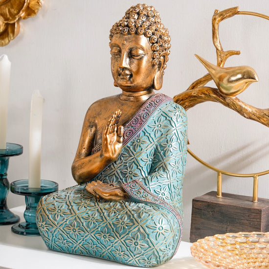 This Sitting Buddha Statue is an opulent addition to your home decor, particularly your living room decor, and it can completely transform the ambience in your home. Furniture pads at its base make this eye-catching decor showpiece strong and sturdy and keep it from slipping off from wherever you want to display it. The showpiece, which features Gautam Buddha wearing a blue patterned robe, was meticulously constructed, making it a perfect option for a centrepiece. This display showpiece has an unmatched level of elegance because of its gold finish.
