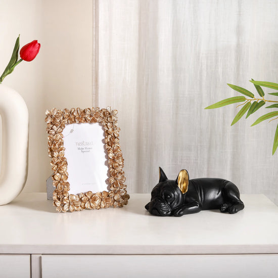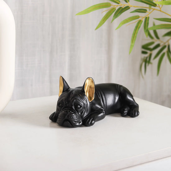 Capture the essence of the beloved bulldog breed with our exquisite showpiece, portraying it in a graceful and relaxed lying-down pose. Meticulously crafted from high-quality resin, this decor piece boasts a sleek black hue complemented by intricately detailed ears finished in opulent gold. The lifelike craftsmanship masterfully accentuates the bulldog's unique traits, from its robust physique to its expressive countenance. The captivating interplay between the black body and luxurious gold ears adds a touch of elegance to its design, rendering it a truly remarkable accent that commands attention in any setting.