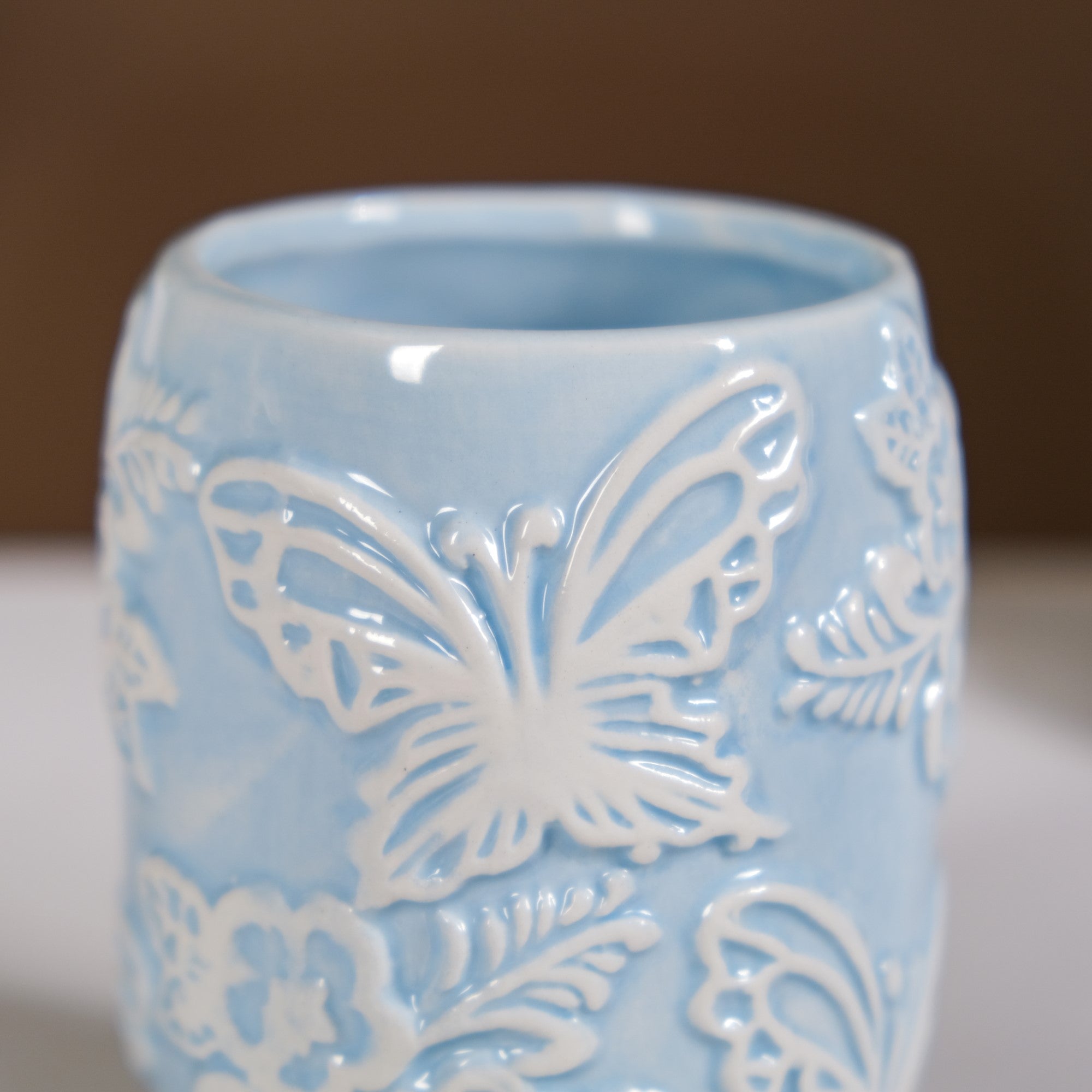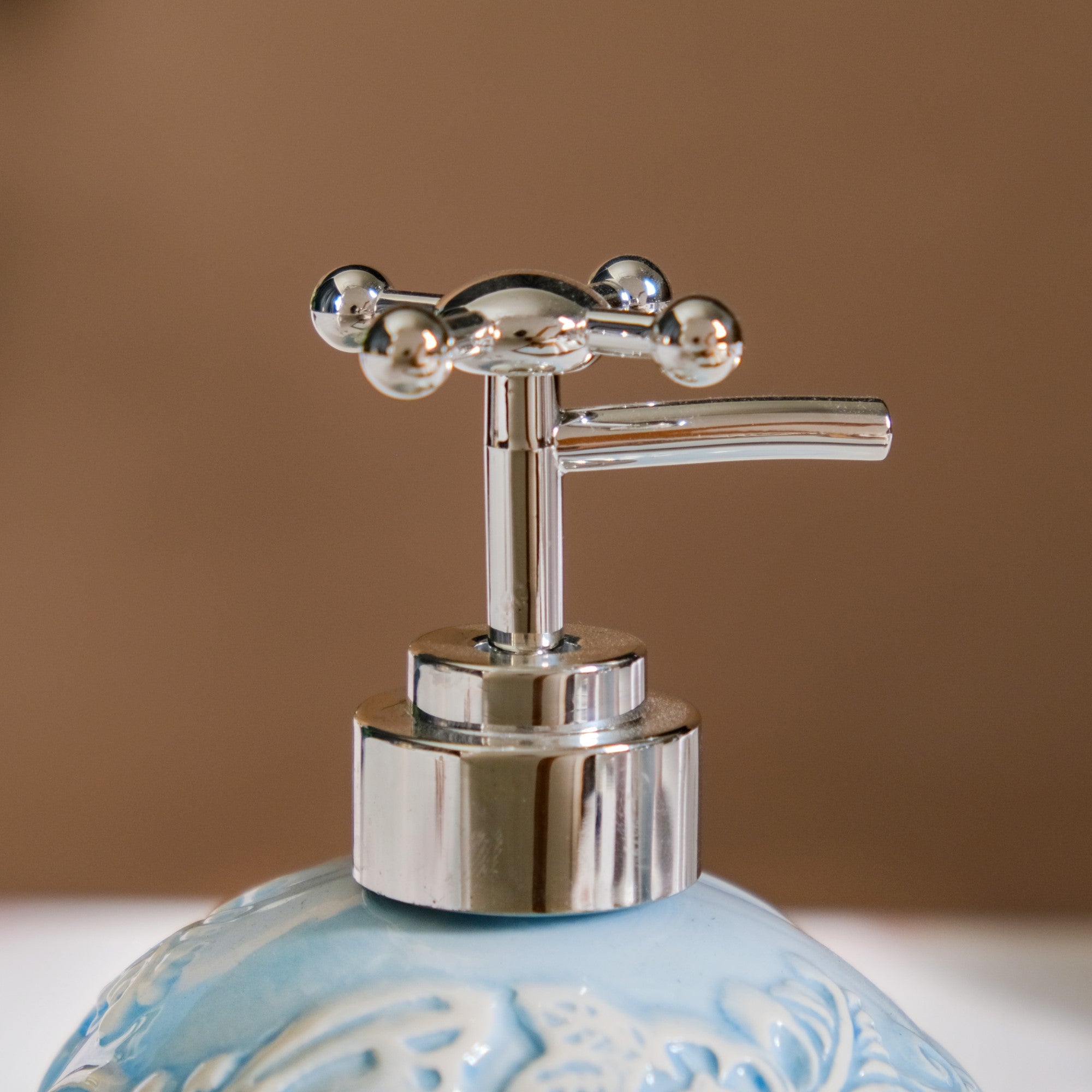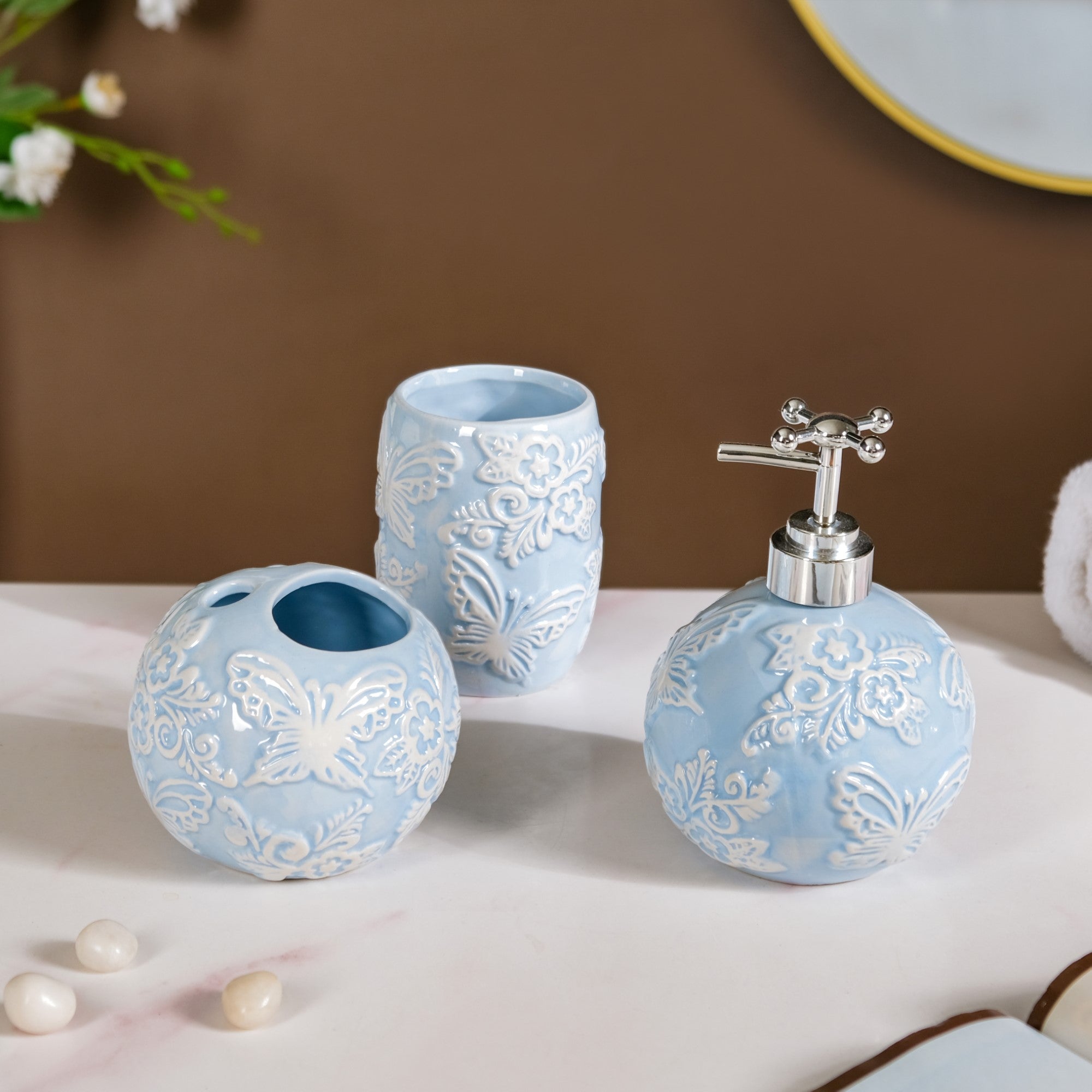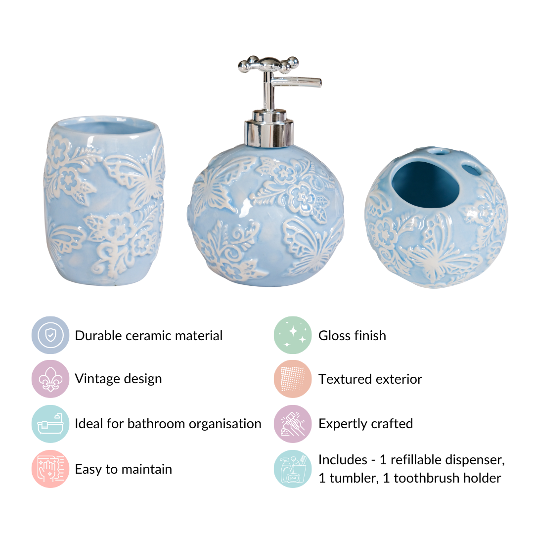 The set consists of a refillable soap dispenser, a tumbler, and a toothbrush holder. Each component is crafted from durable ceramic material, featuring a smooth gloss finish, textured exterior, and expert craftsmanship. This bath set is not just functional but also adds a touch of sophistication to your bathroom decor.