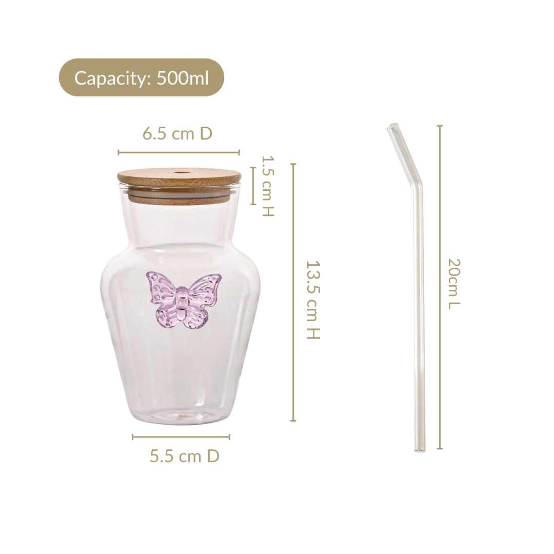 Benefits: The smooth exterior provides a comfortable and secure grip during use. The flared top allows easier sipping and pouring. The butterfly detail adds a touch of charm that enhances table presentation and makes the set suitable for gifting. The bamboo lids help keep drinks covered and reduce exposure to dust, while the silicone gaskets create a tighter seal that limits accidental spills. The reusable glass straws enable eco-friendly drinking and pair well with a variety of cold beverages.
